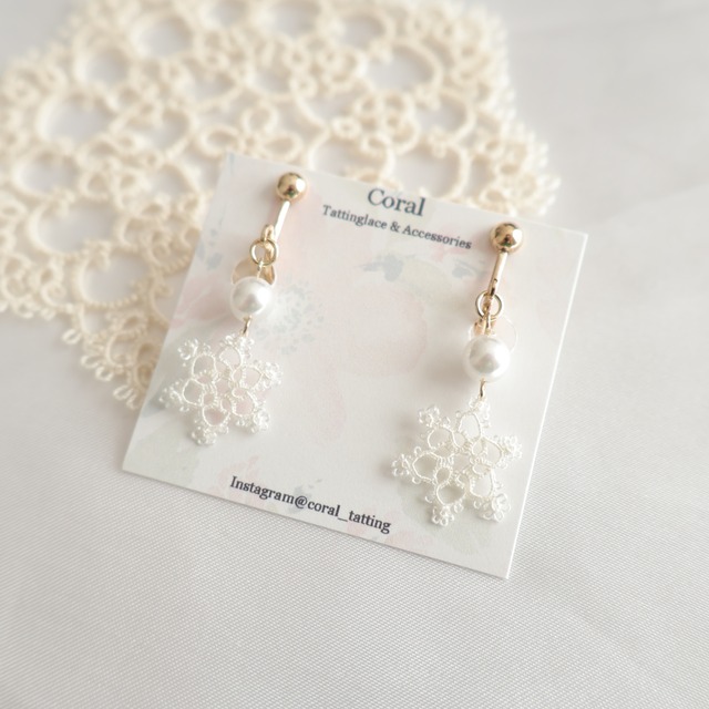 可憐なタティングレースのpierce/earring 極細の糸で結った雪の結晶モチーフはとても繊細で可憐な印象に 手編みの雪の結晶モチーフは大きさ約1.5cmと指先に乗る程の小ささ とても軽い付け心地をお楽しみください 全て手作業で一つ一つ製作しているため、同じ商品でも多少の違いが出てくるのもハンドメイドの特徴としてお楽しみください。 ______________________________________________ ◇サイズ 長さ:約25mm (長さと幅は、作品の一番飛び出ている部分で計測) モチーフのみのサイズ:15mm