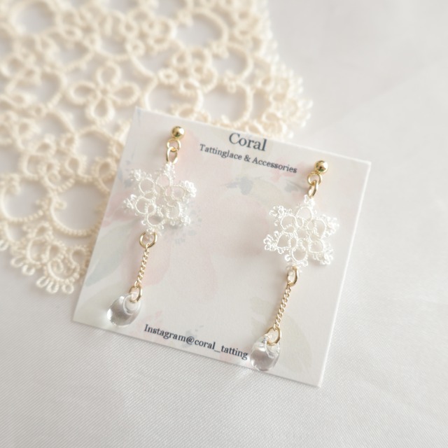 可憐なタティングレースのpierce/earring 極細の糸で結った雪の結晶モチーフはとても繊細で可憐な印象に クリアドロップビーズが静かで澄みきった冬の情景を彩ってくれます 手編みの雪の結晶モチーフは大きさ約1.5cmと指先に乗る程の小ささ とても軽い付け心地をお楽しみください 全て手作業で一つ一つ製作しているため、同じ商品でも多少の違いが出てくるのもハンドメイドの特徴としてお楽しみください。 ______________________________________________ ◇サイズ 長さ:約35mm (長さと幅は、作品の一番飛び出ている部分で計測) モチーフのみのサイズ:15mm