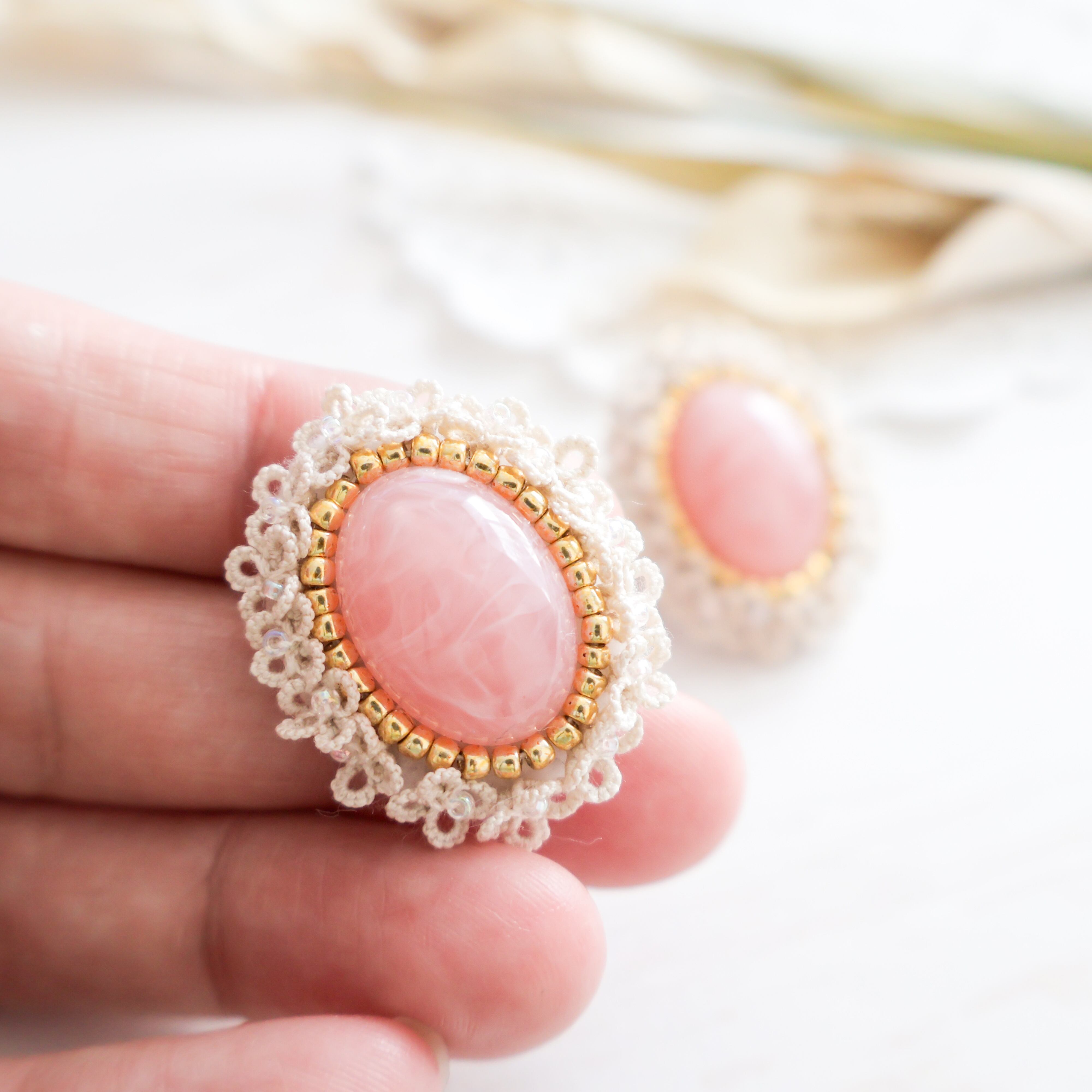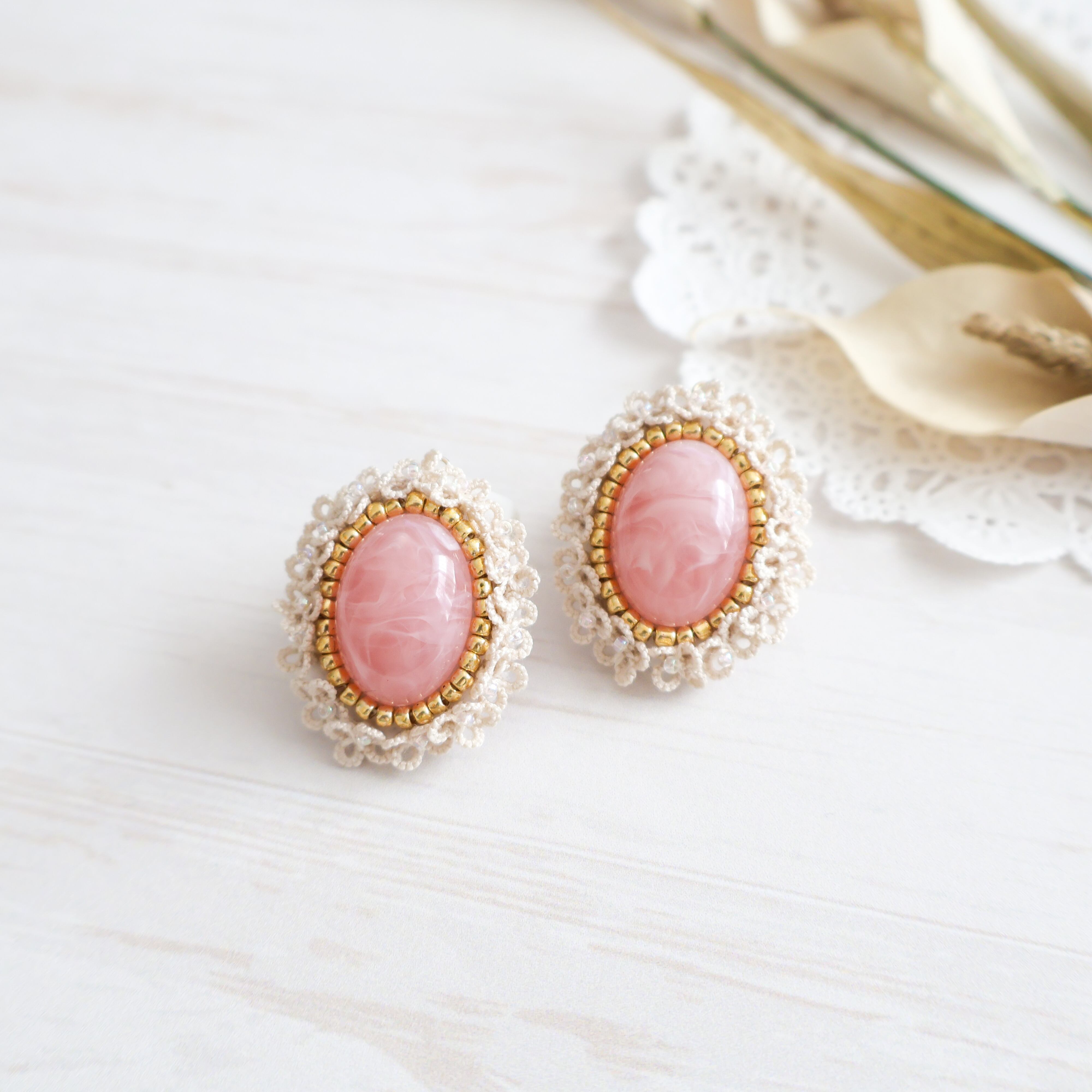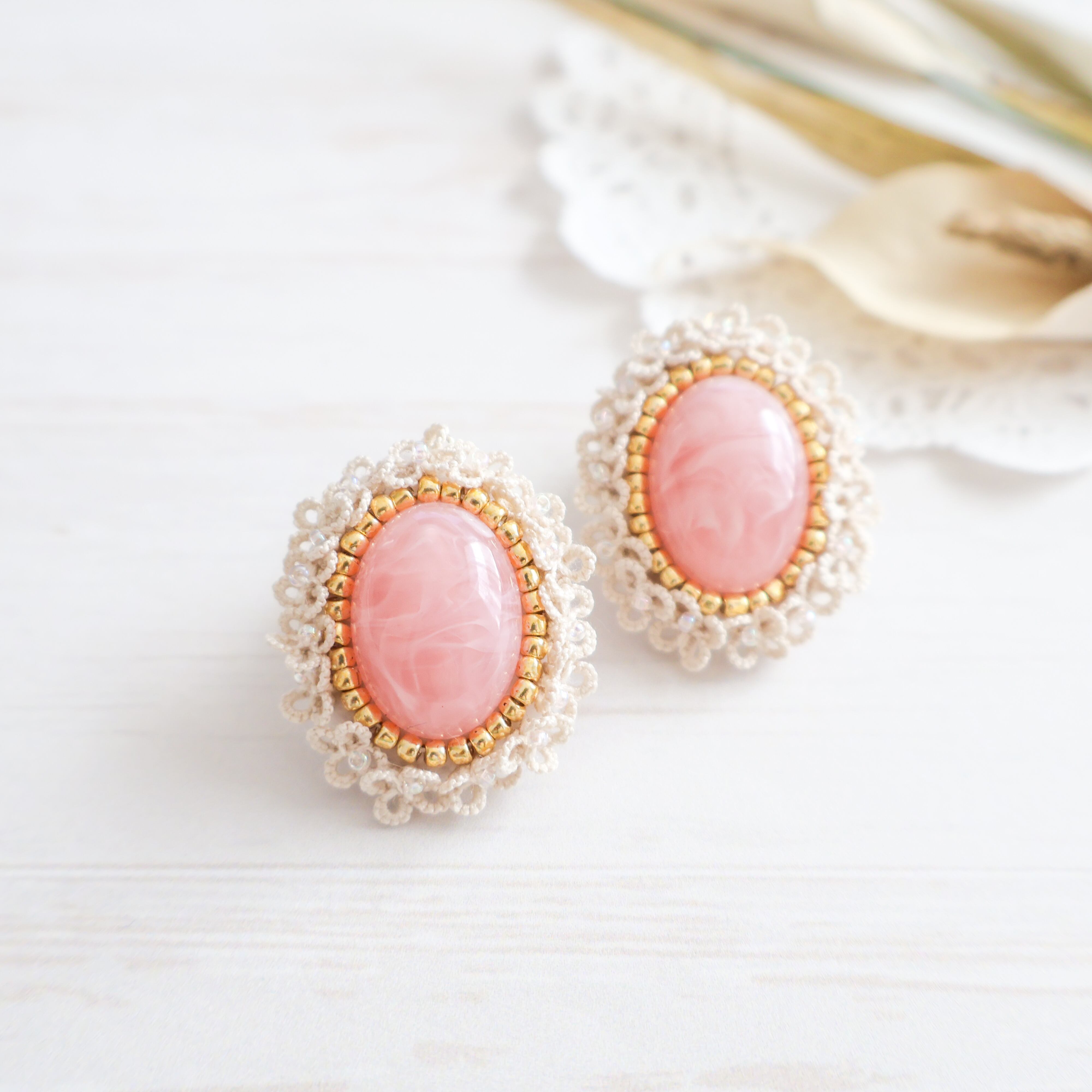 クラシカルな雰囲気漂うタティングレースとカボションが美しいピンクのアクセサリー。