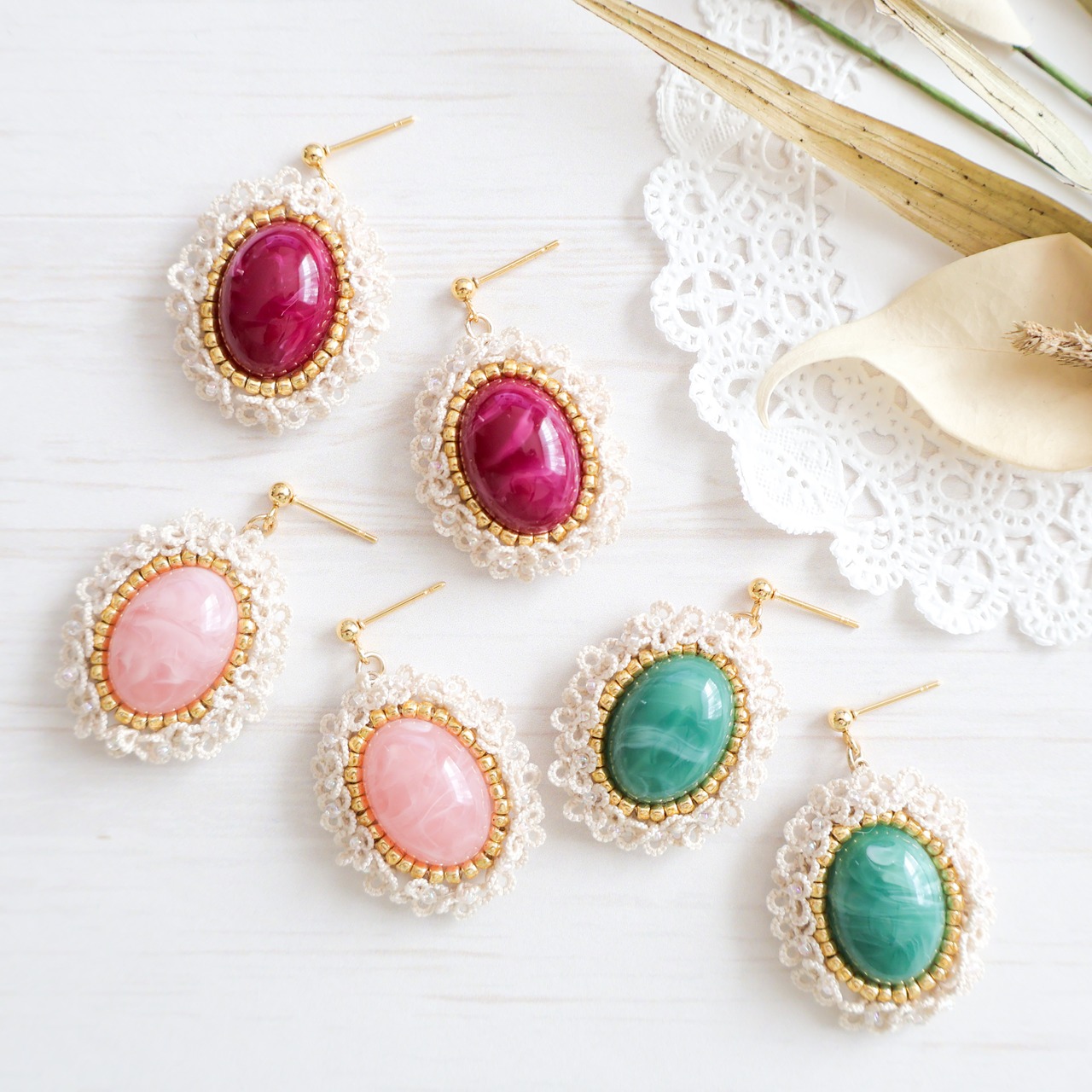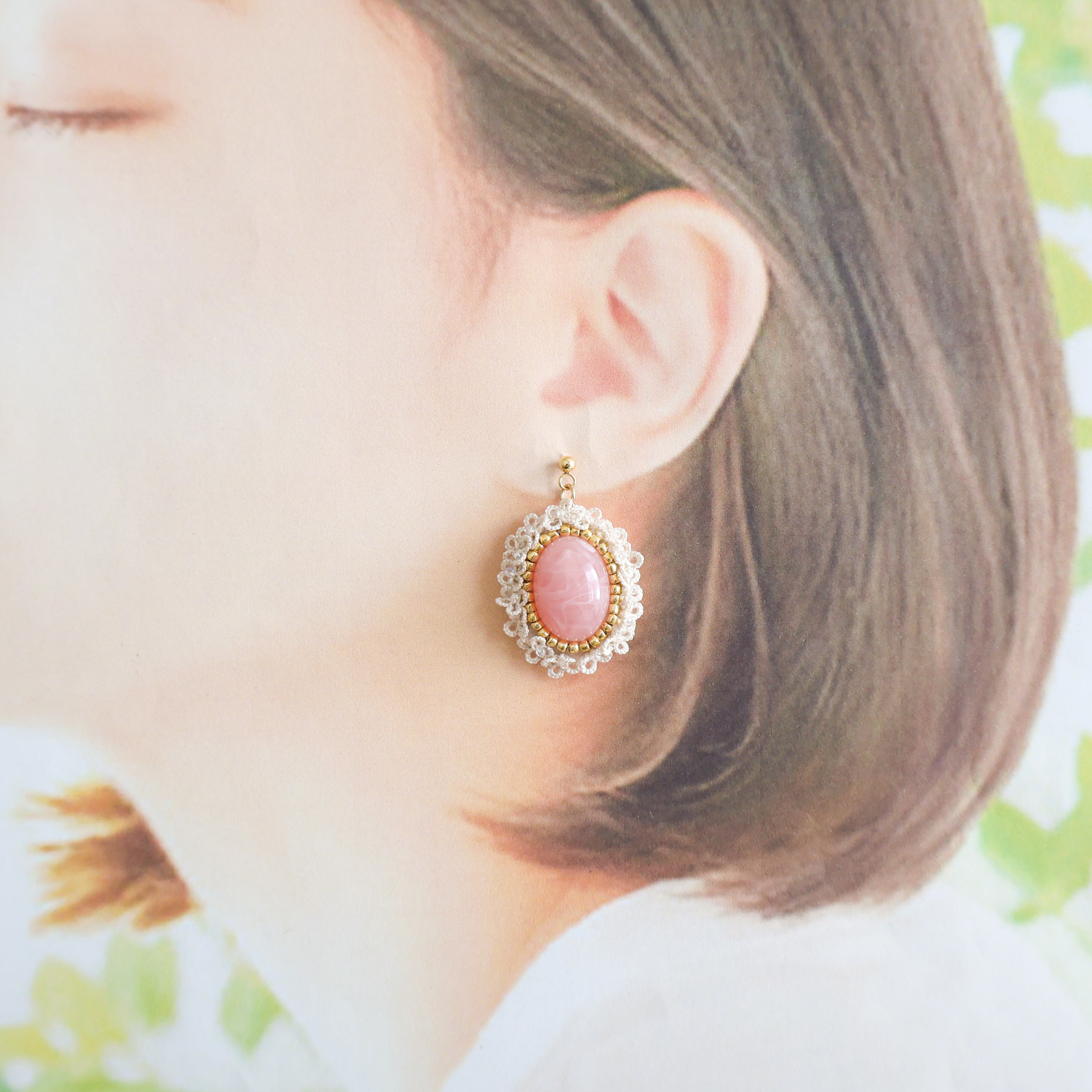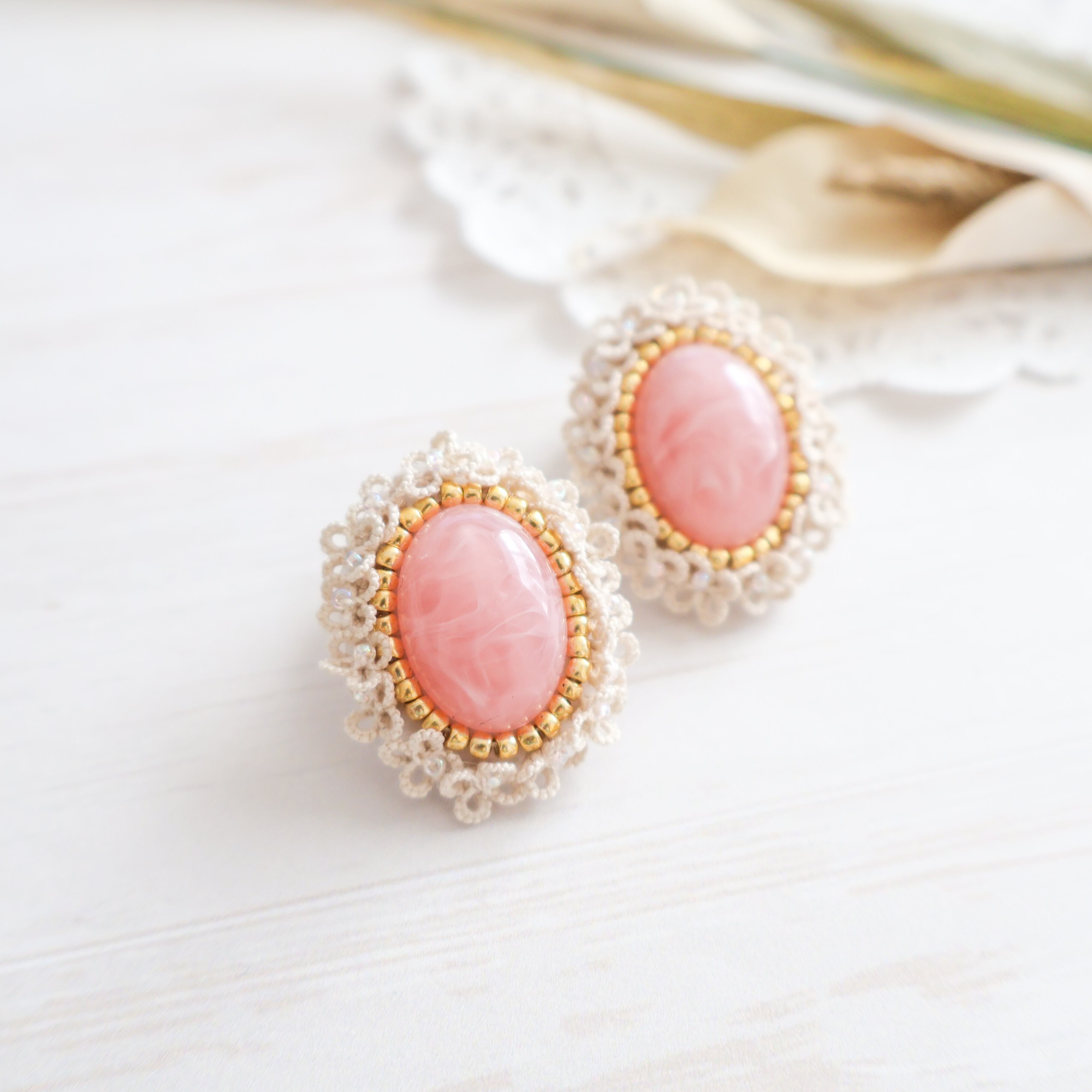 クラシカルな雰囲気漂うタティングレースとカボションが美しいピンクのアクセサリー。
