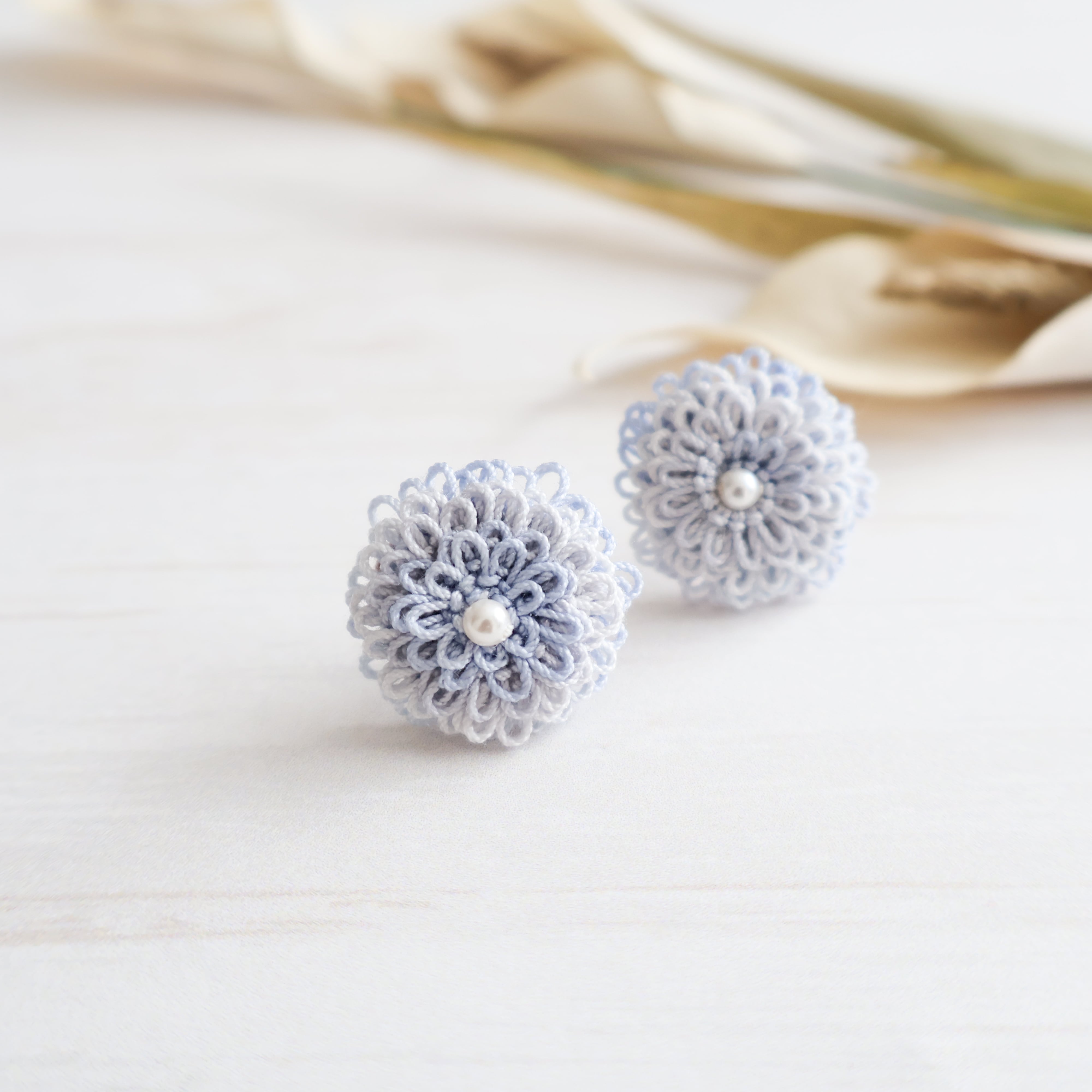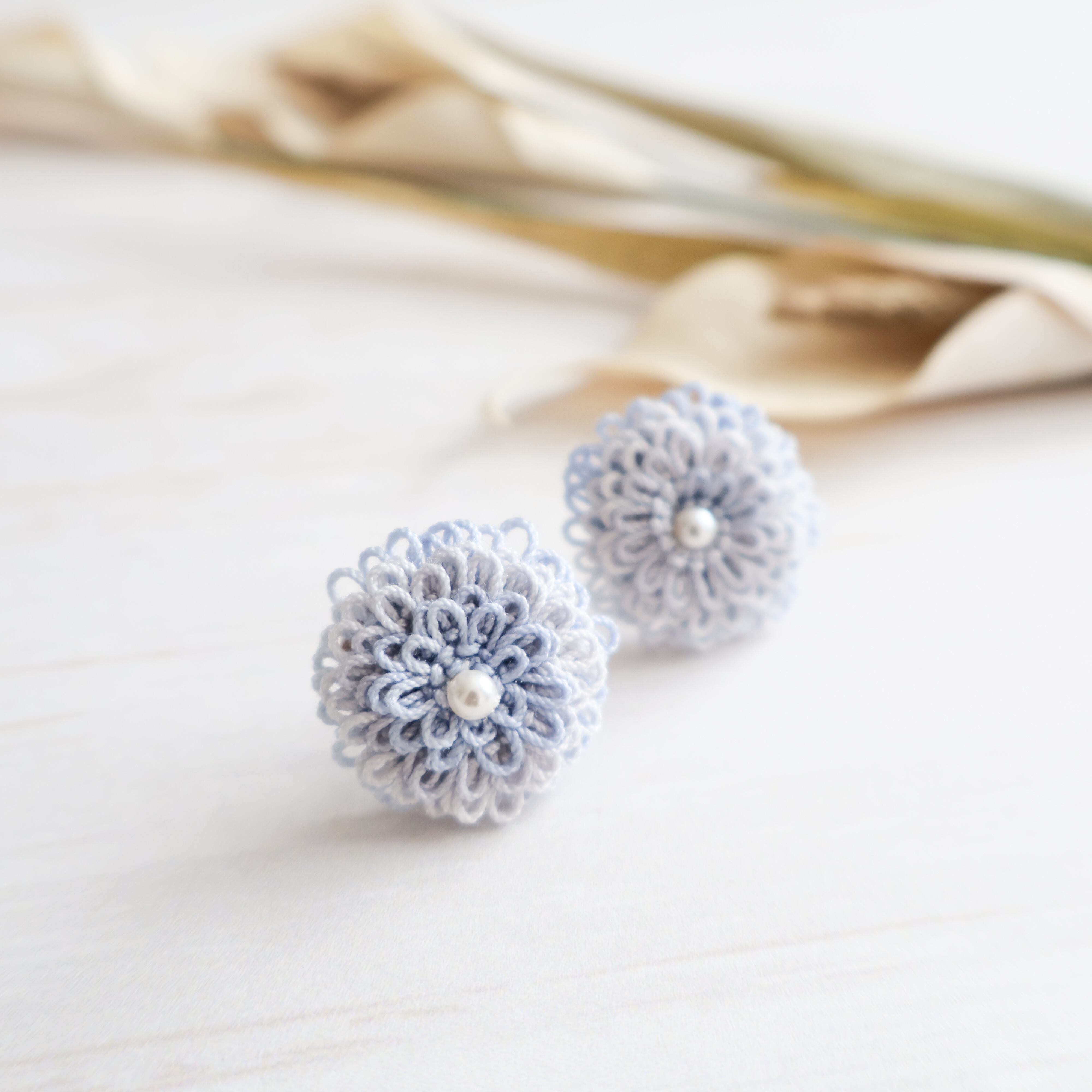 タティングレースは、手作業で糸をくるくると巻いて作る繊細なレース編みで、ピコットと呼ばれる小さな飾り模様は、アクセサリーに独特の優雅さを与えてくれます。