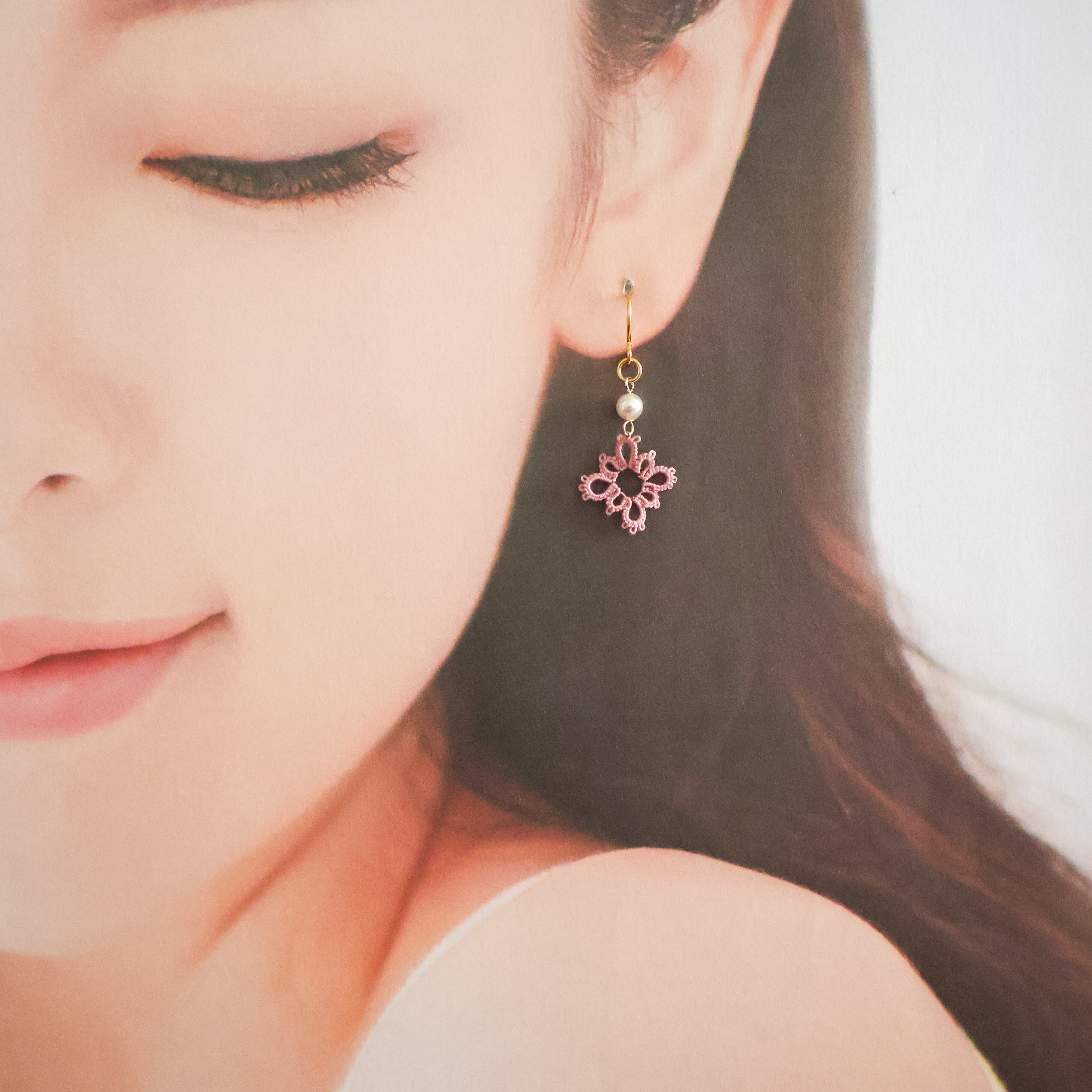タティングレースのひし形のデザインが目を引くピアス/イヤリング。