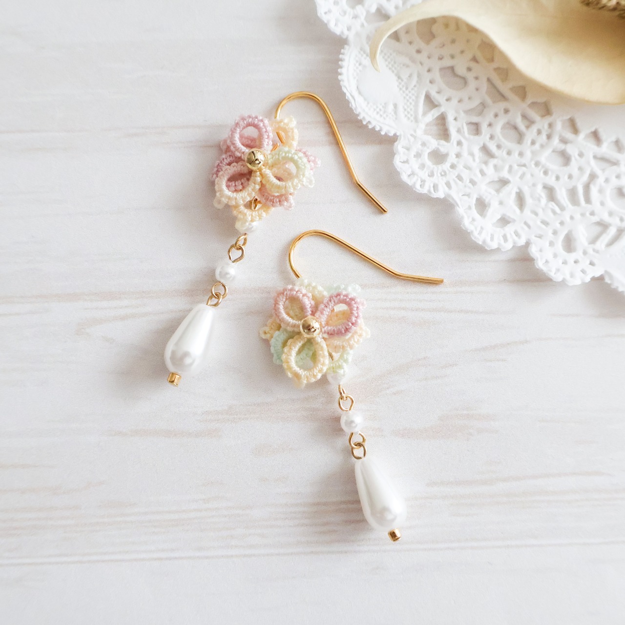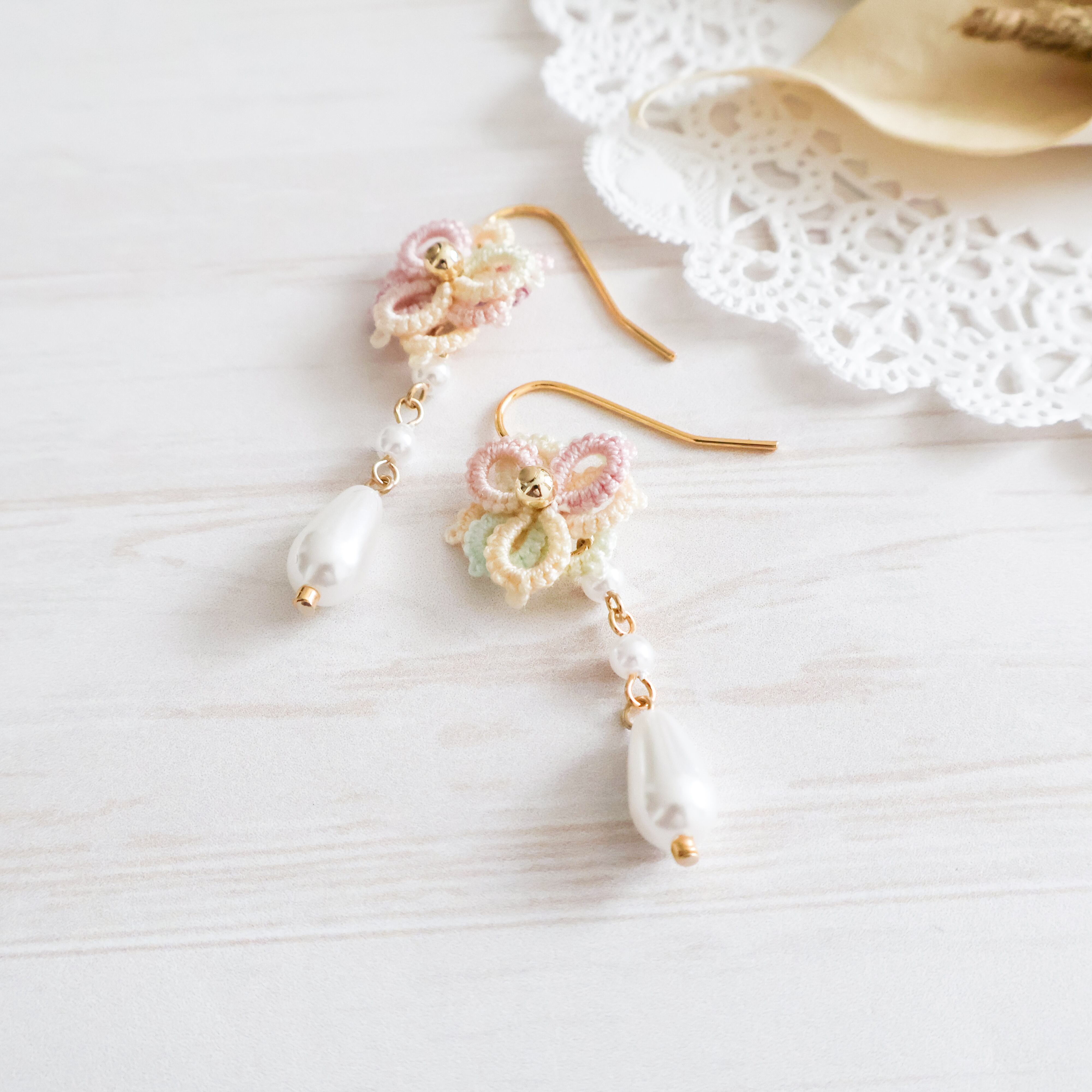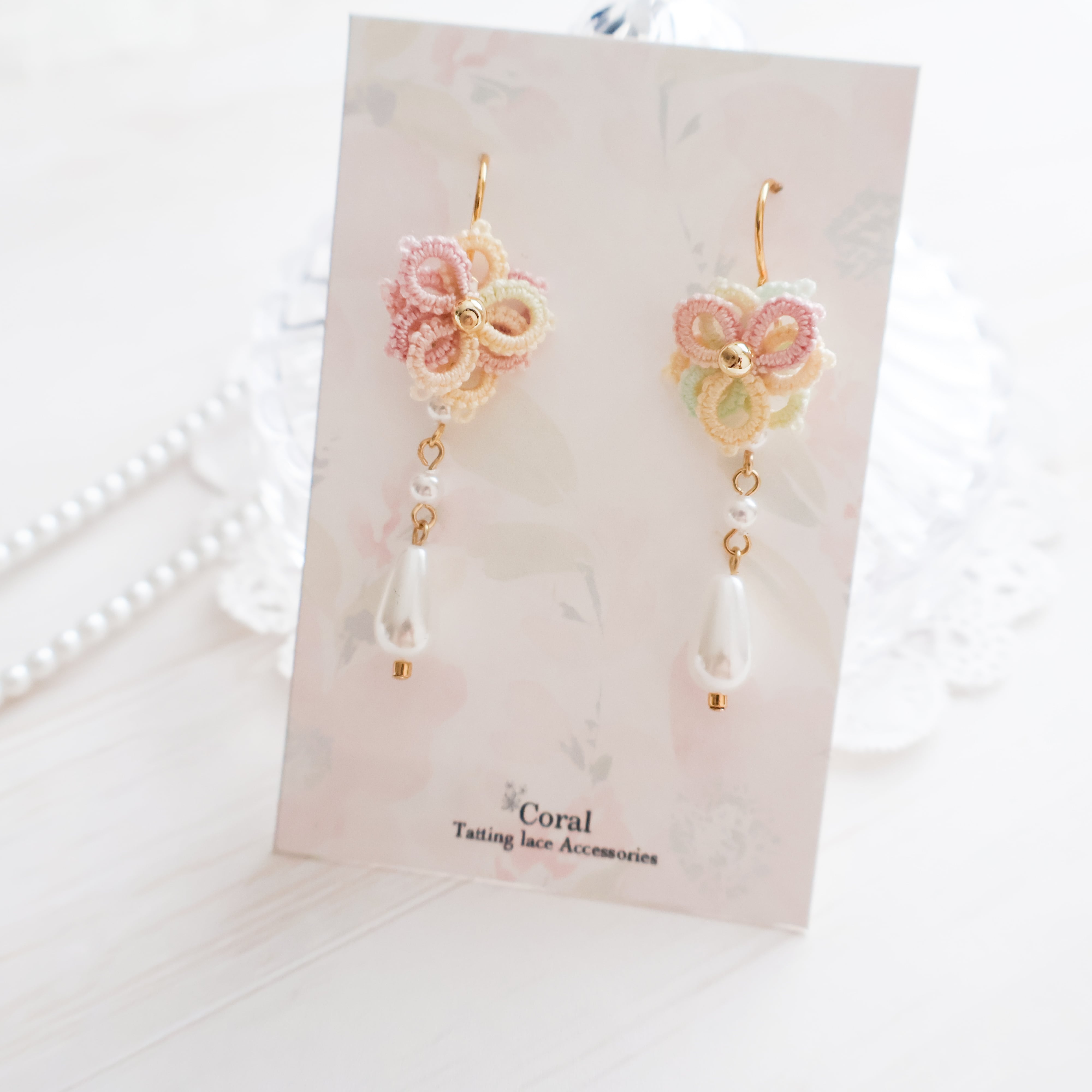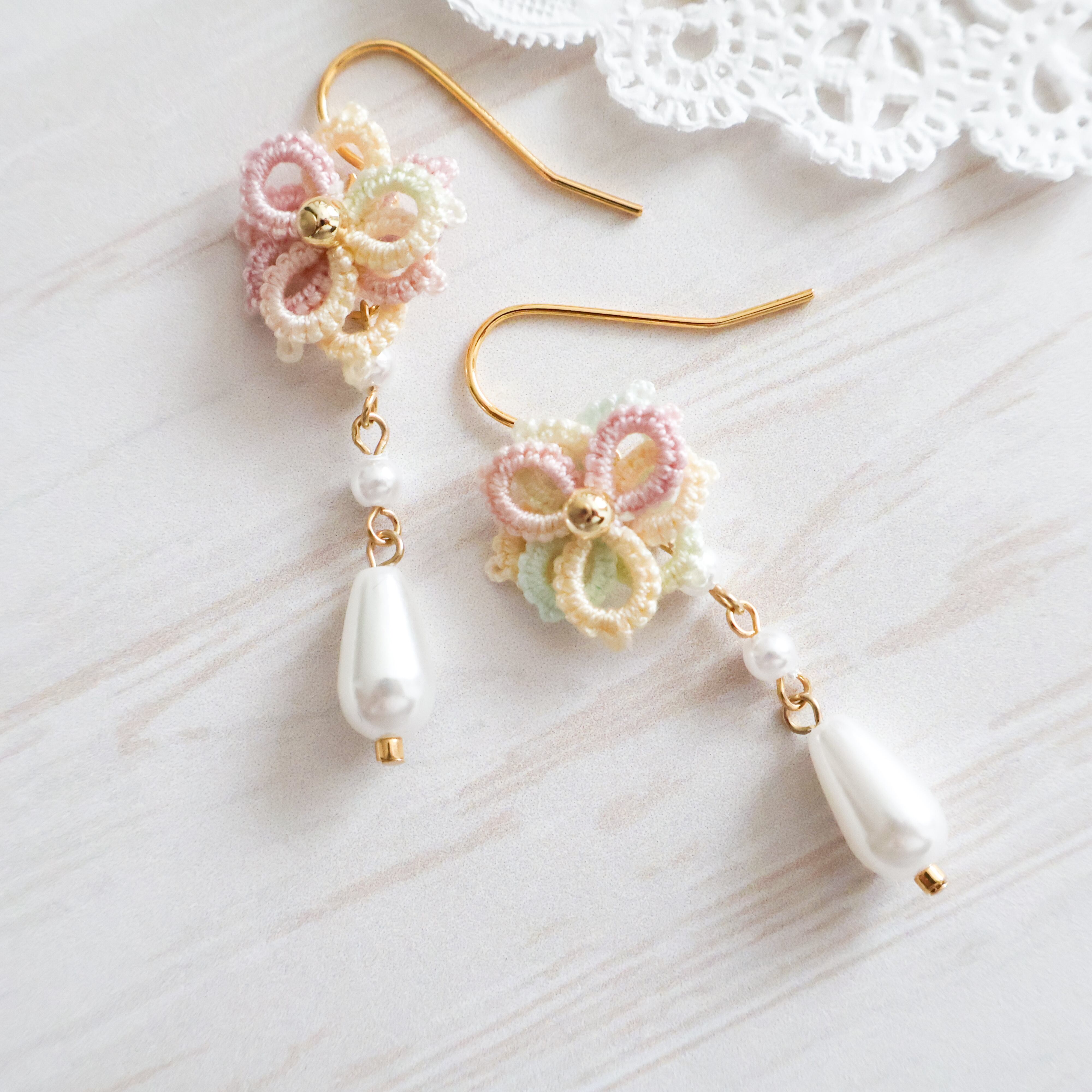 華やかなタティングレースのグラデーションのお花モチーフが耳元を彩ります。
