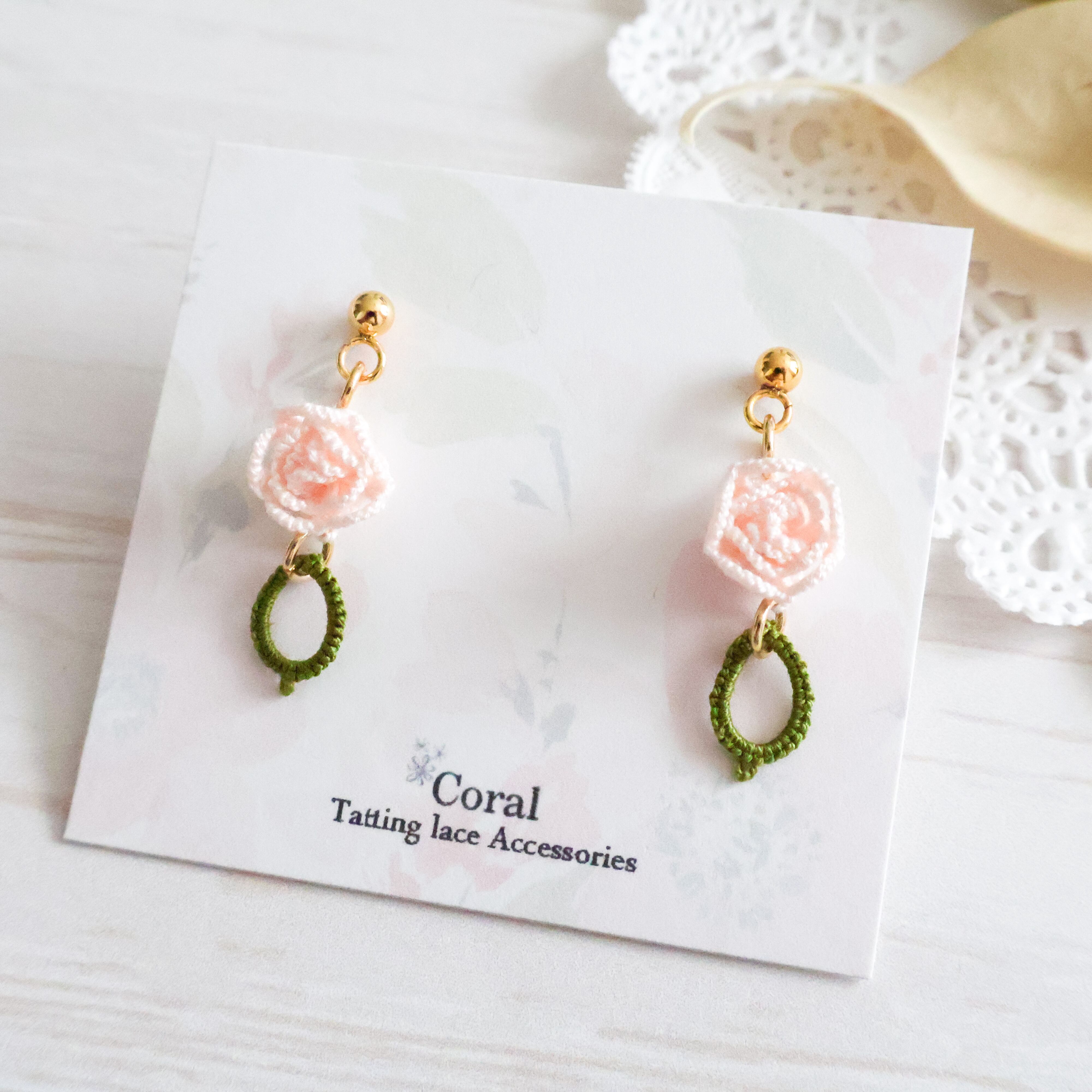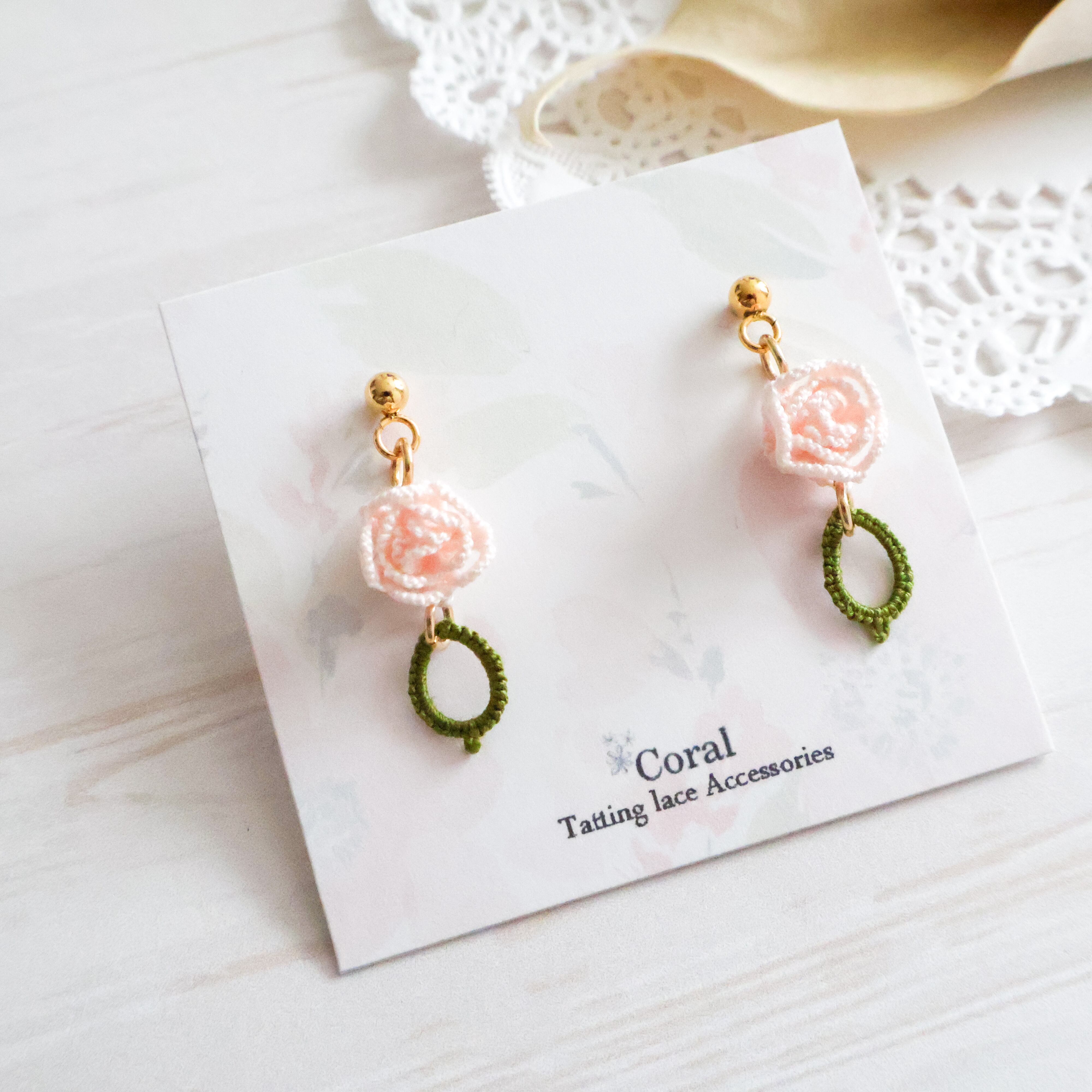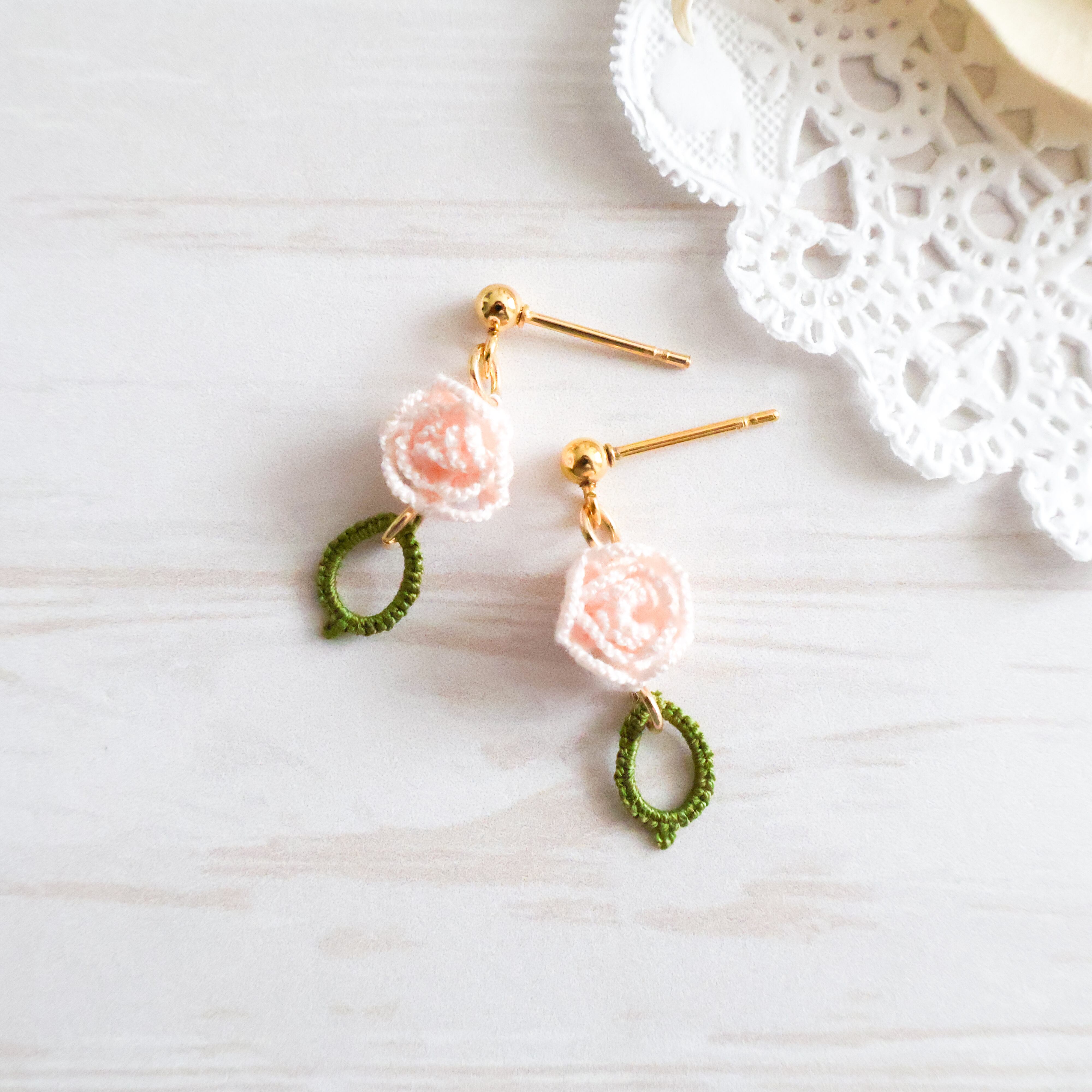 タティングレースで繊細に作られた薔薇モチーフのピアス/イヤリング。