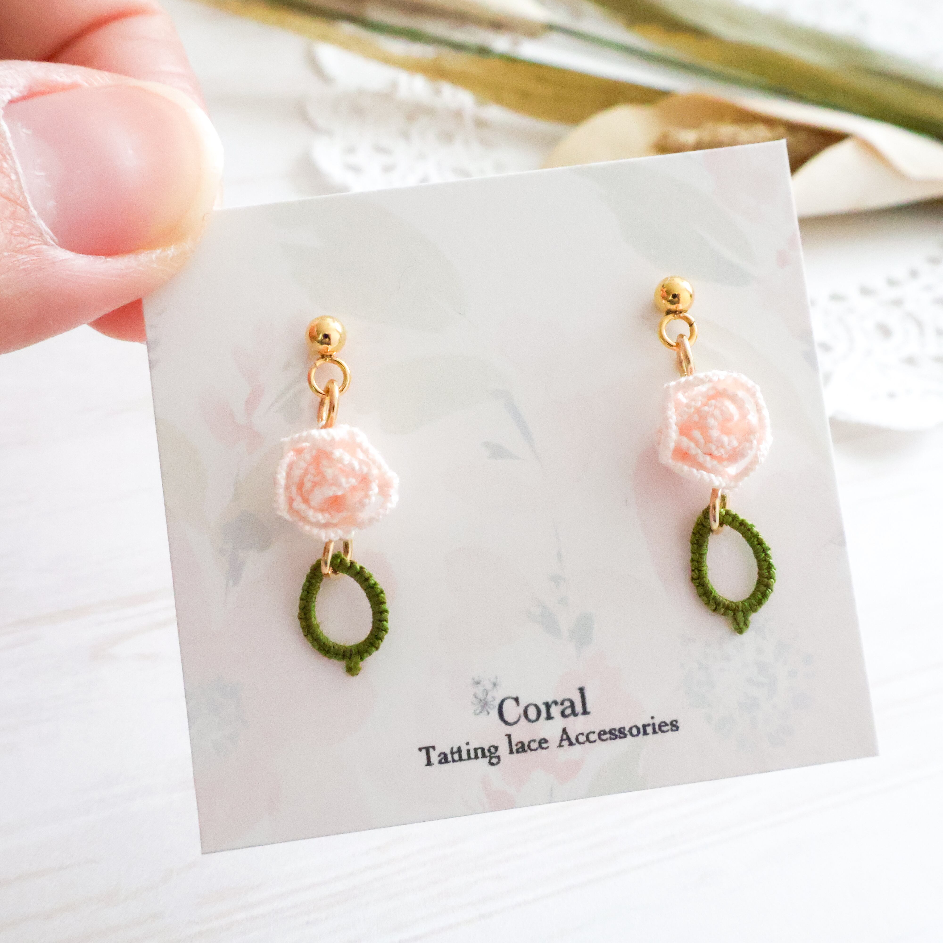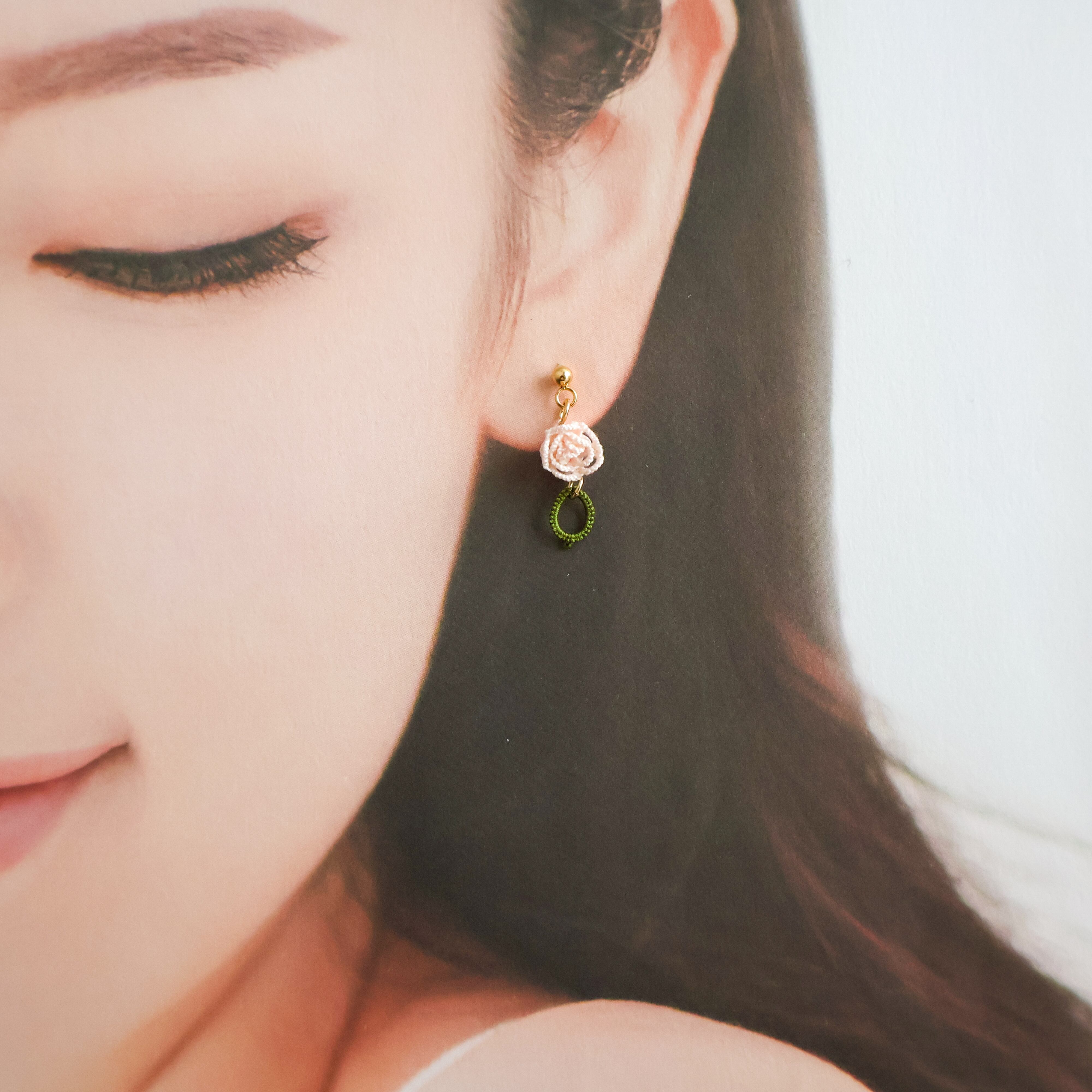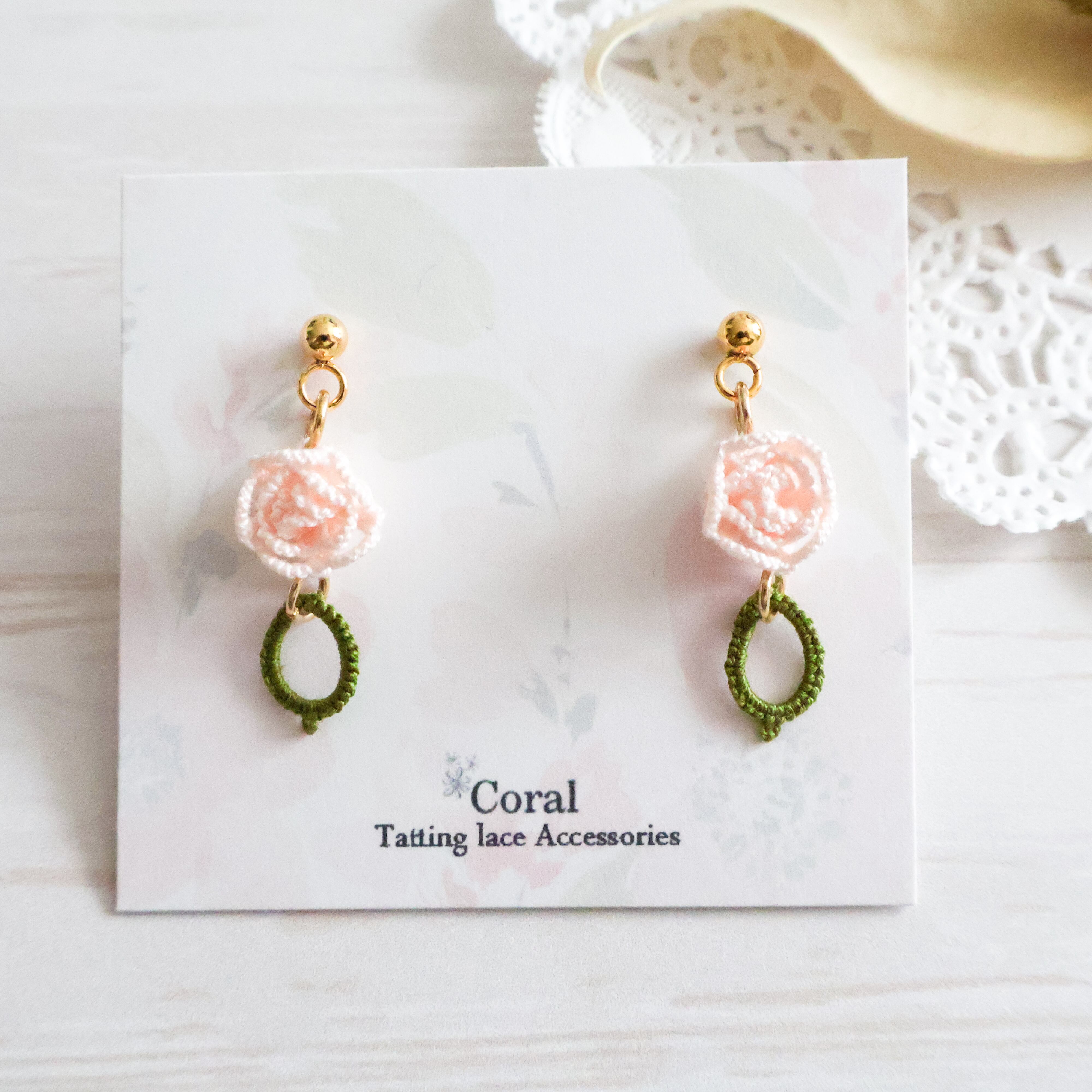 タティングレースで繊細に作られた薔薇モチーフのピアス/イヤリング。