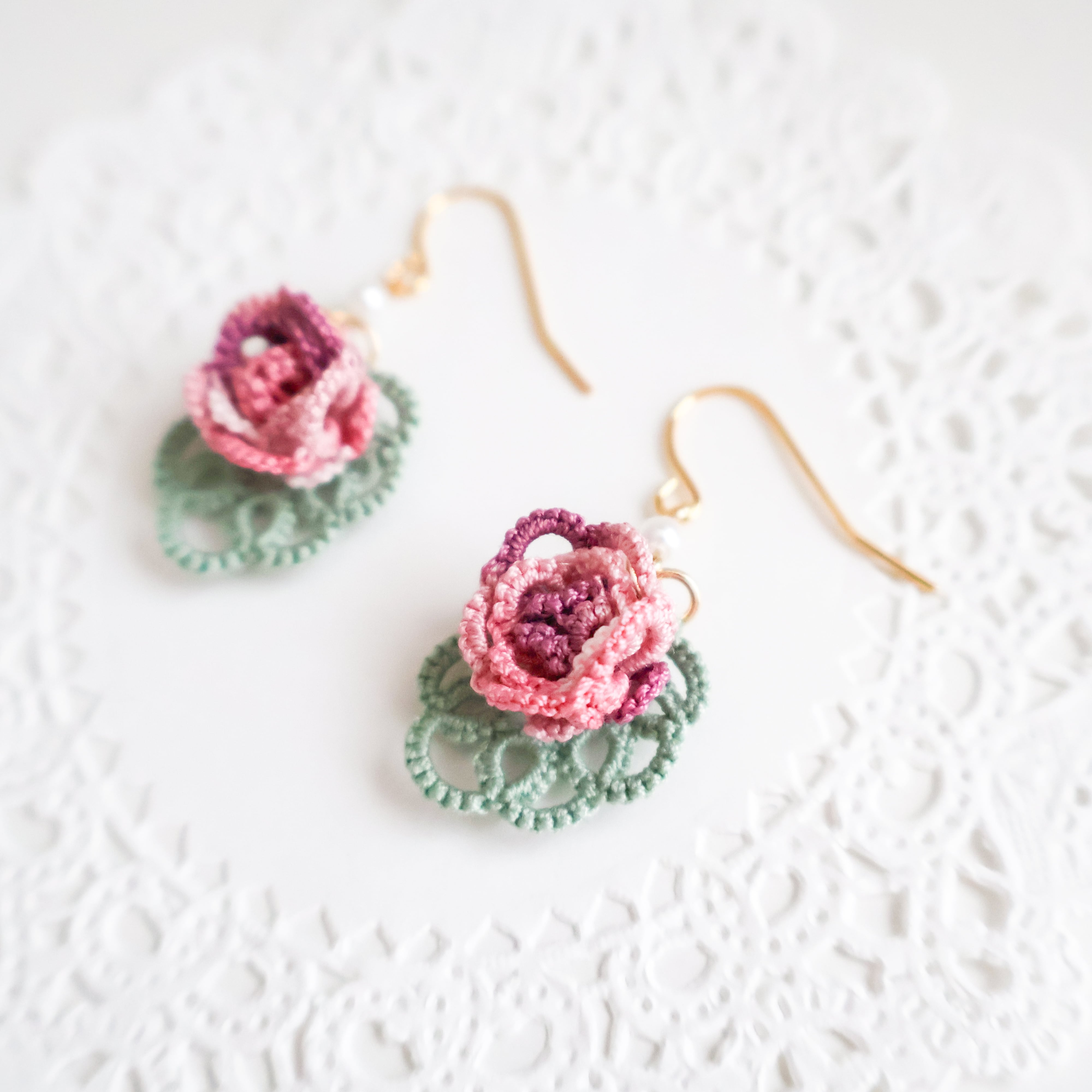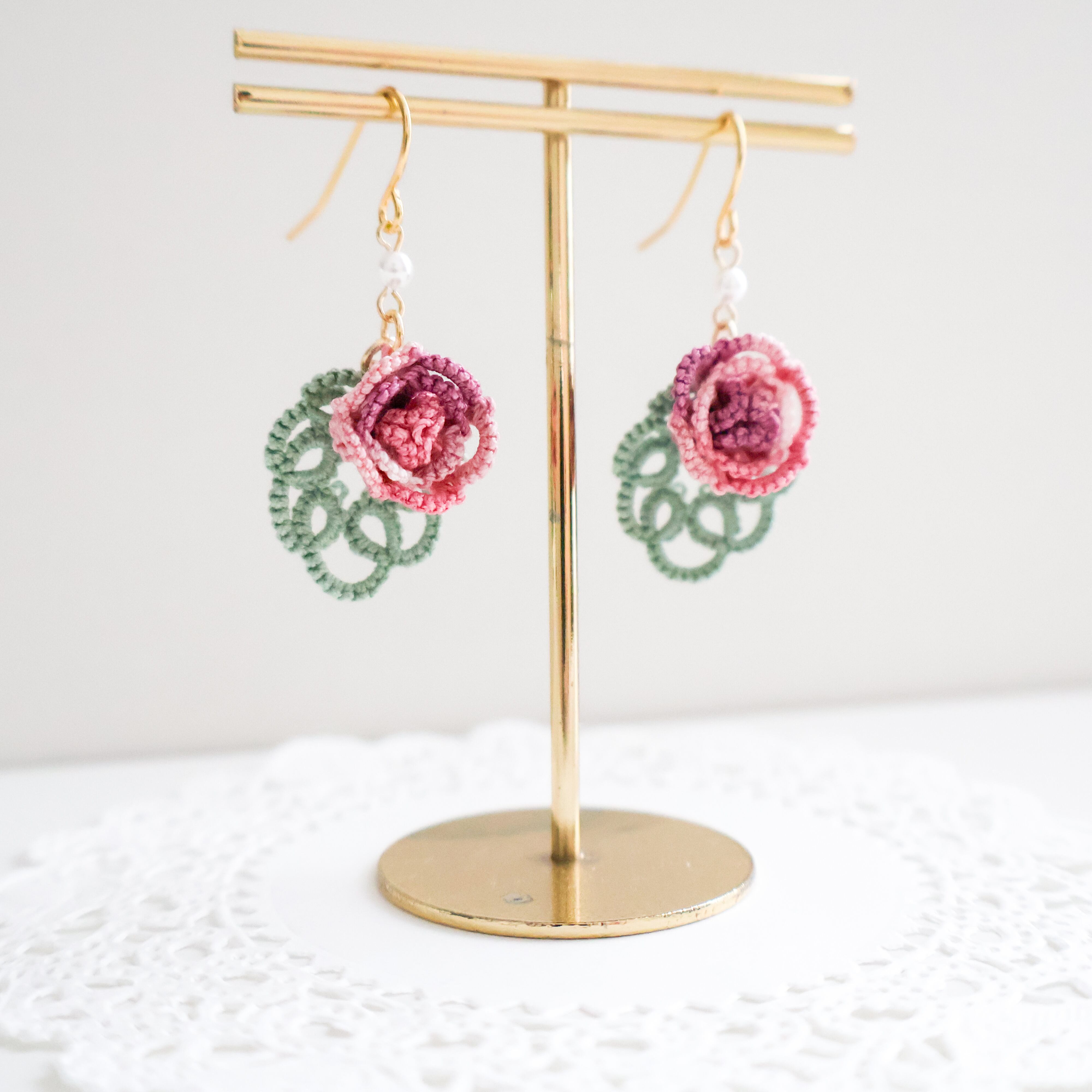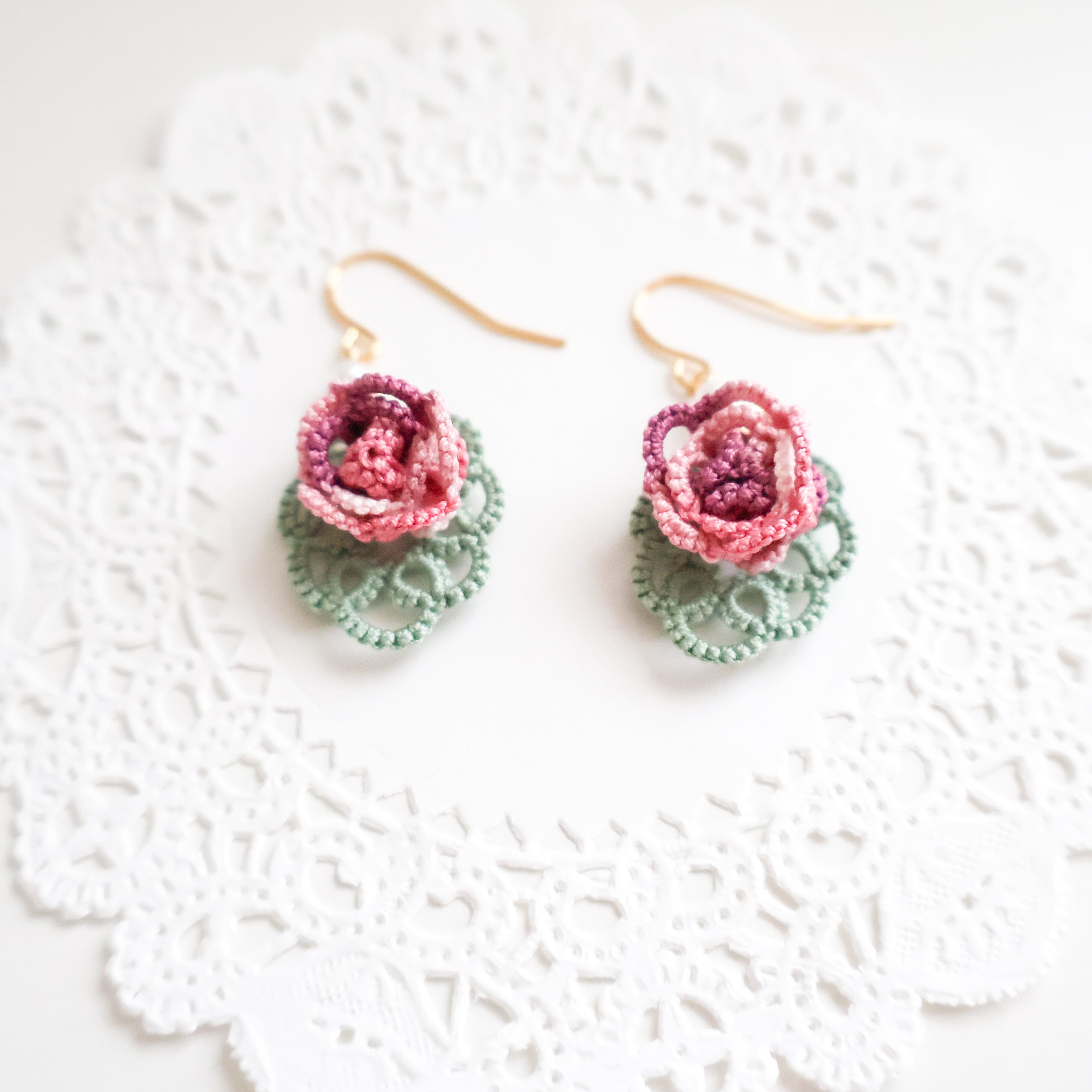 タティングレースで繊細に作られた薔薇モチーフのピアス/イヤリング。
