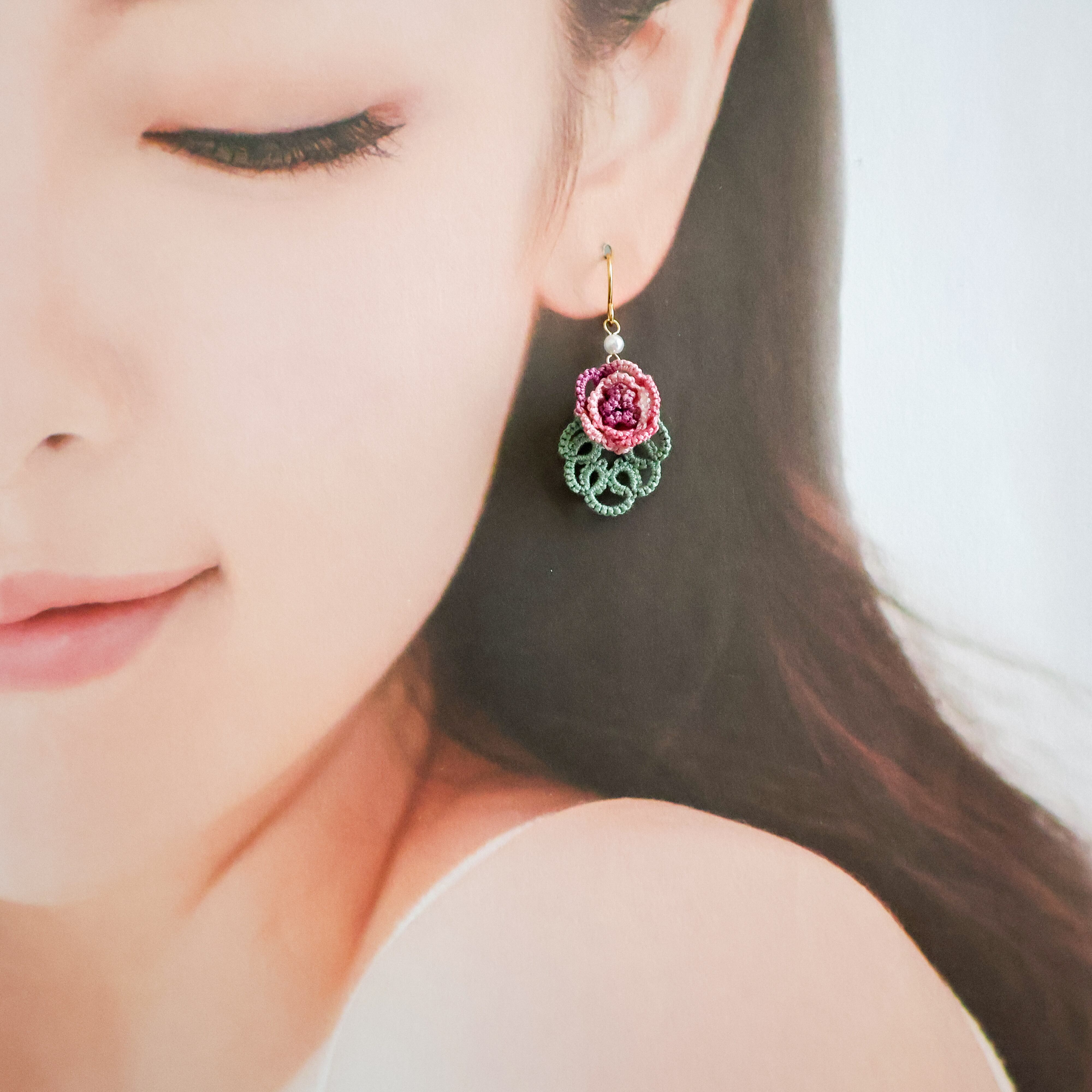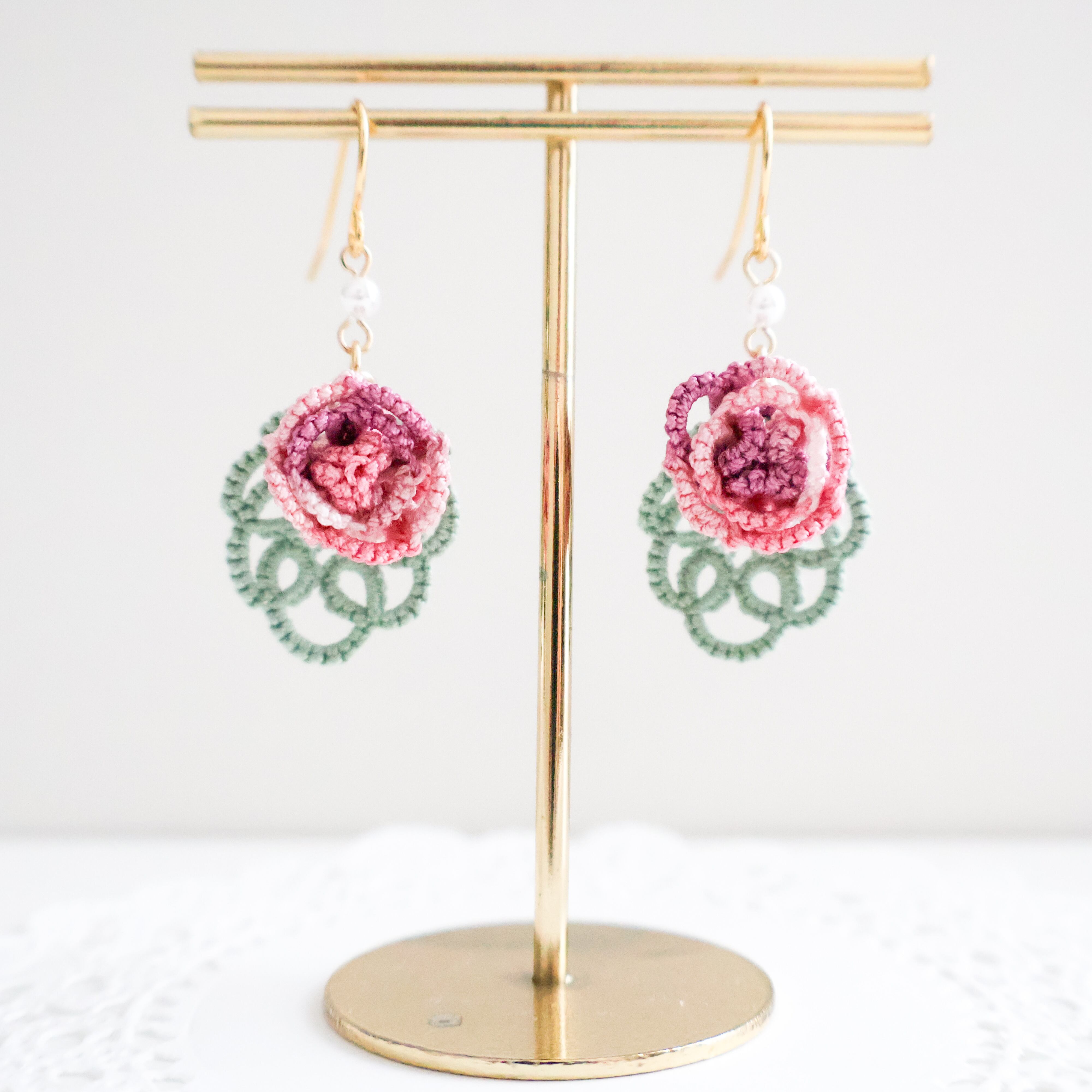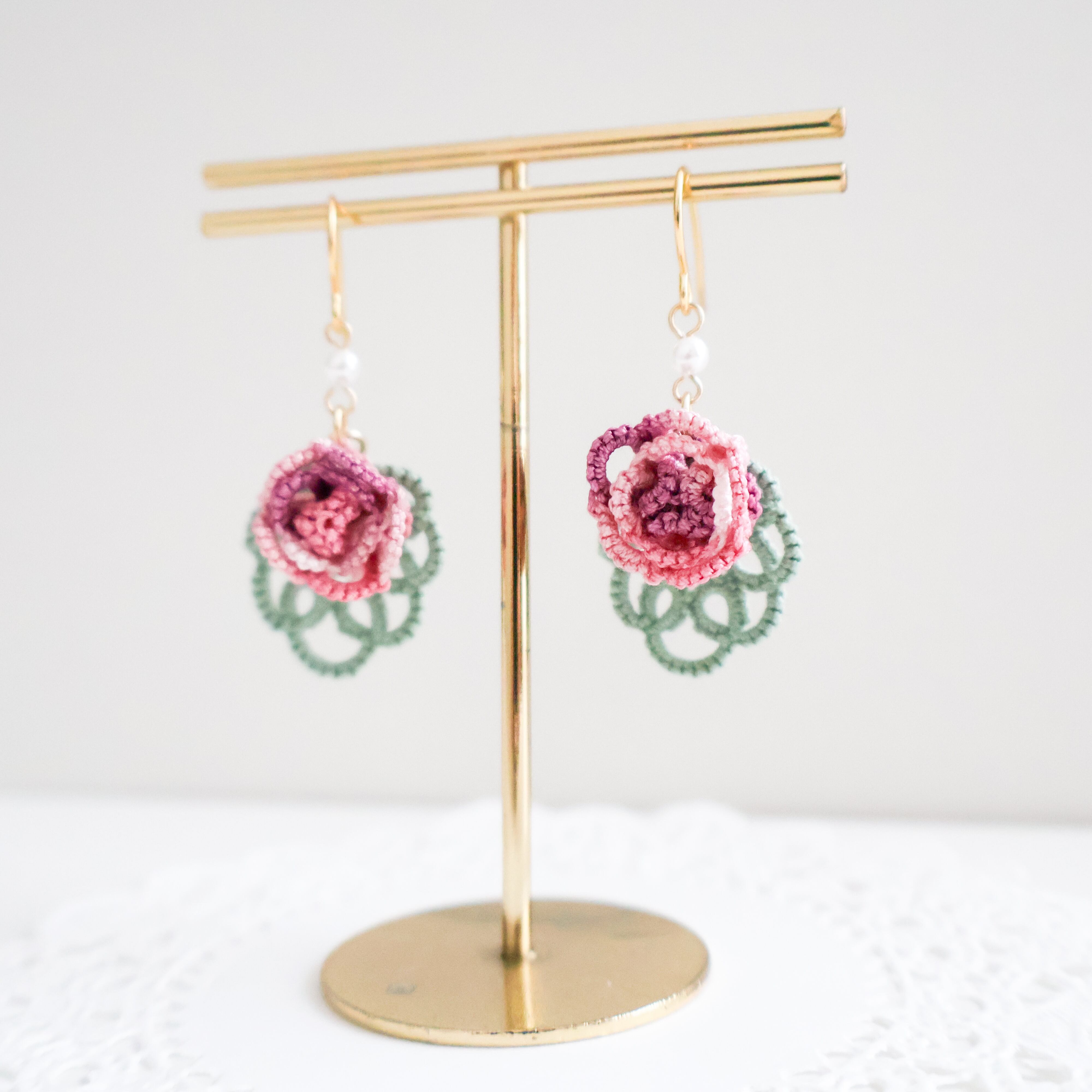タティングレースで繊細に作られた薔薇モチーフのピアス/イヤリング。