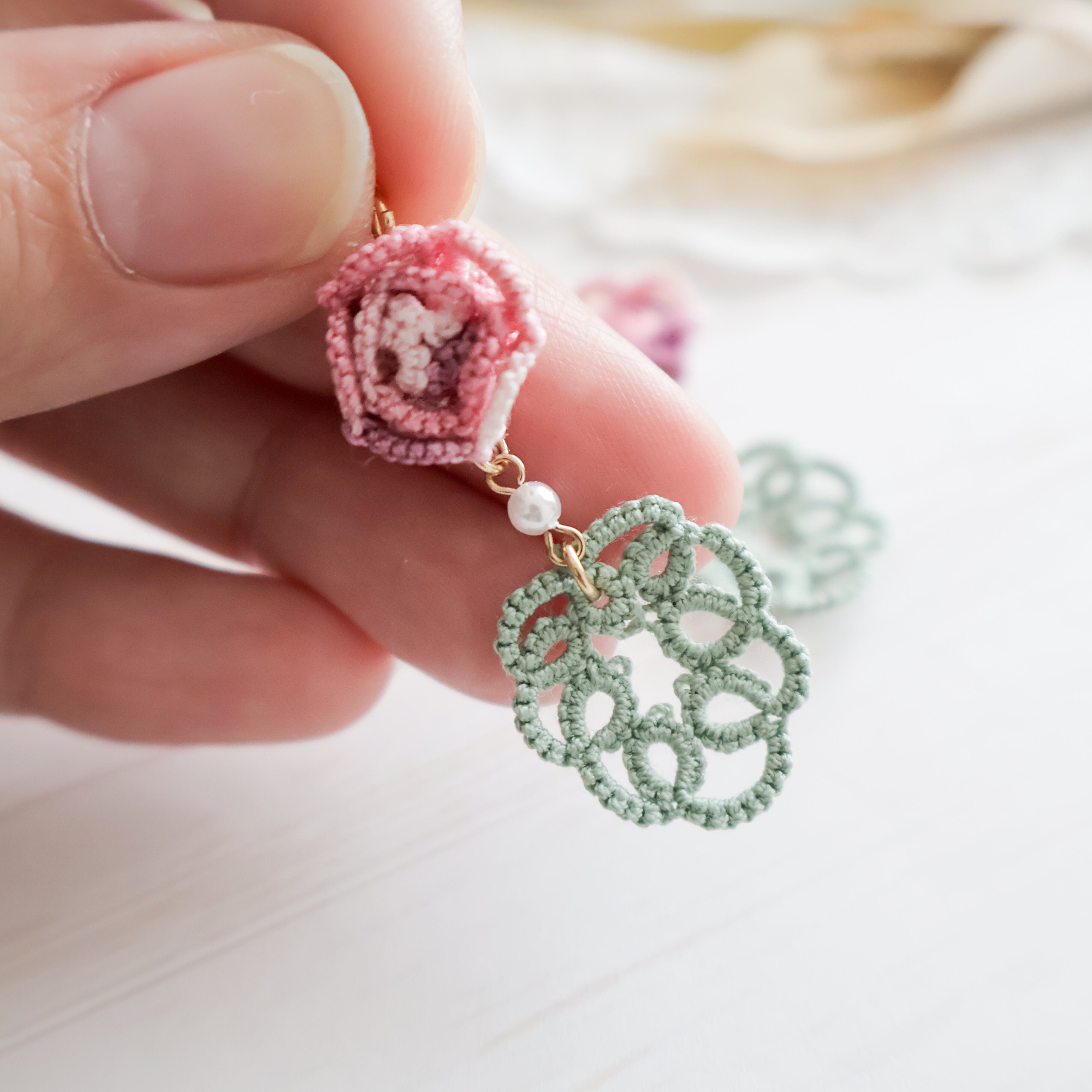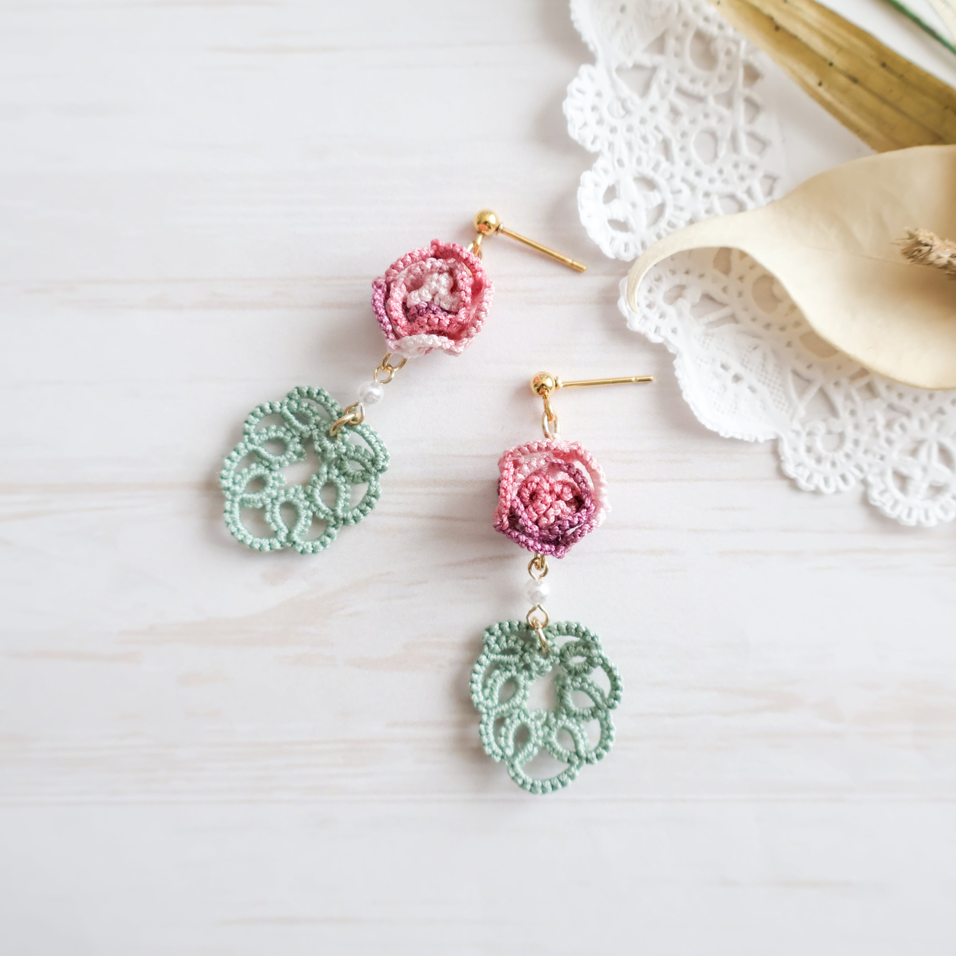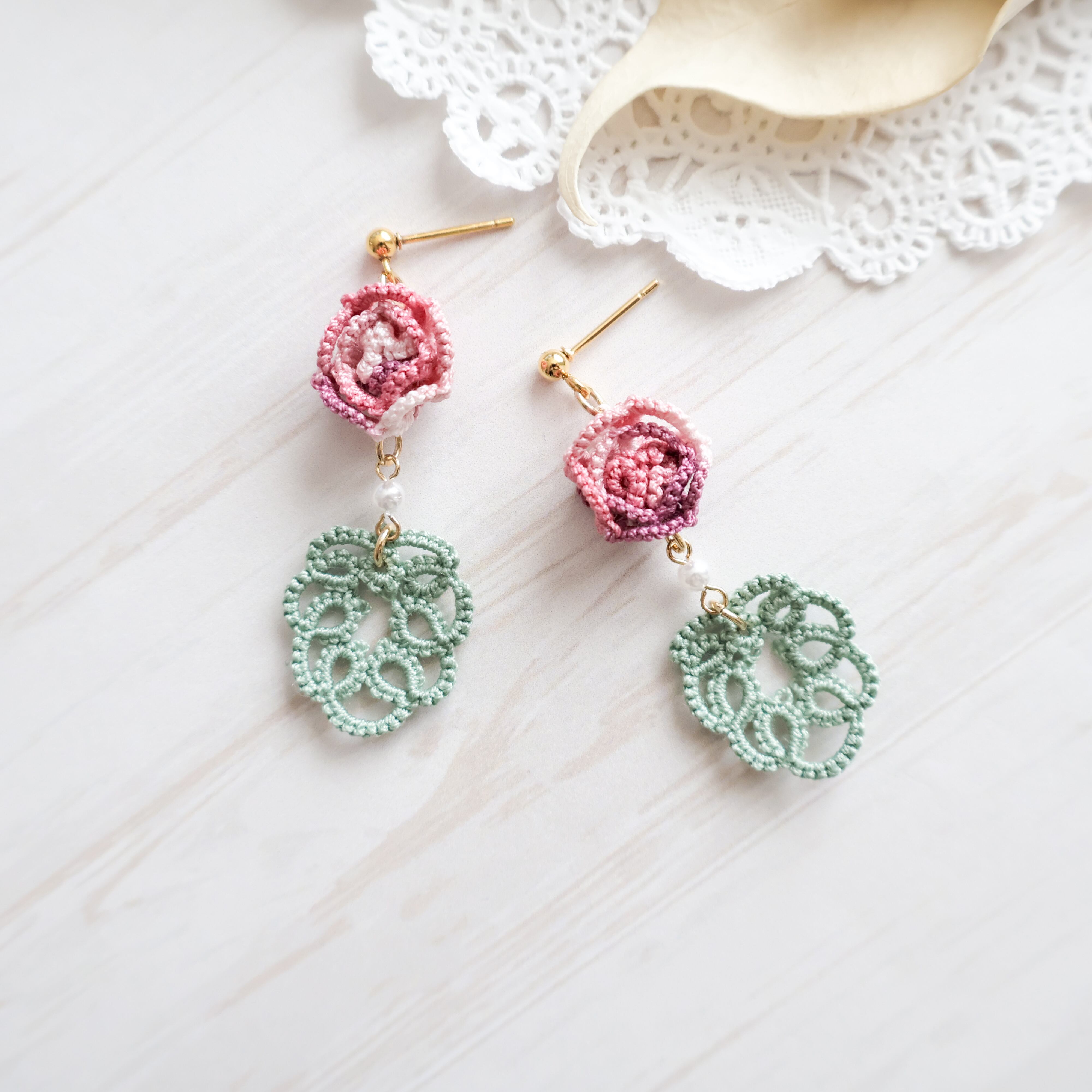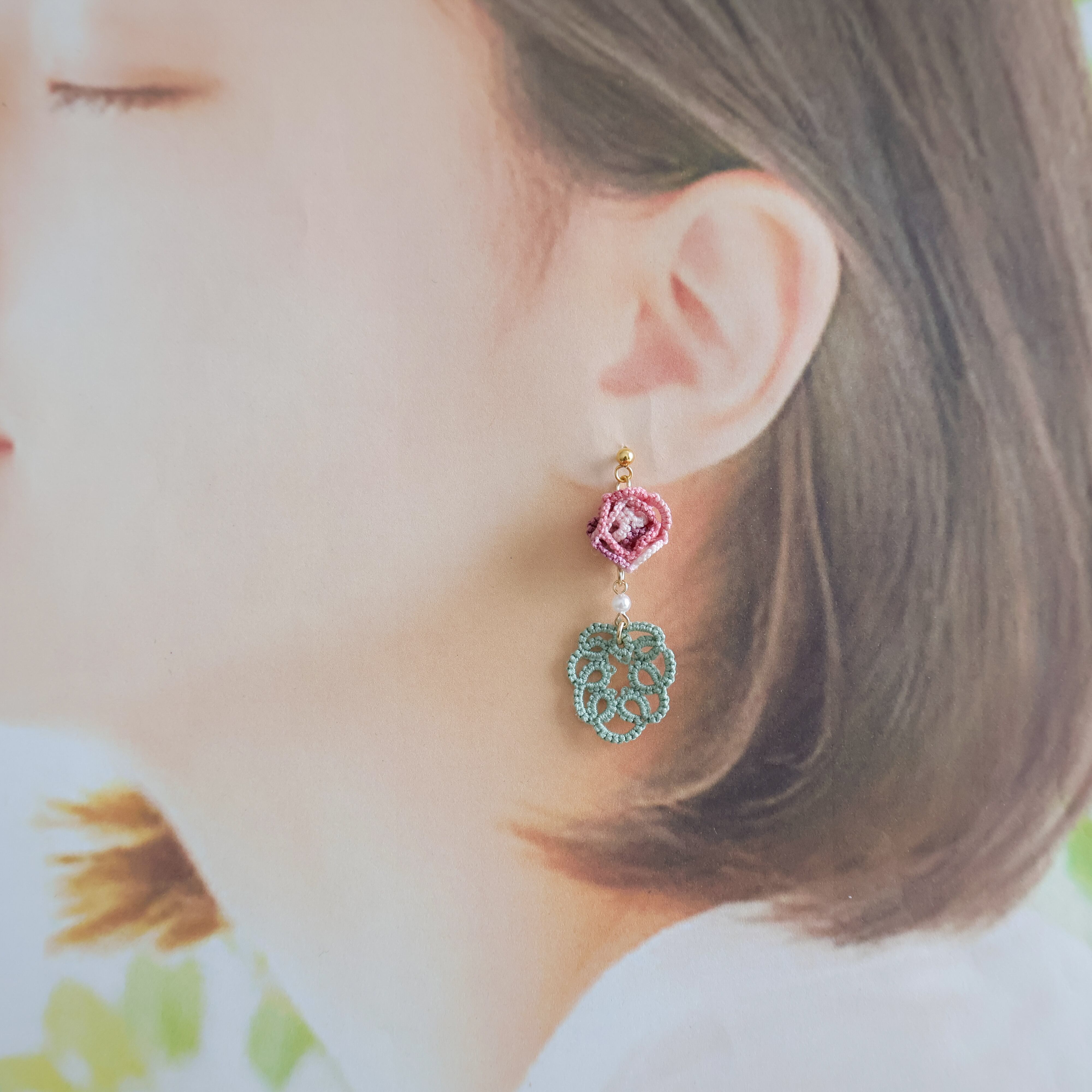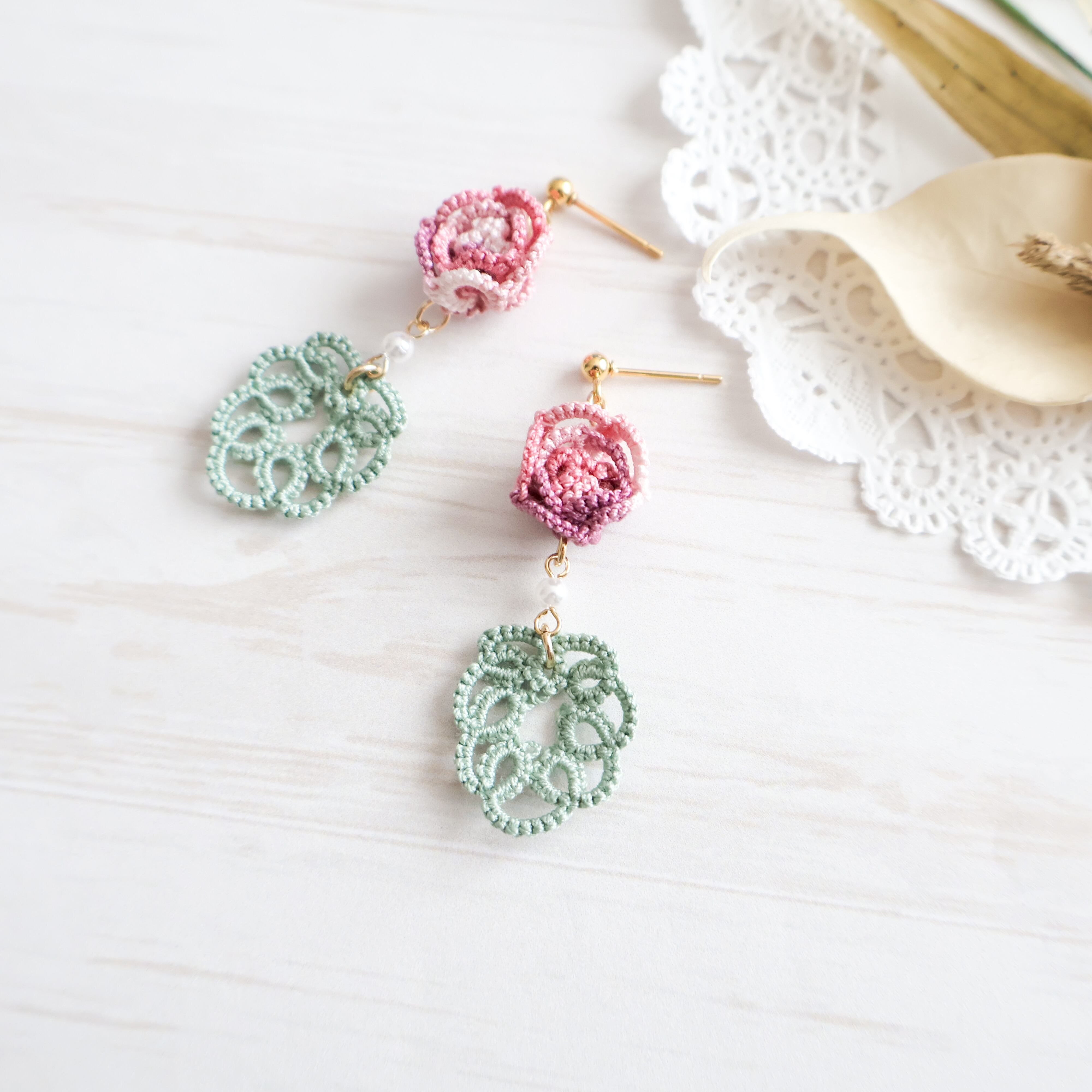 タティングレースで繊細に作られた薔薇モチーフのピアス/イヤリング。
