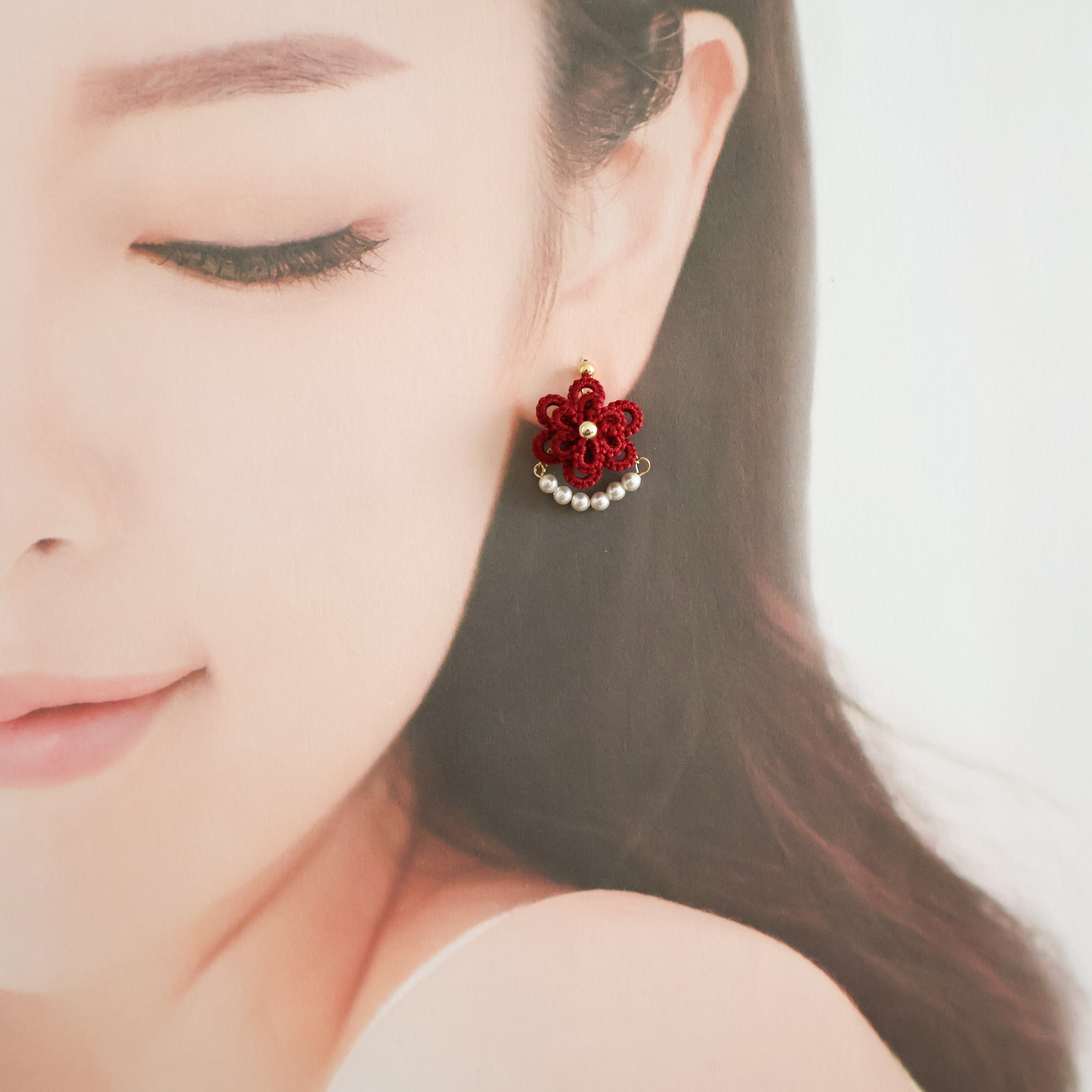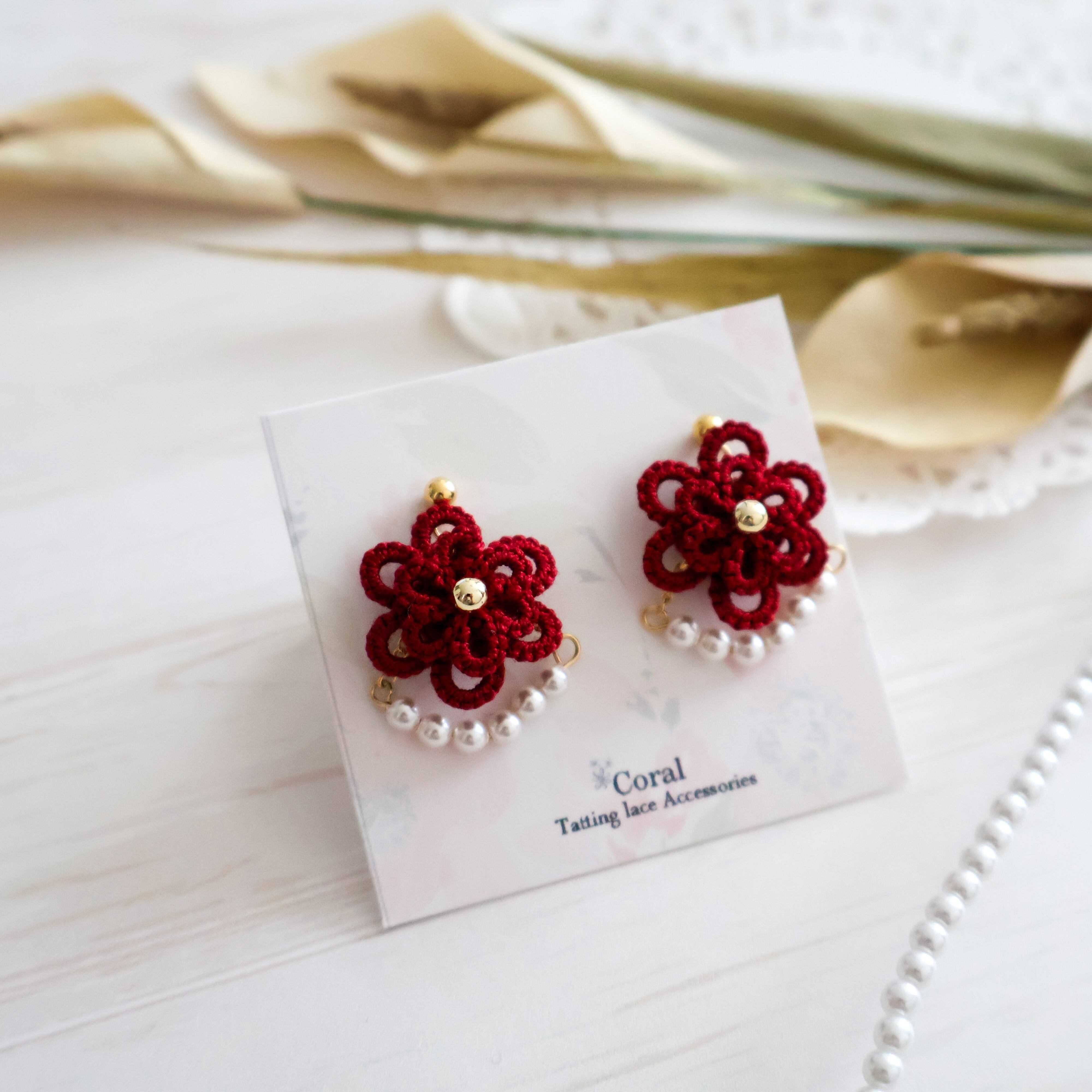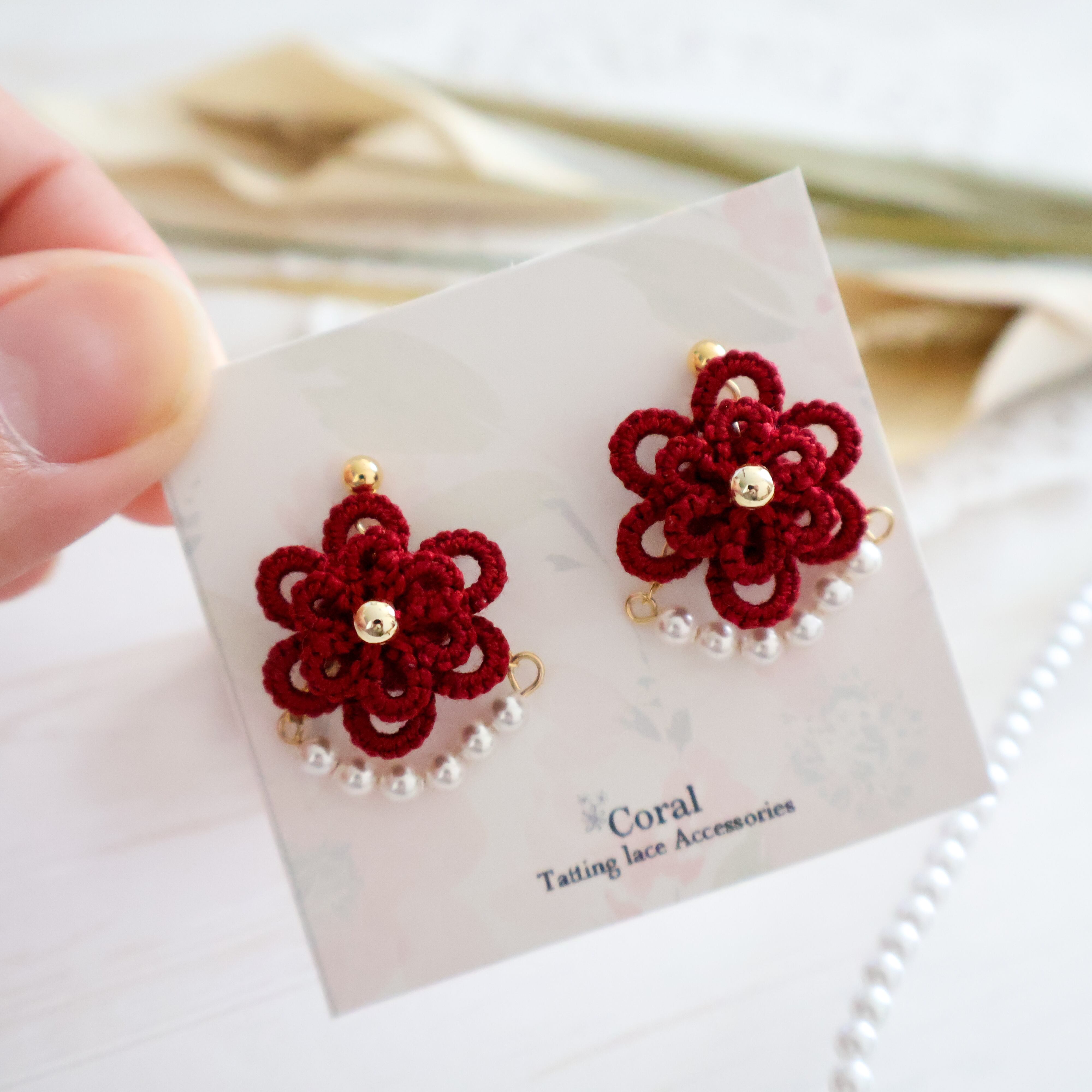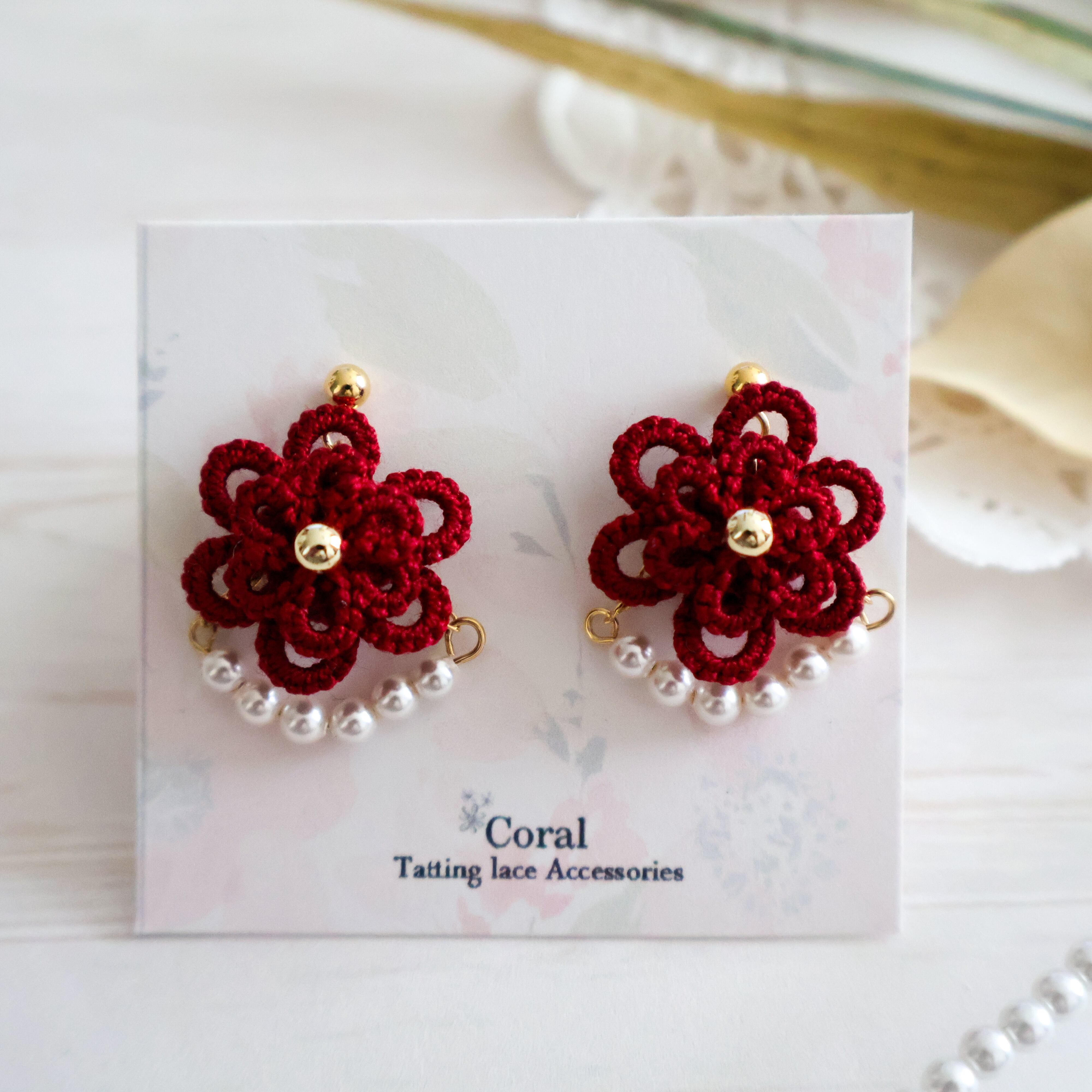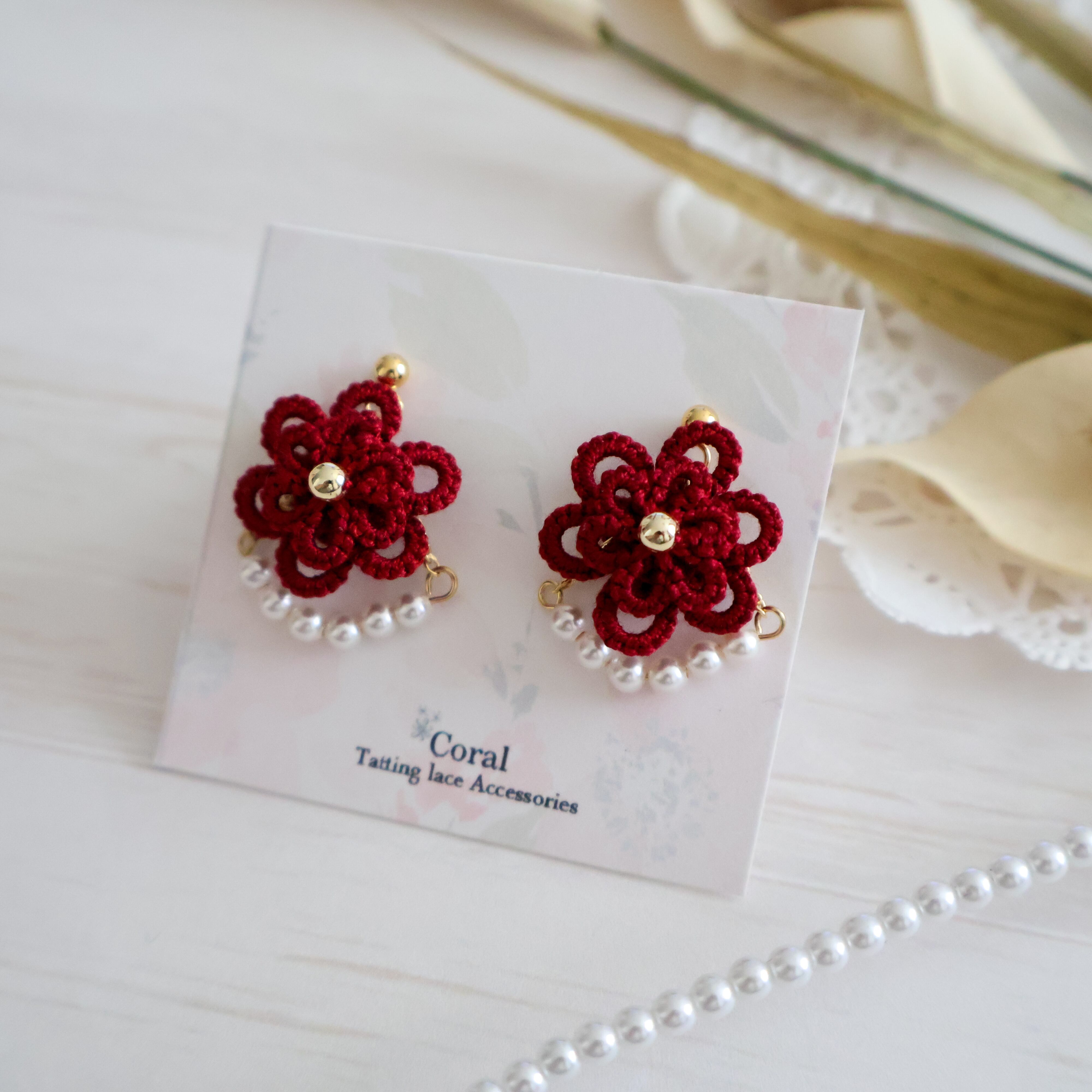 普段赤のアクセサリーを付けられない方にも付けやすいように、落ち着いたワインレッドの糸を使用して編んでいます。