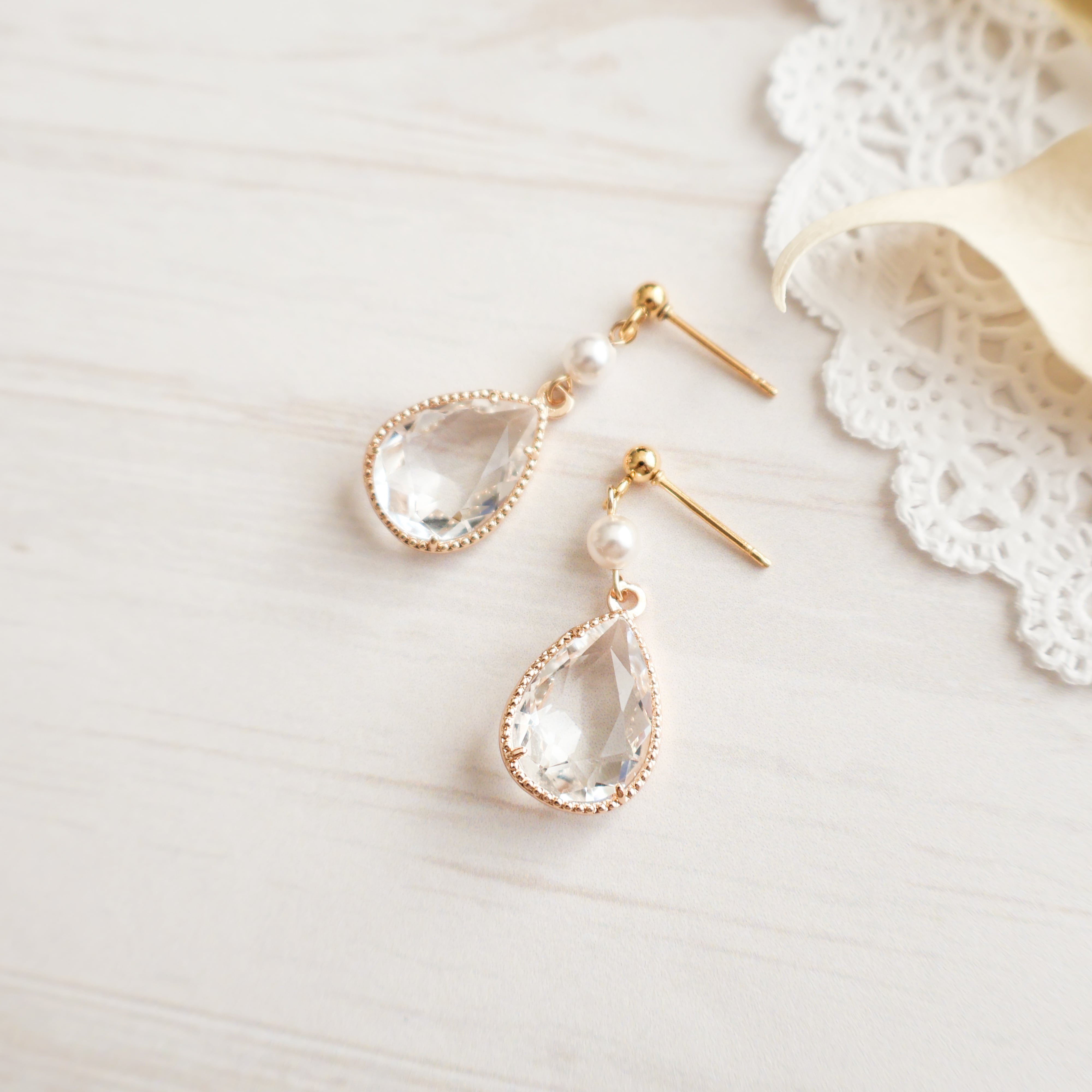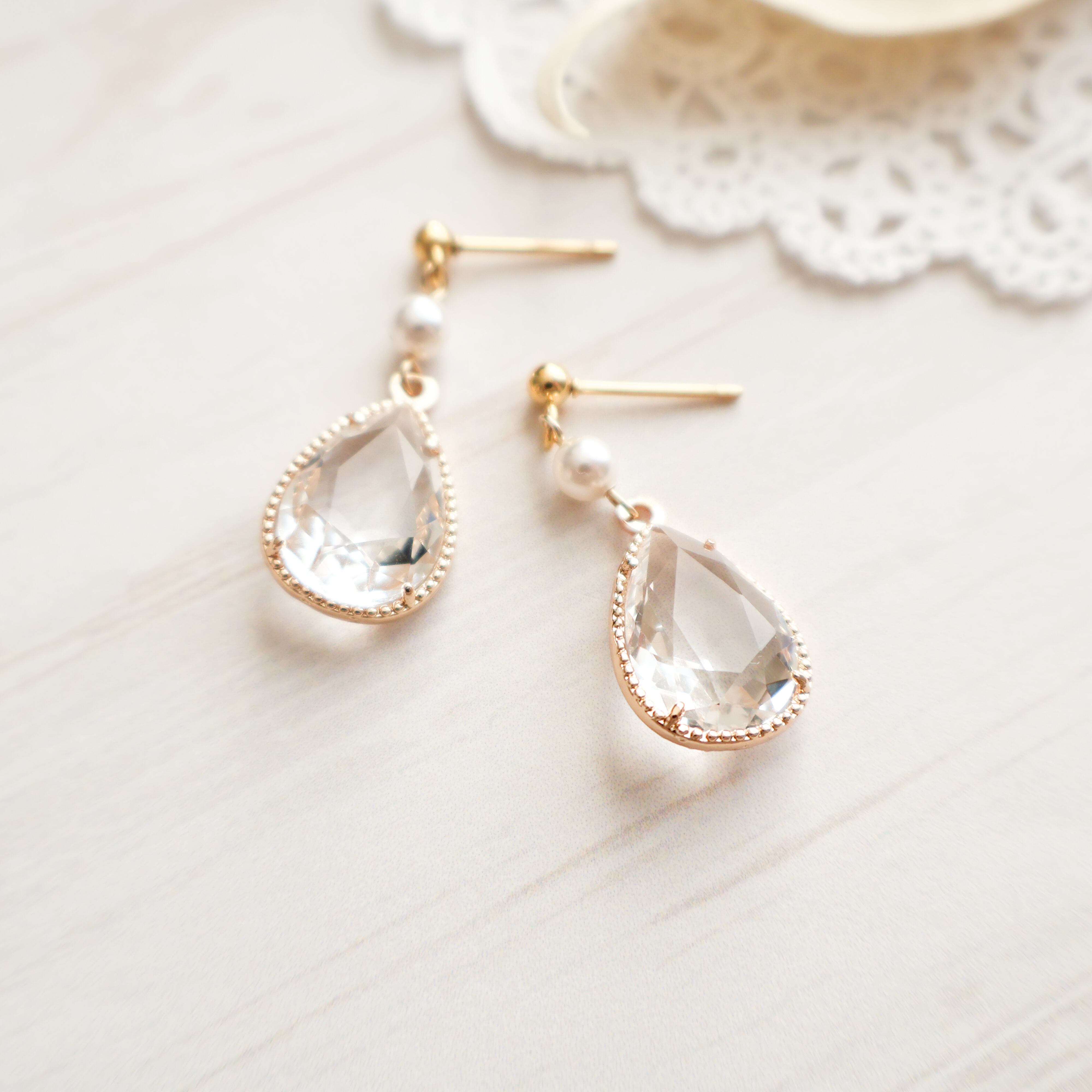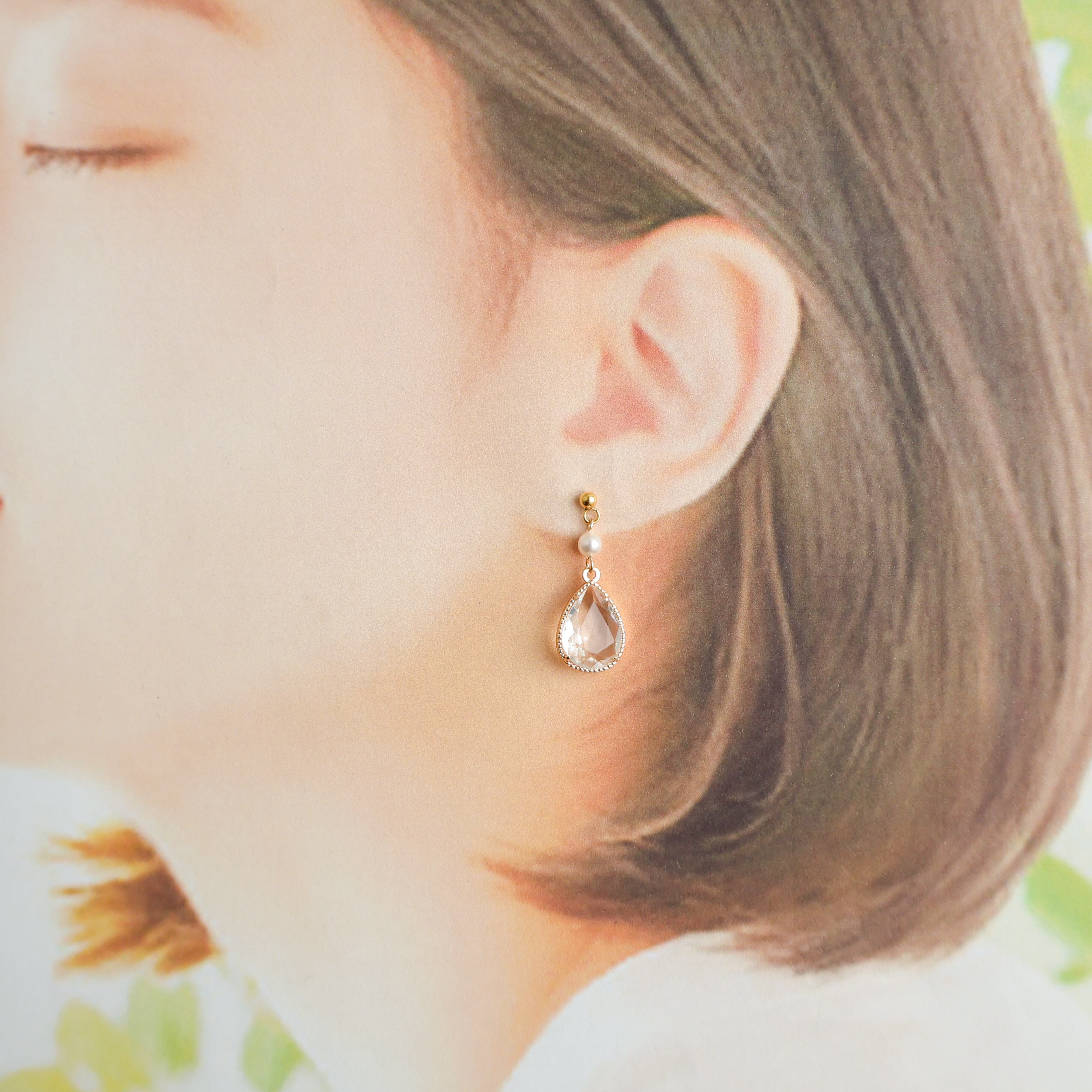 輝くガラスドロップが耳元で揺れる、華やかさ溢れるピアス/イヤリングです。