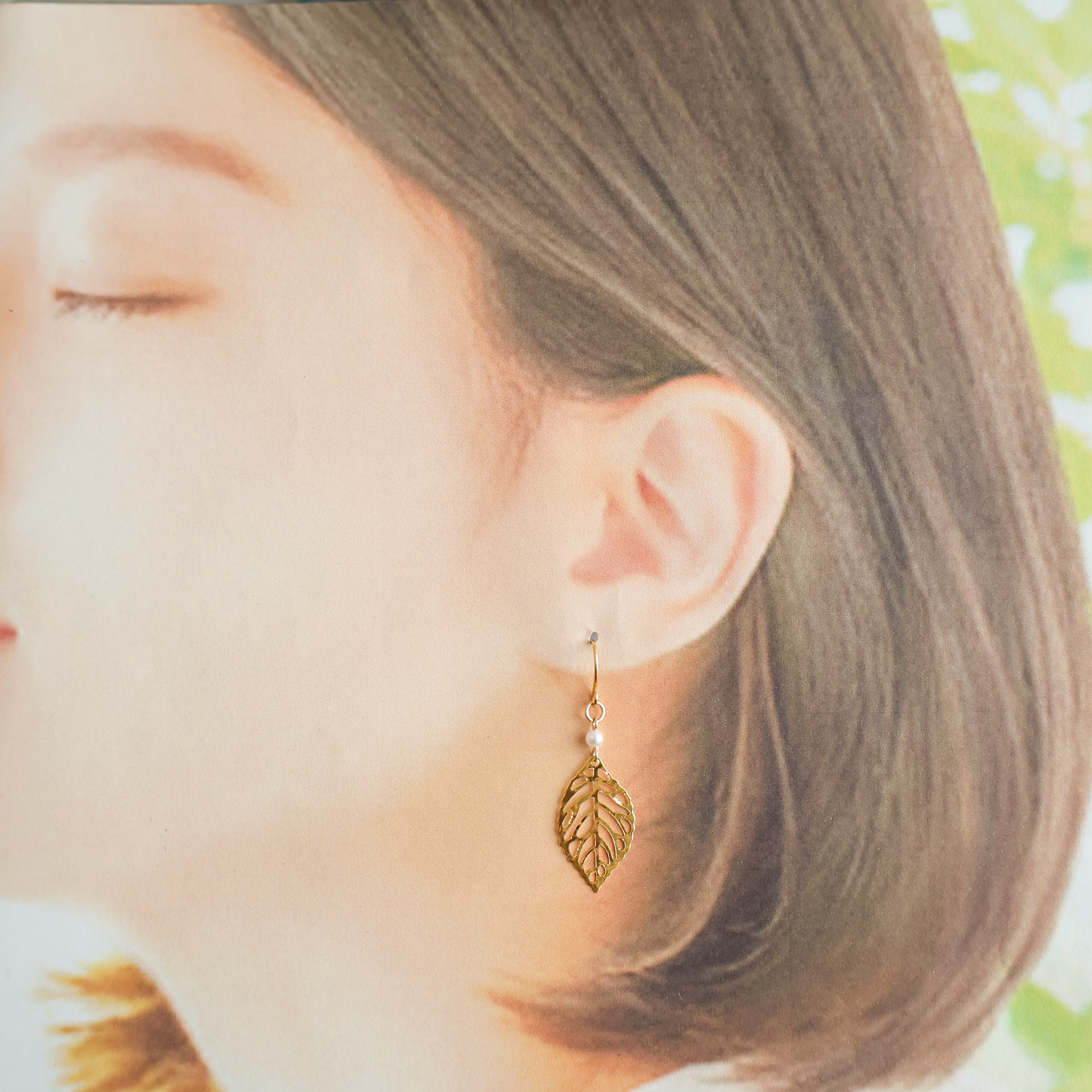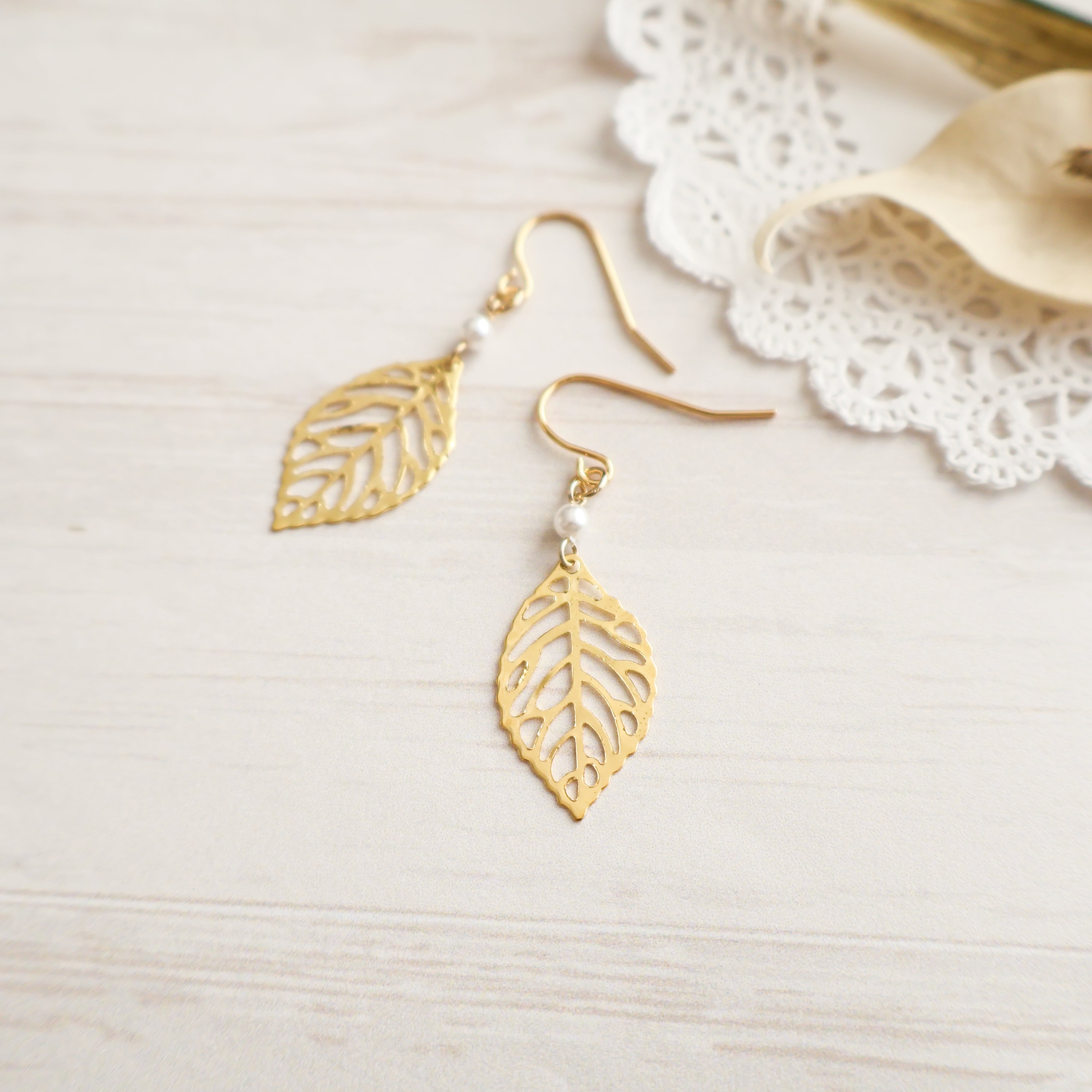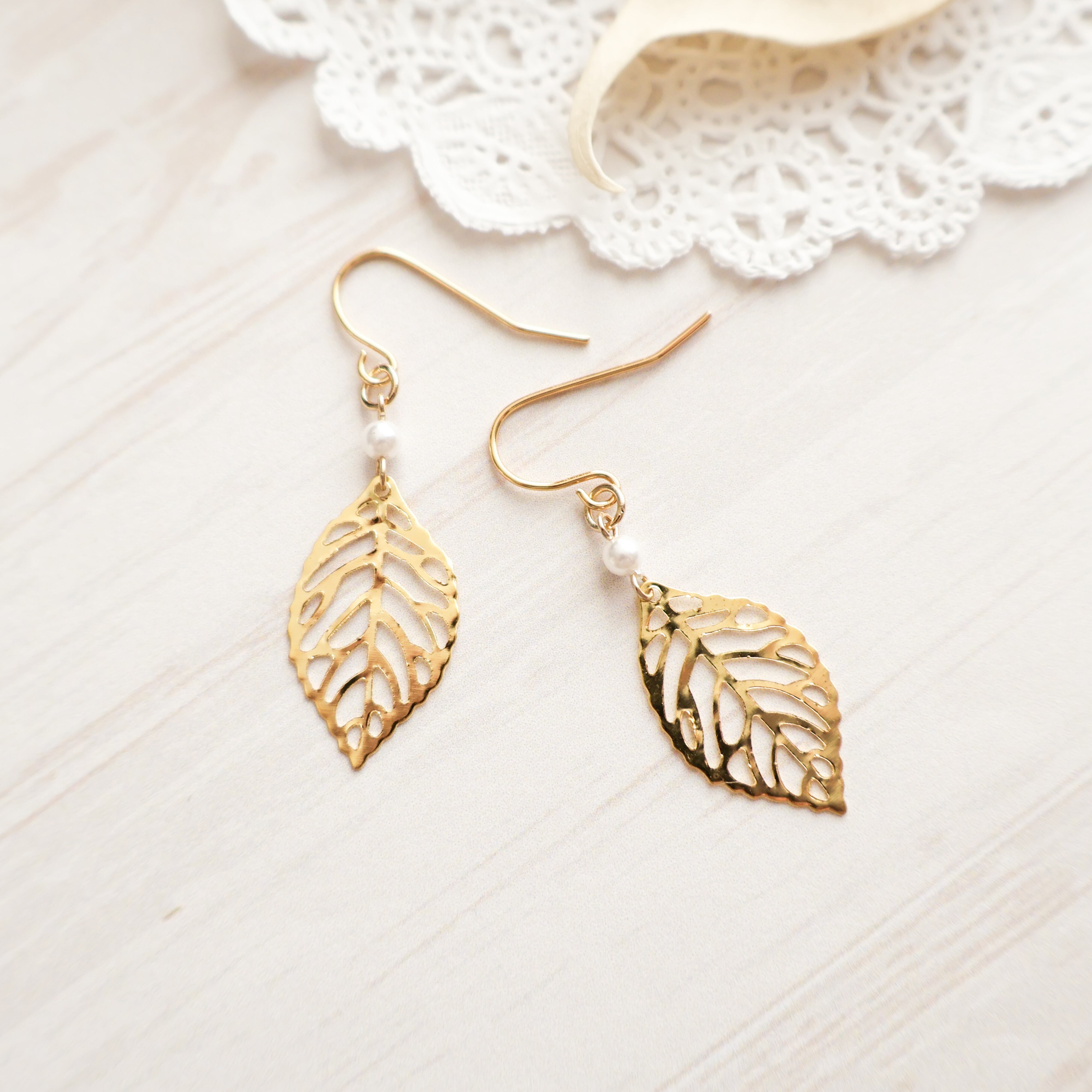 シンプルでエレガントなデザインのリーフモチーフピアス/イヤリングに、一粒の小粒パールをアクセントに添えました。