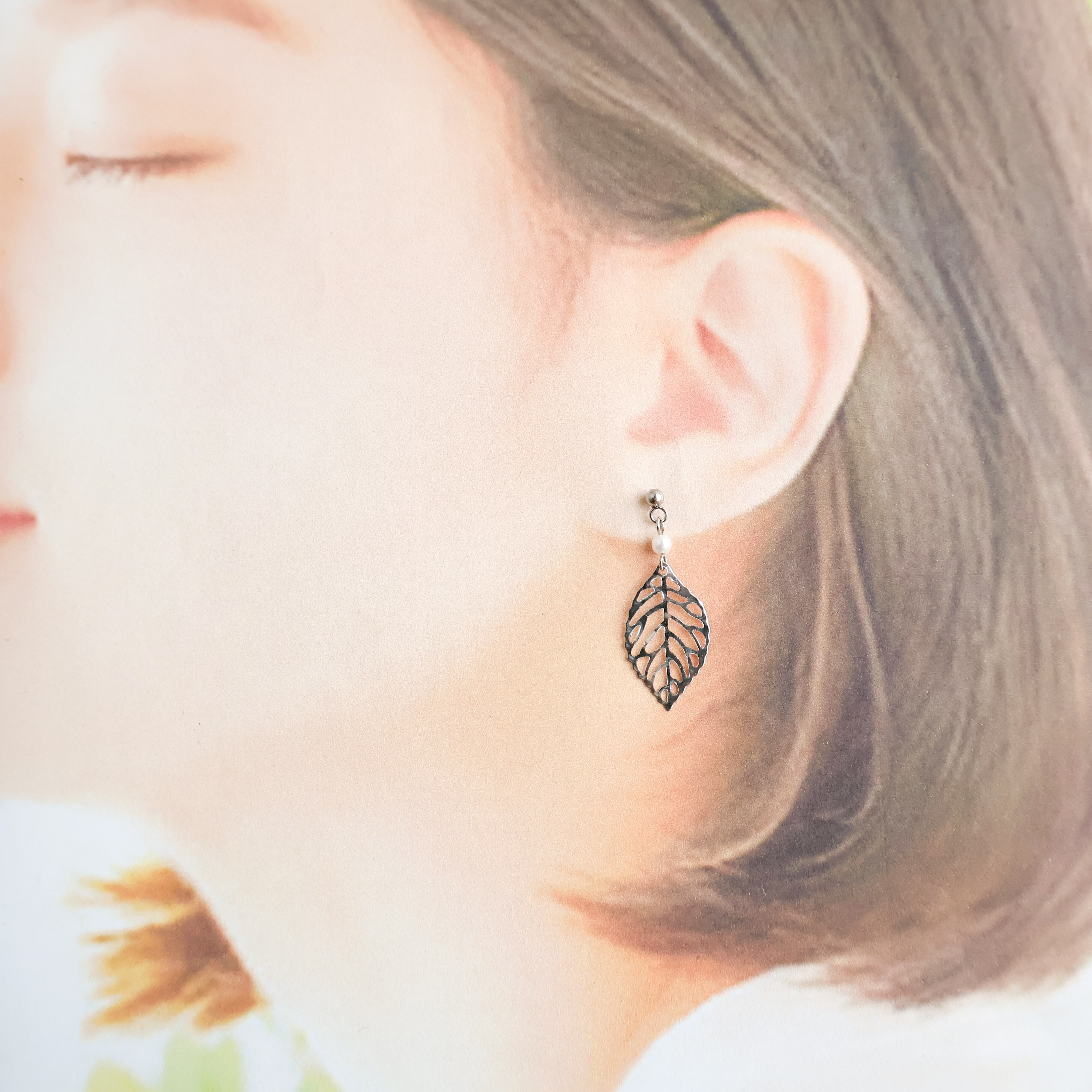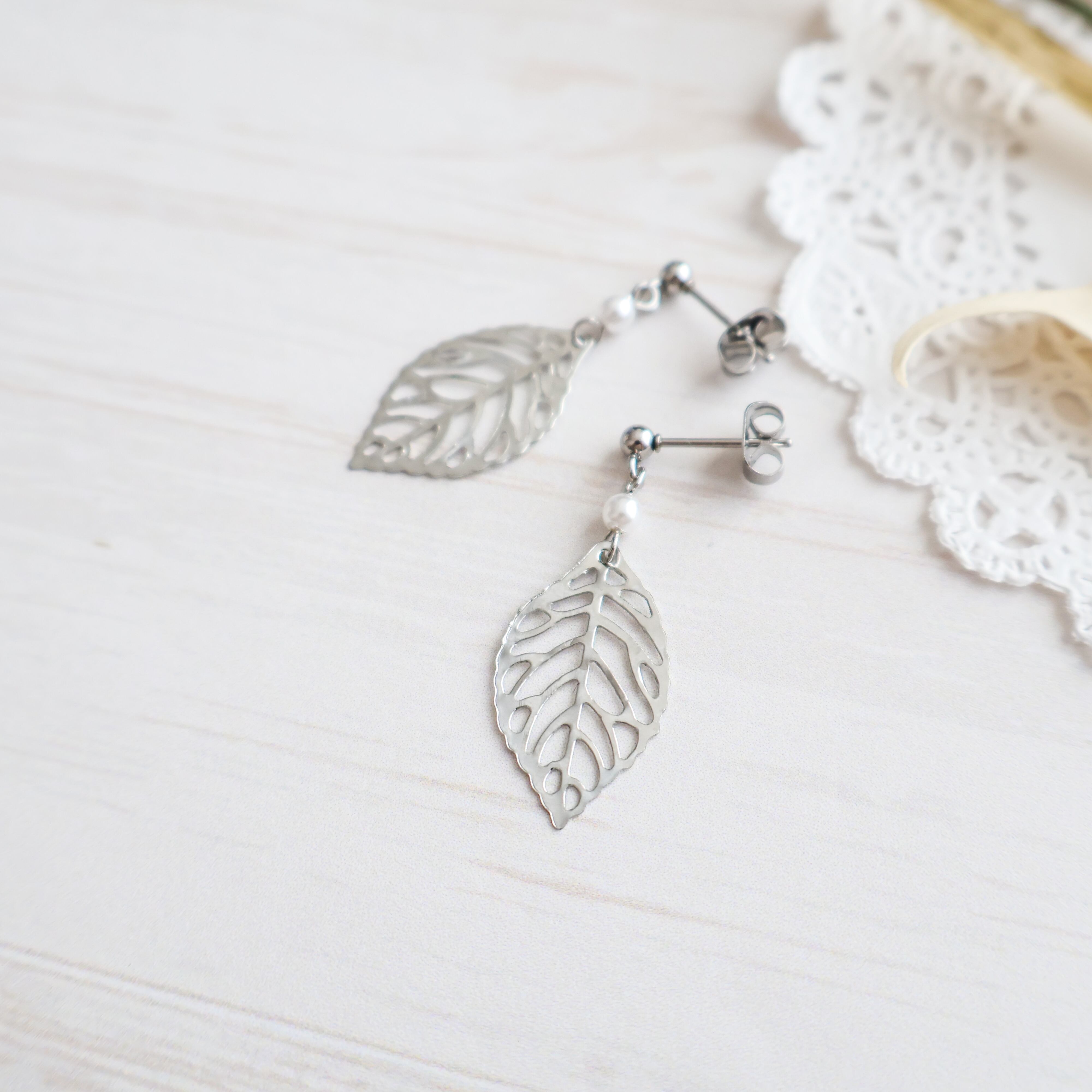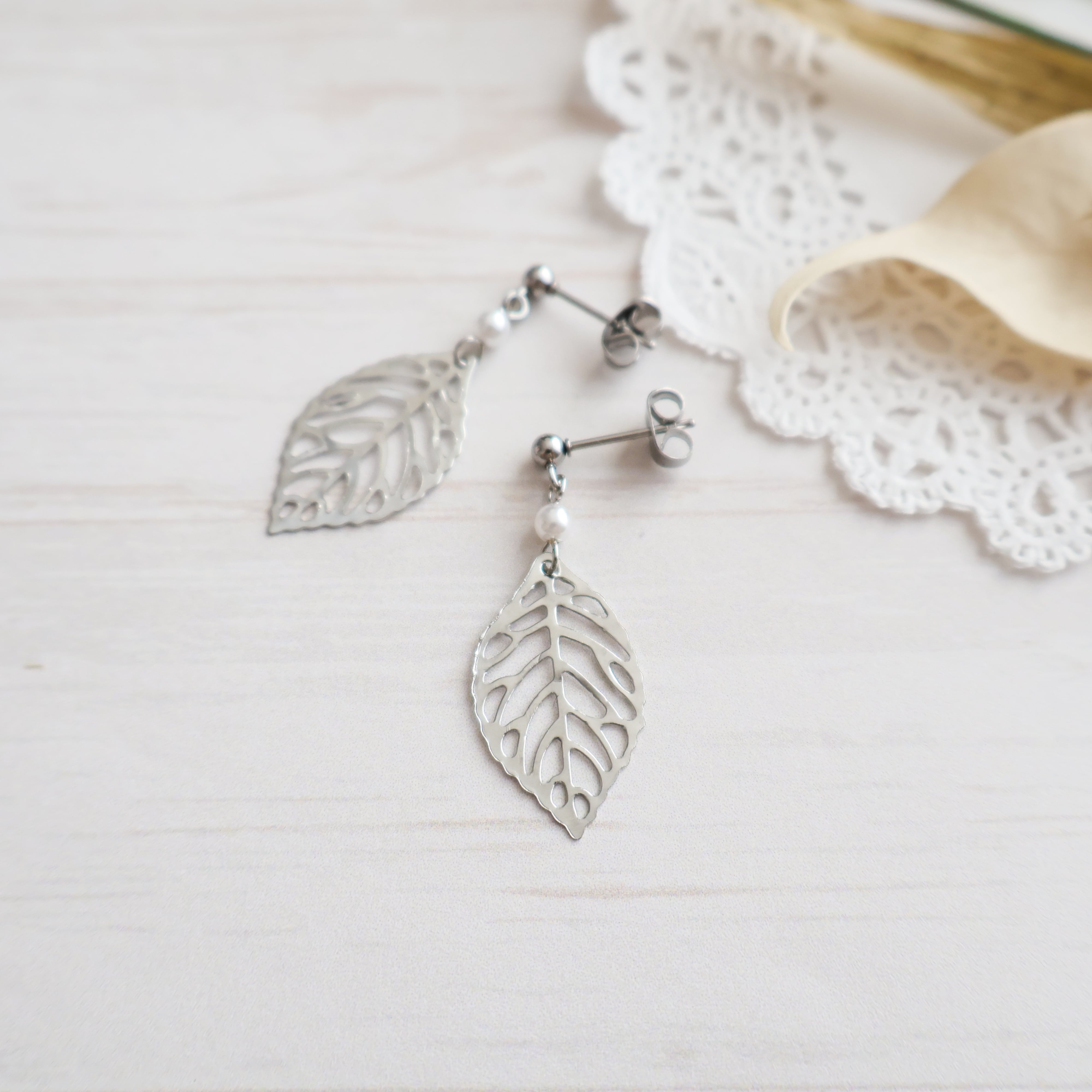 シンプルでエレガントなデザインのリーフモチーフピアス/イヤリングに、一粒の小粒パールをアクセントに添えました。