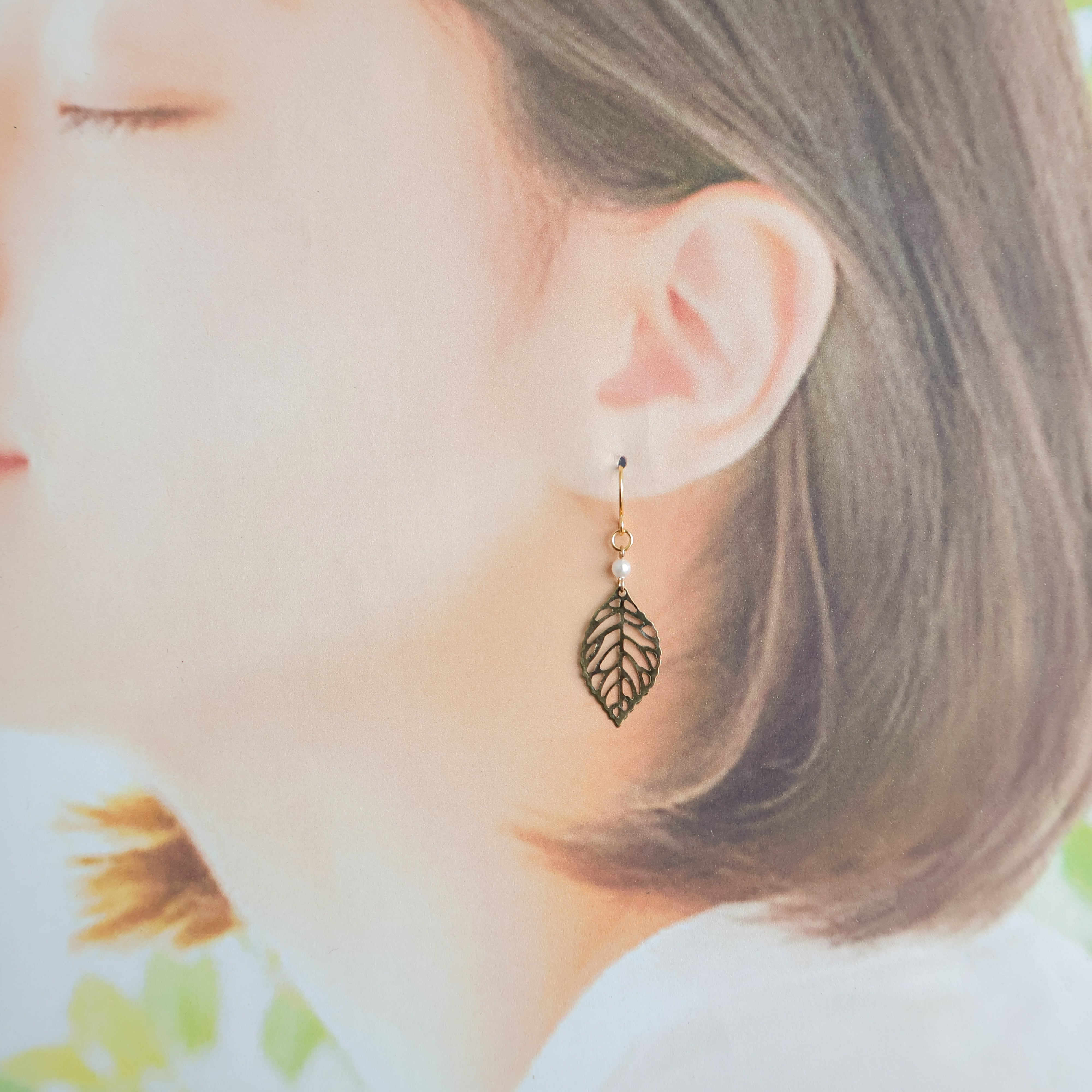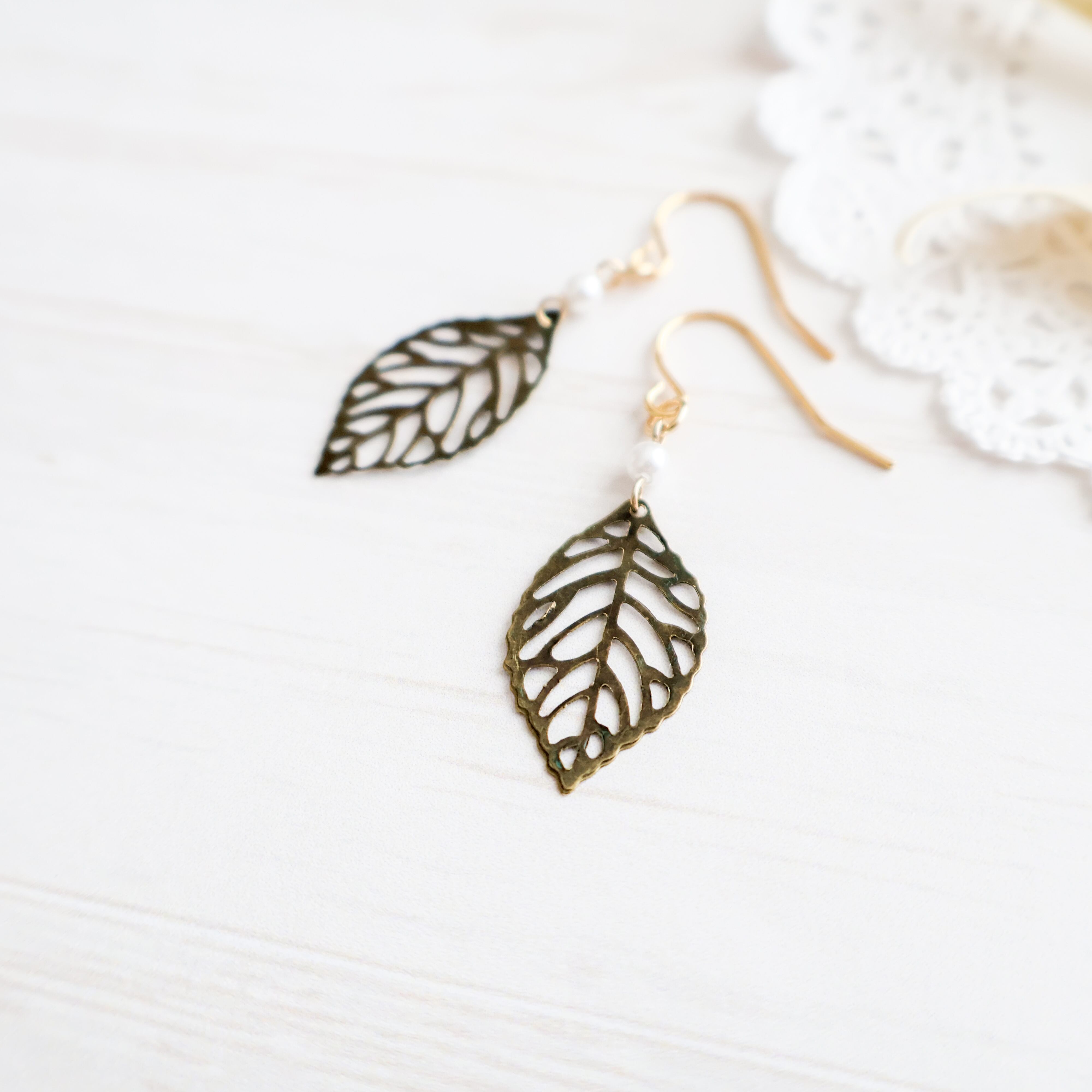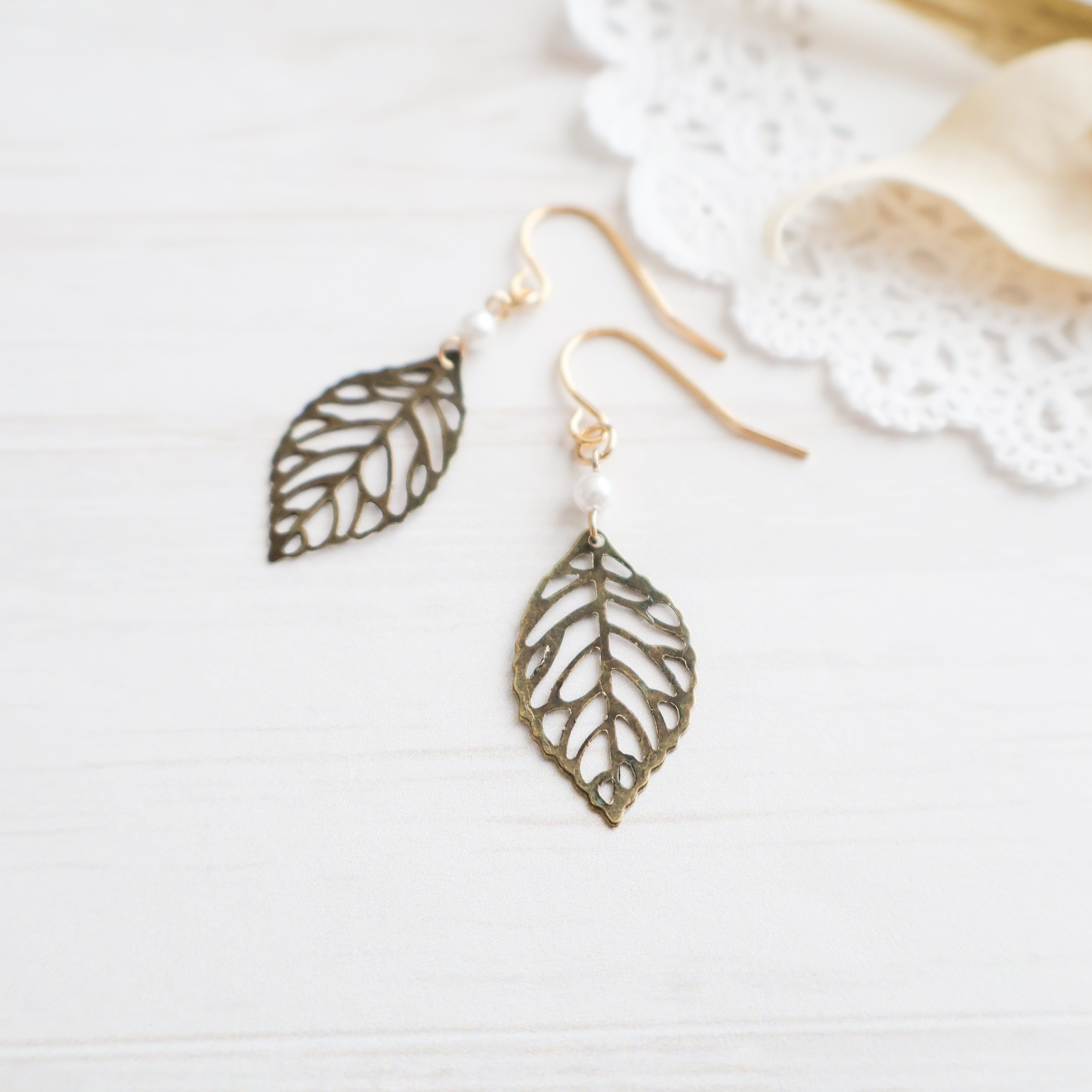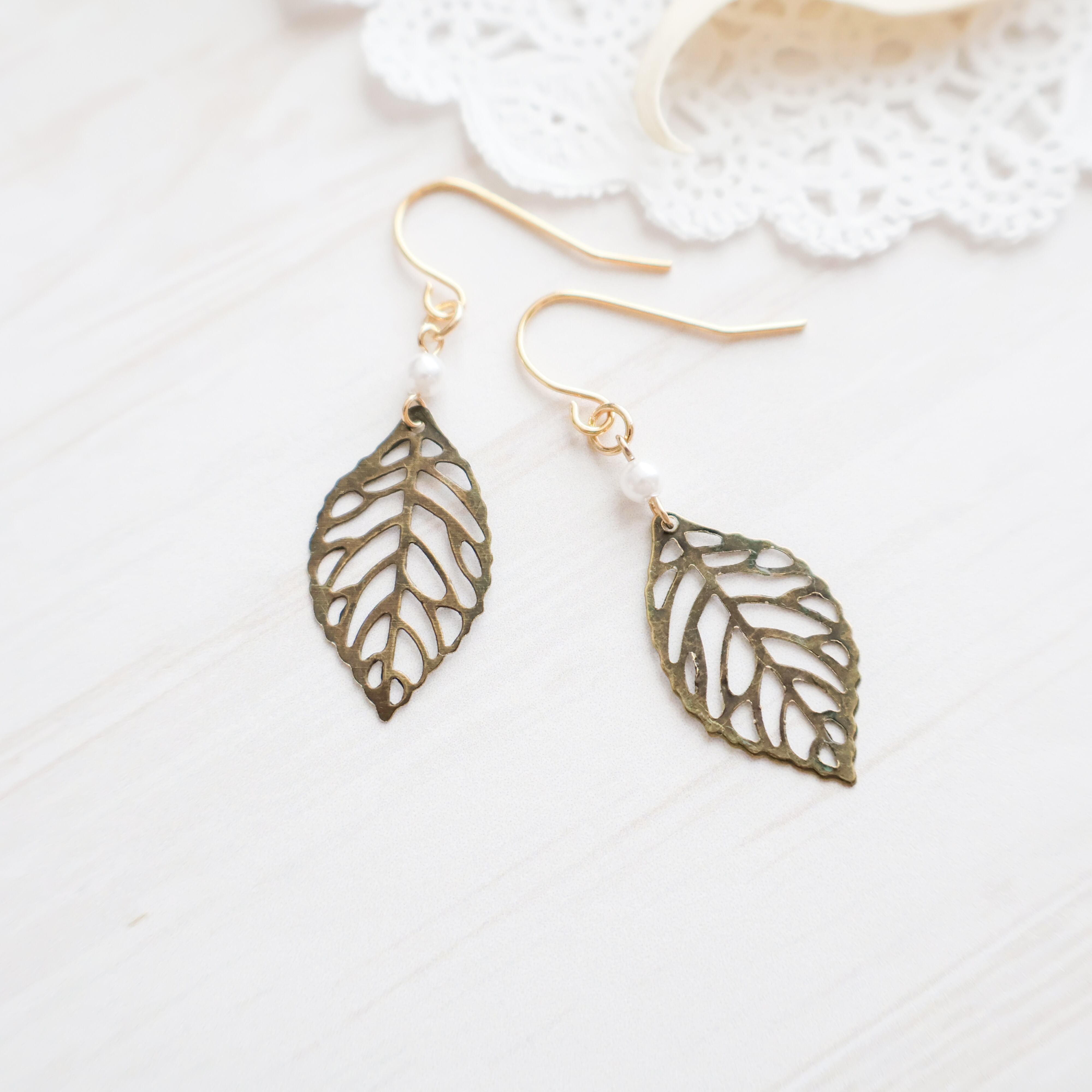 シンプルでエレガントなデザインのリーフモチーフピアス/イヤリングに、一粒の小粒パールをアクセントに添えました。