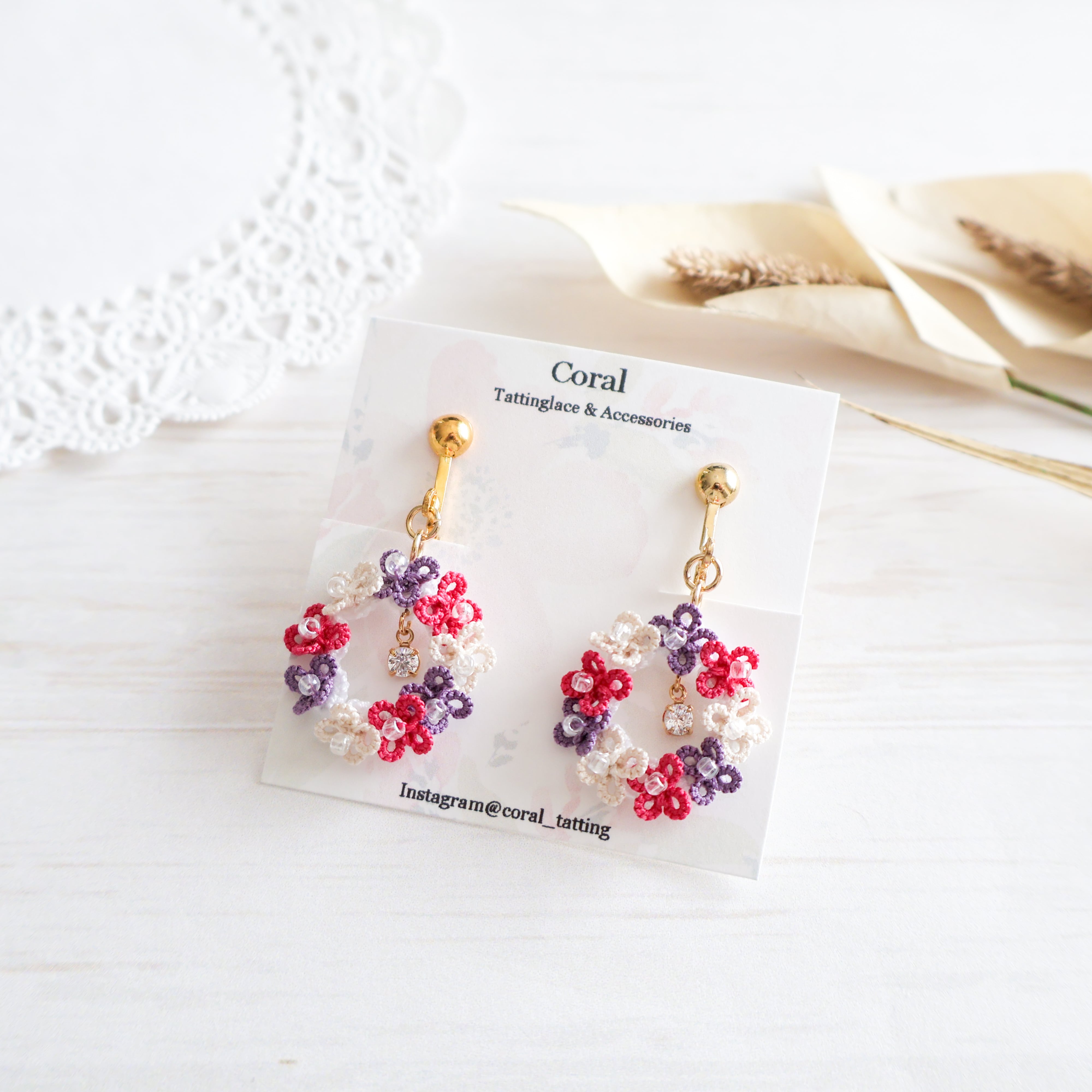 この花かんむりの特徴は、タティングレースの技法で作られていること。