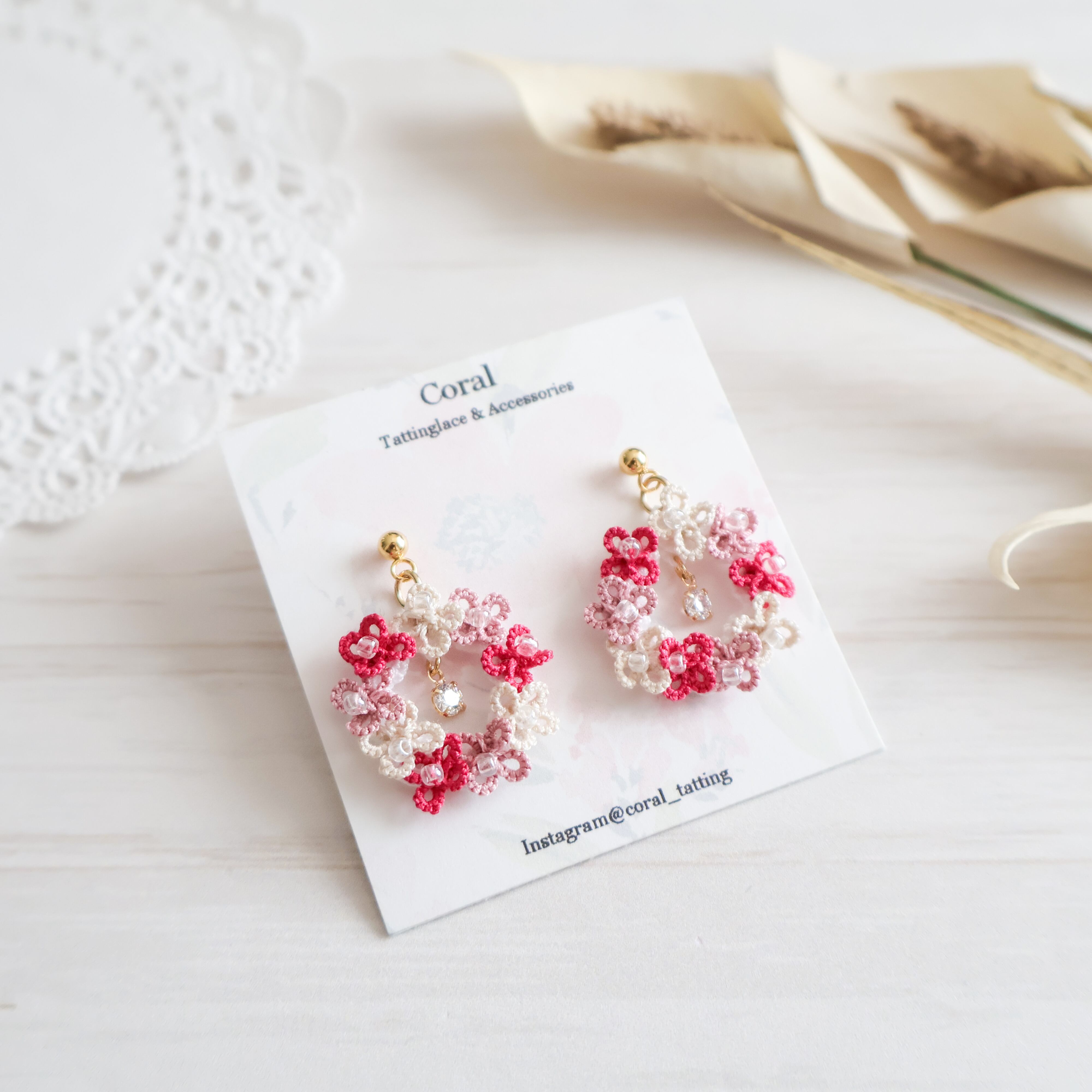 この花かんむりの特徴は、タティングレースの技法で作られていること。