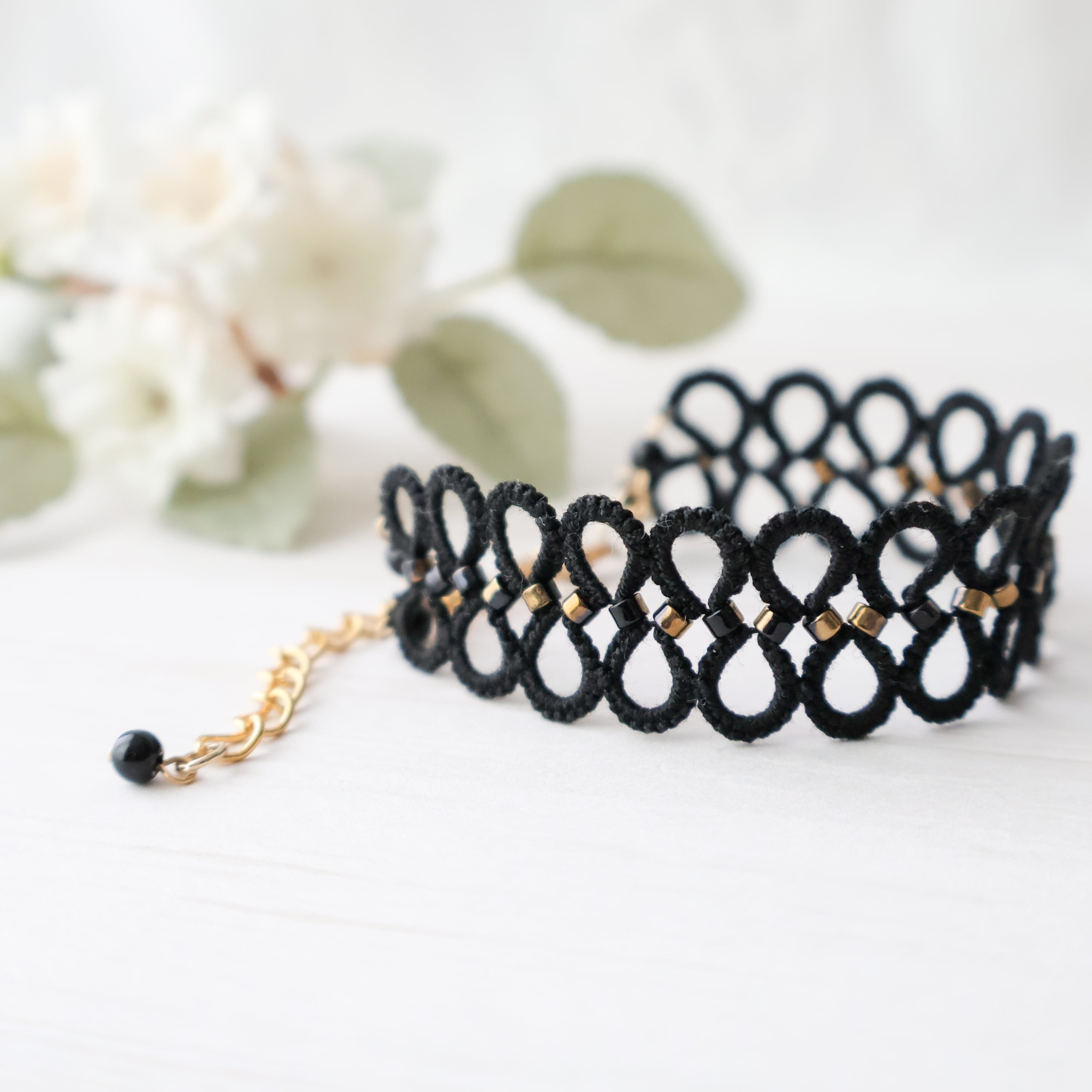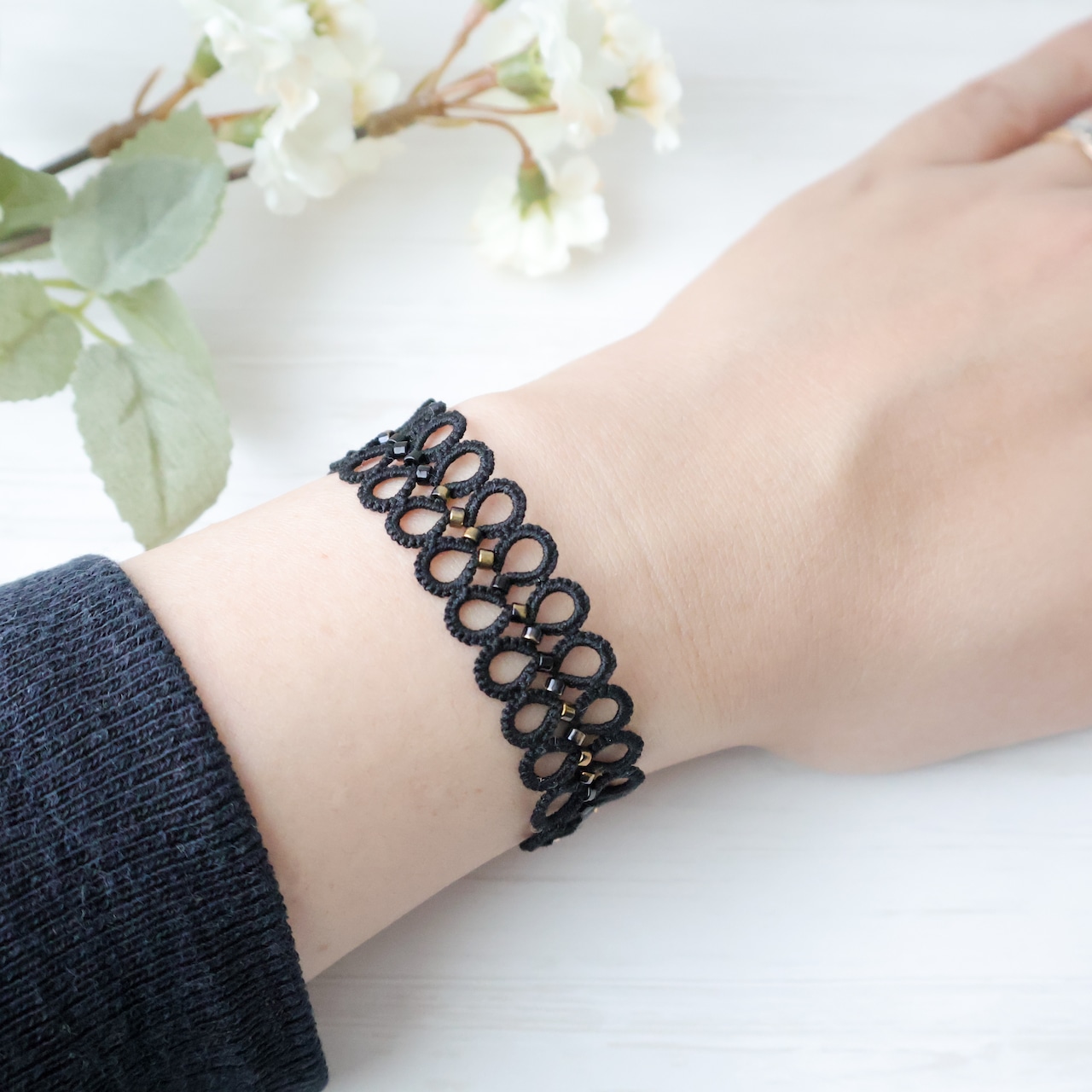 ビンテージ風カラーのビーズを一緒に編み込むことで、シンプルながらも上品なデザインに仕立てました。