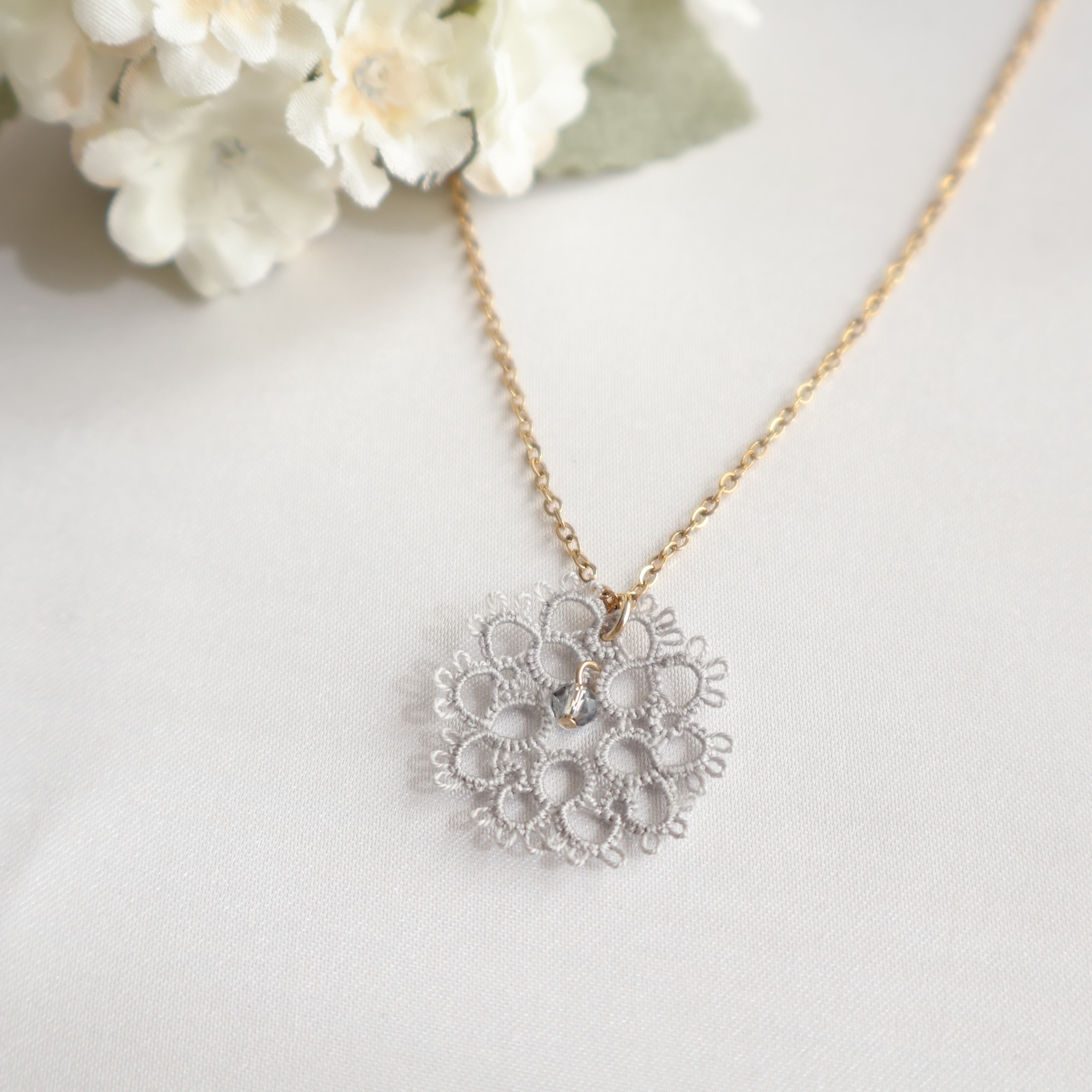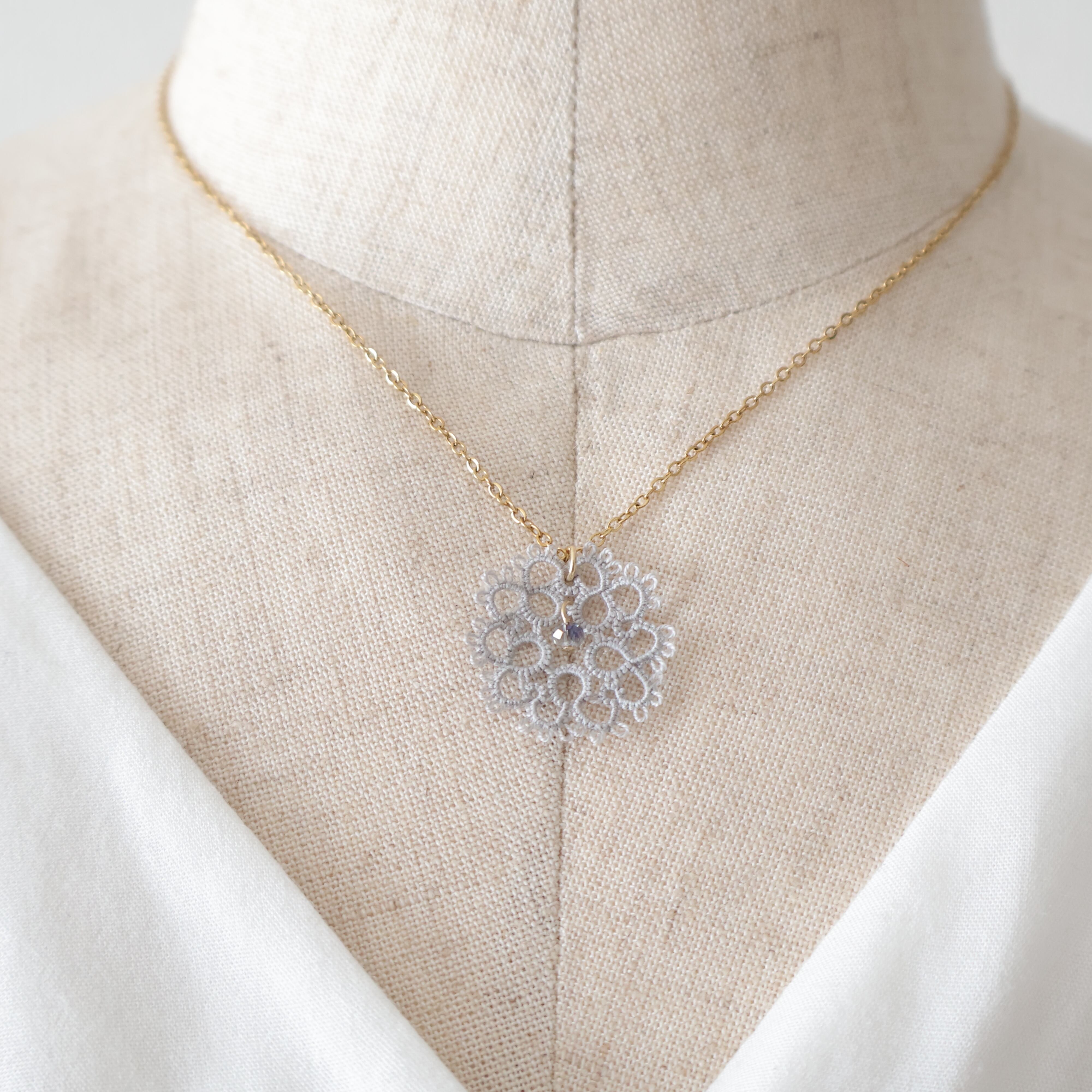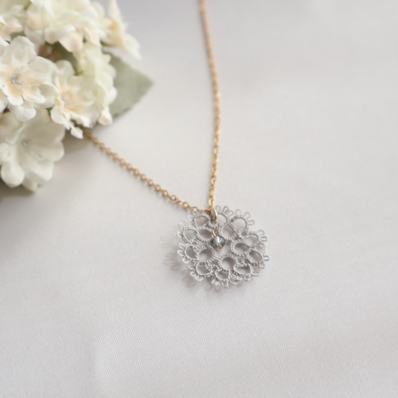 繊細で美しいタティングレースのモチーフが、首元を華やかに彩ります