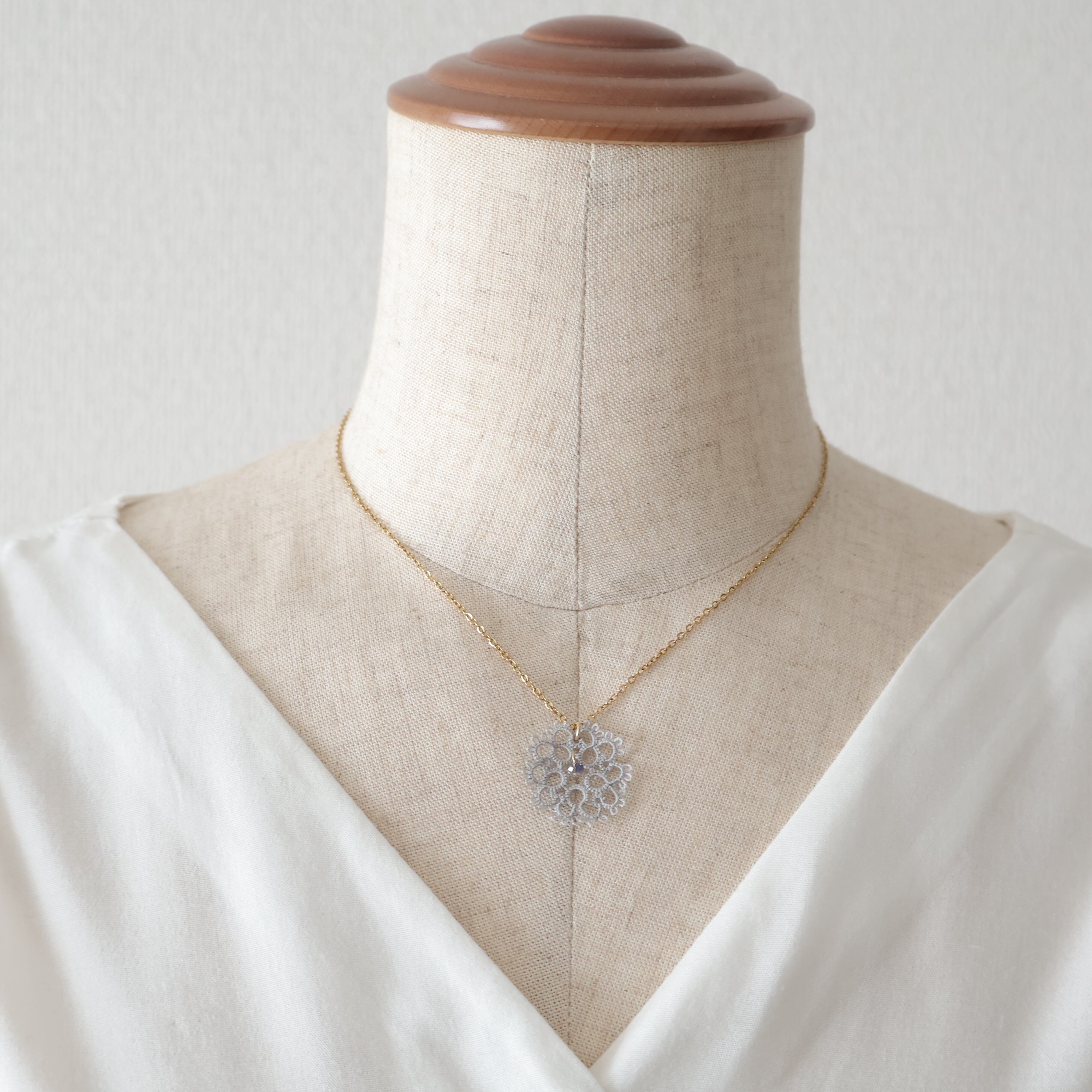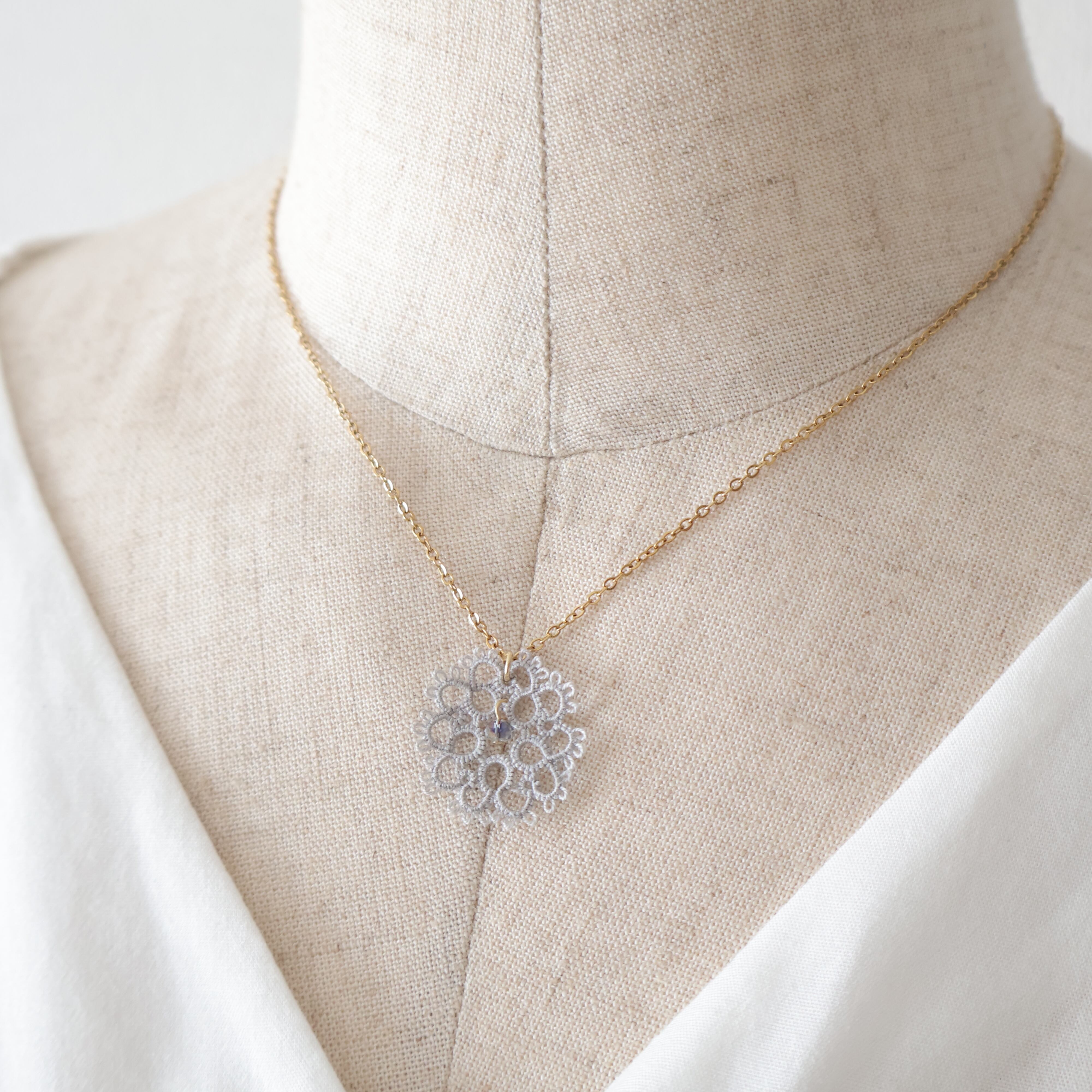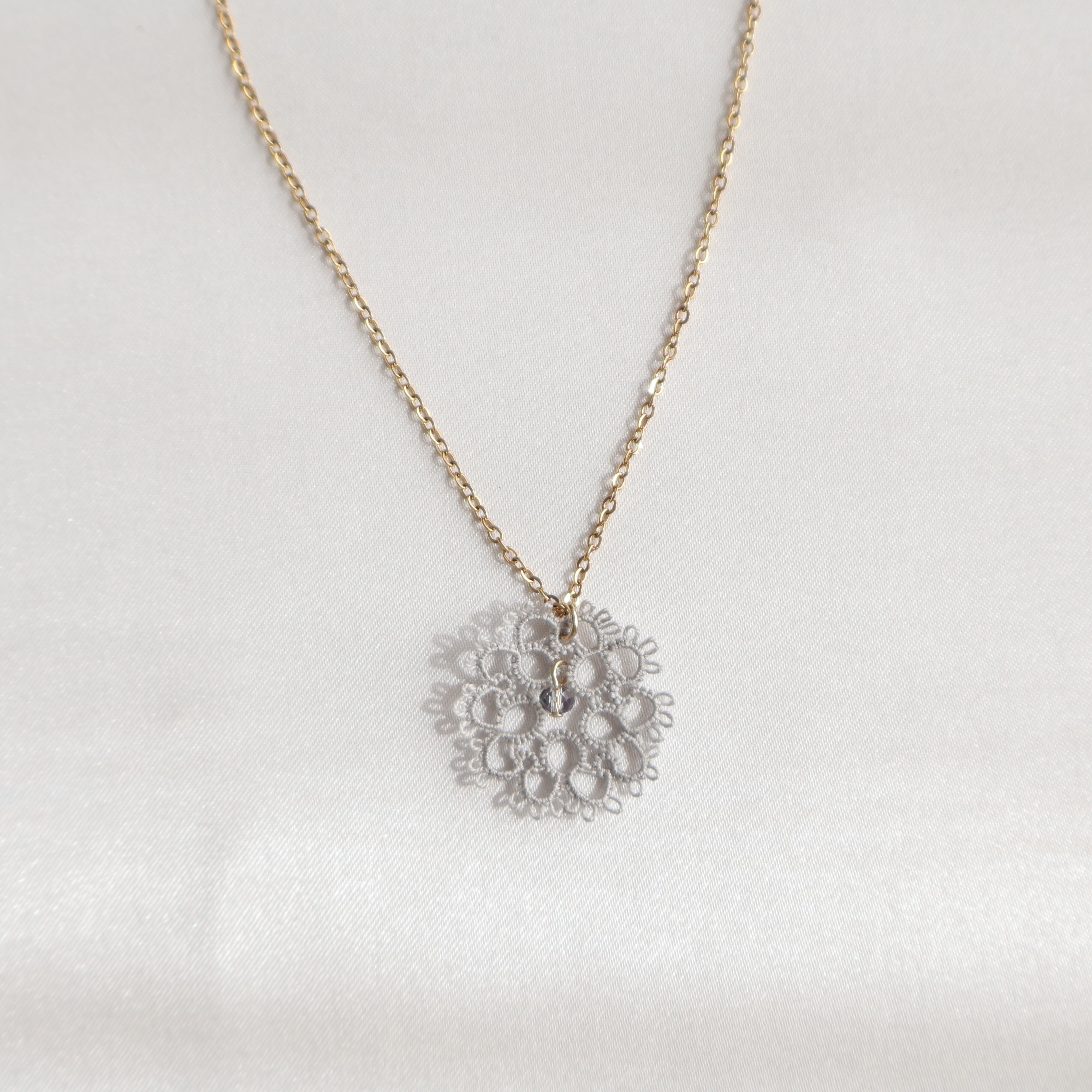 繊細で美しいタティングレースのモチーフが、首元を華やかに彩ります