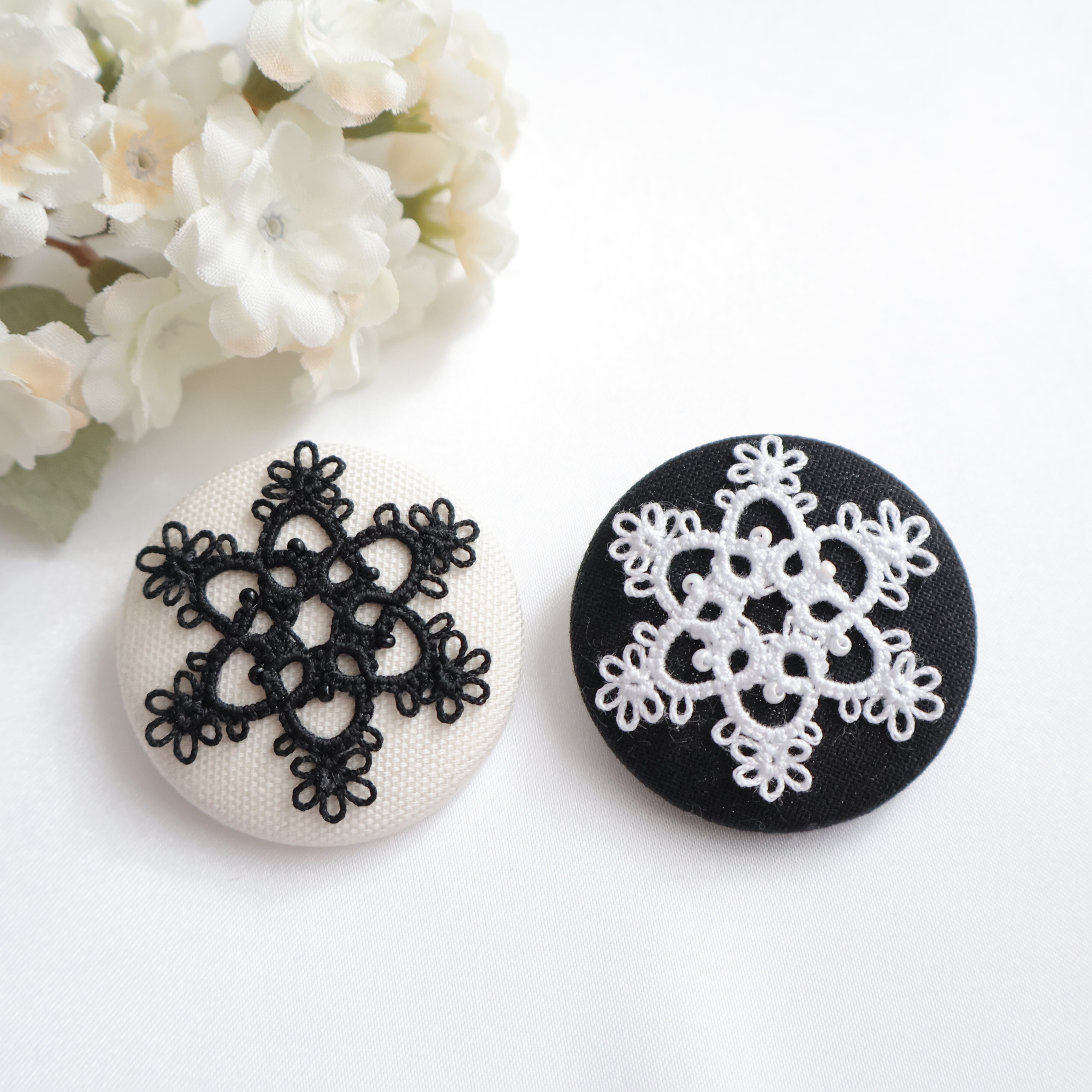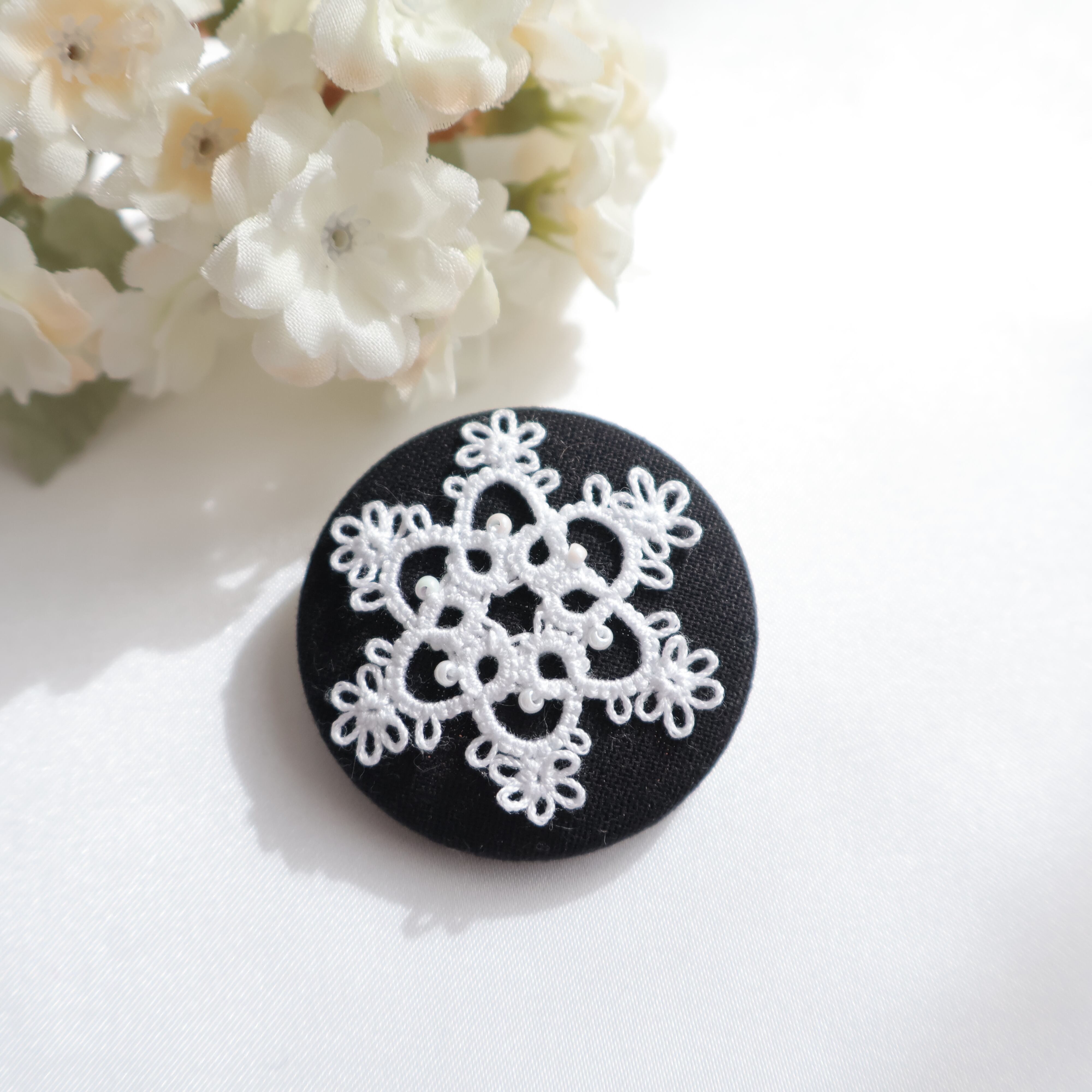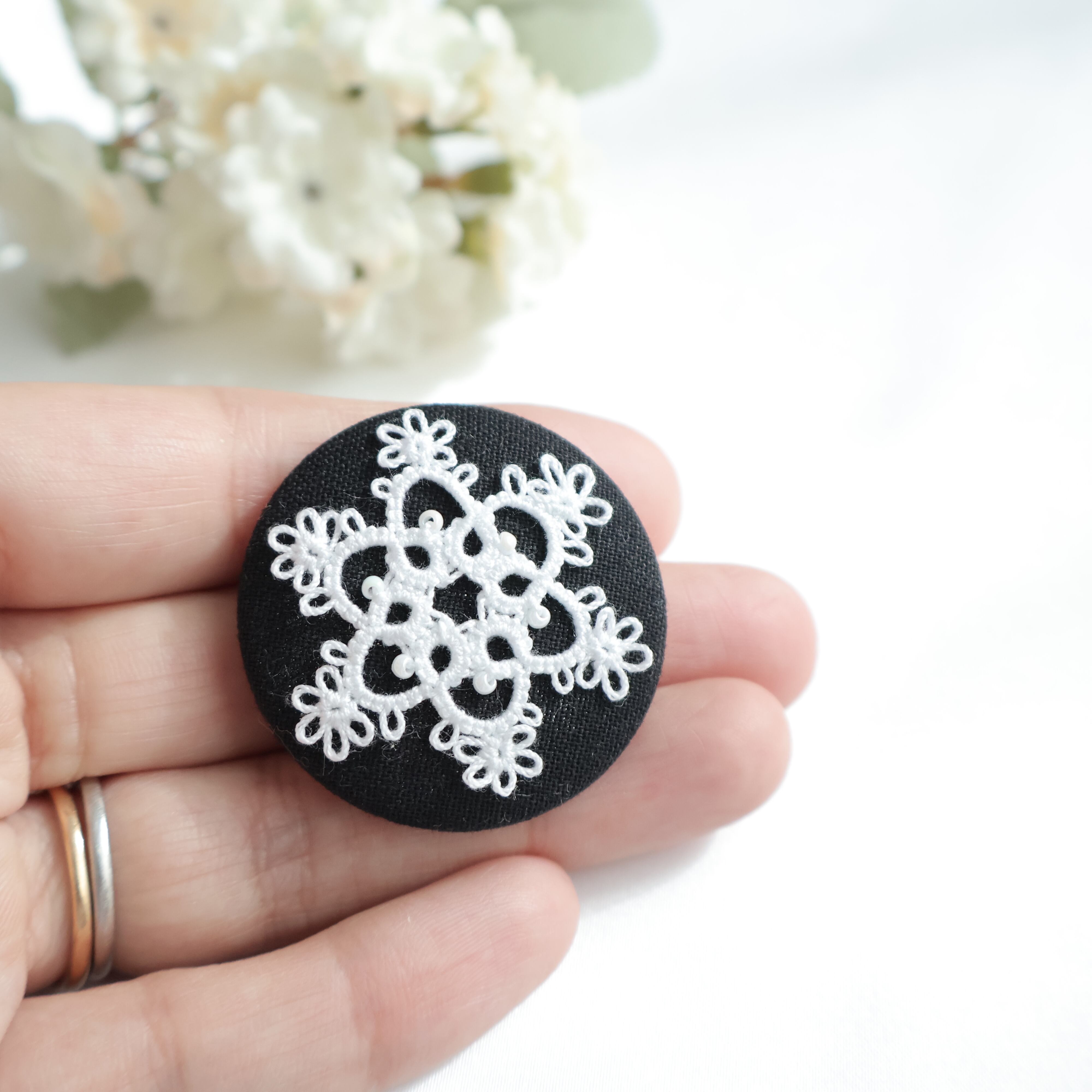 手編みしたタティングレースの雪の結晶モチーフをくるみボタンブローチに仕立てました