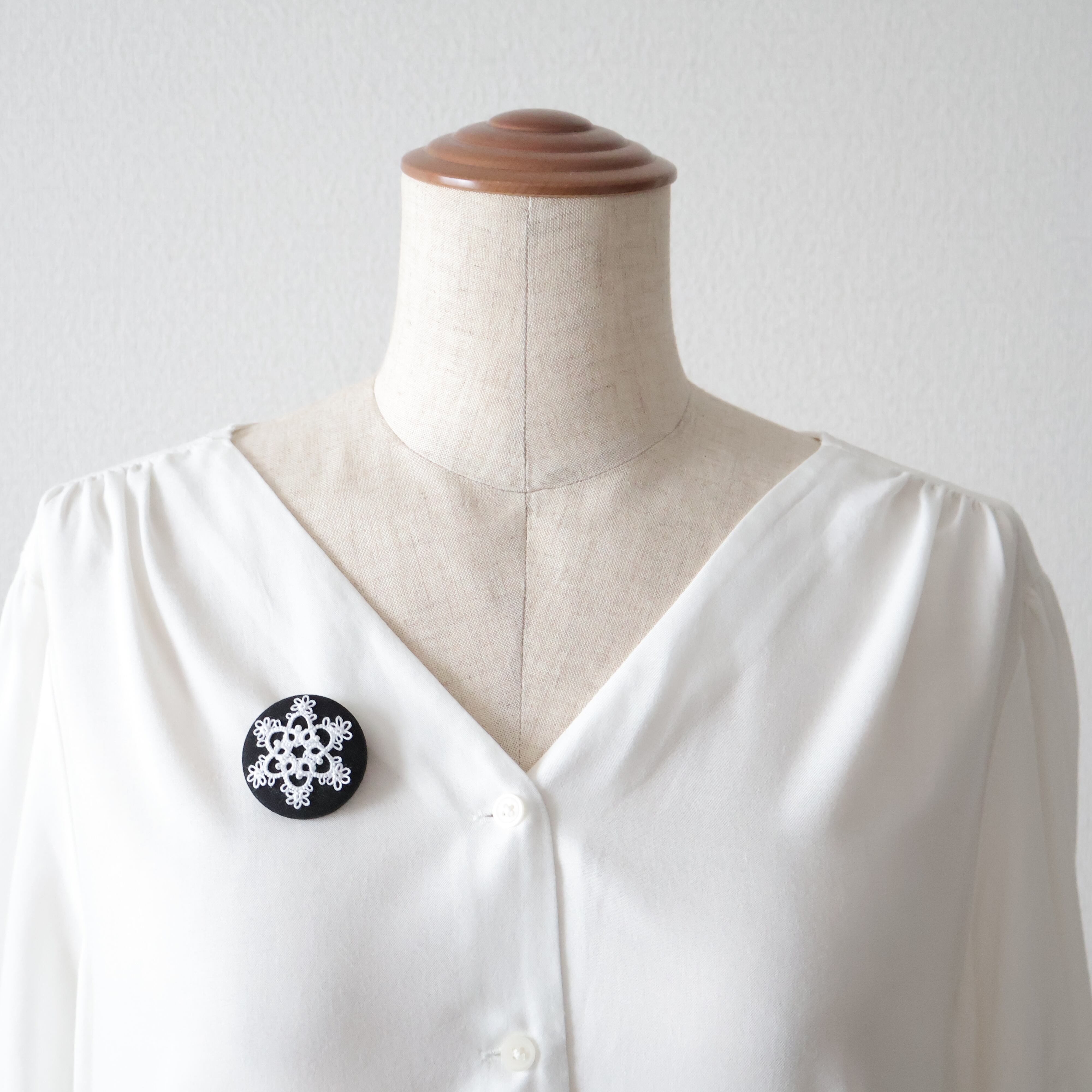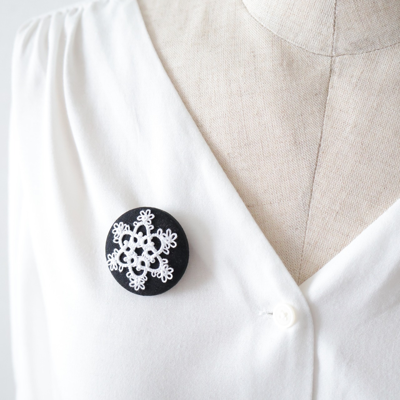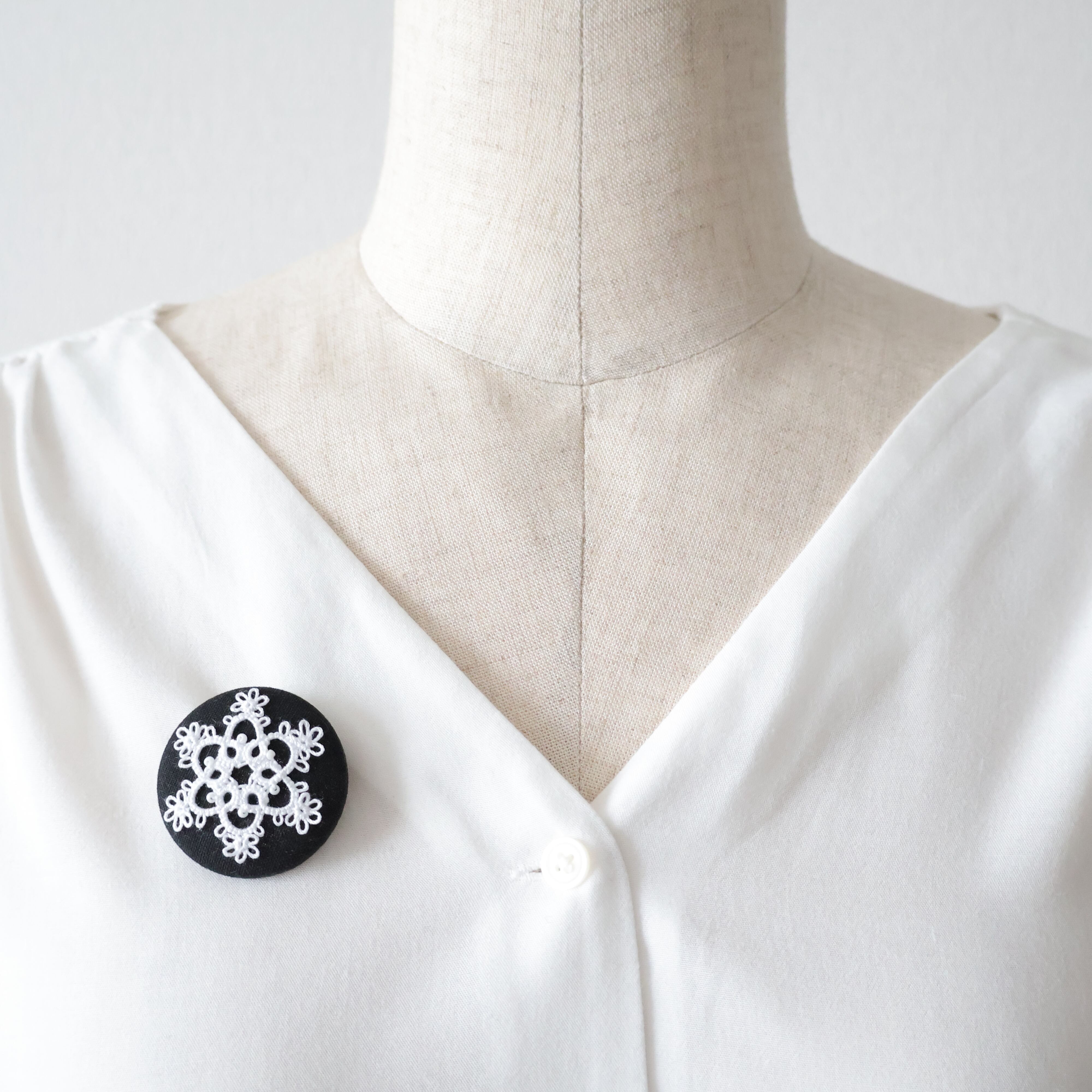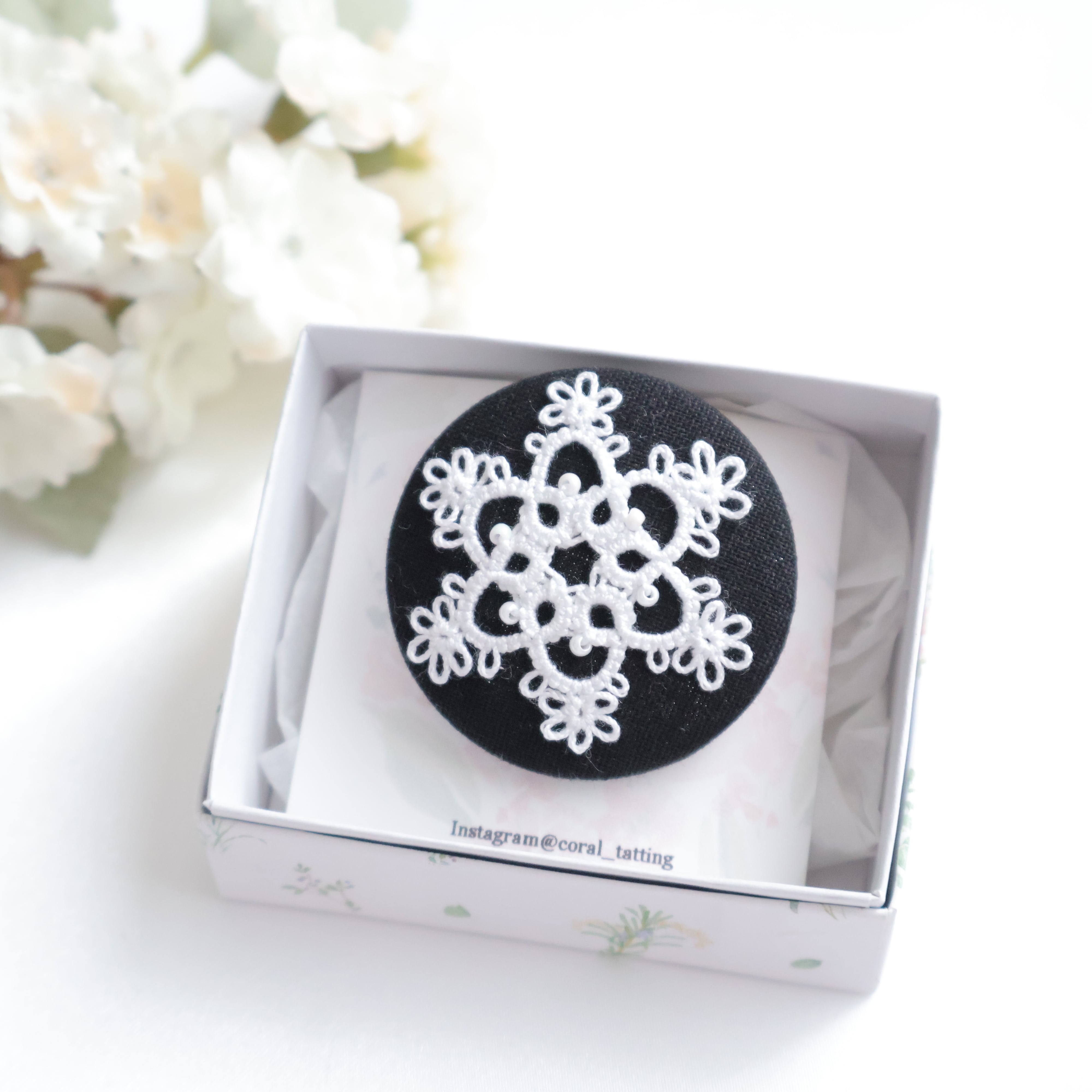 手編みしたタティングレースの雪の結晶モチーフをくるみボタンブローチに仕立てました